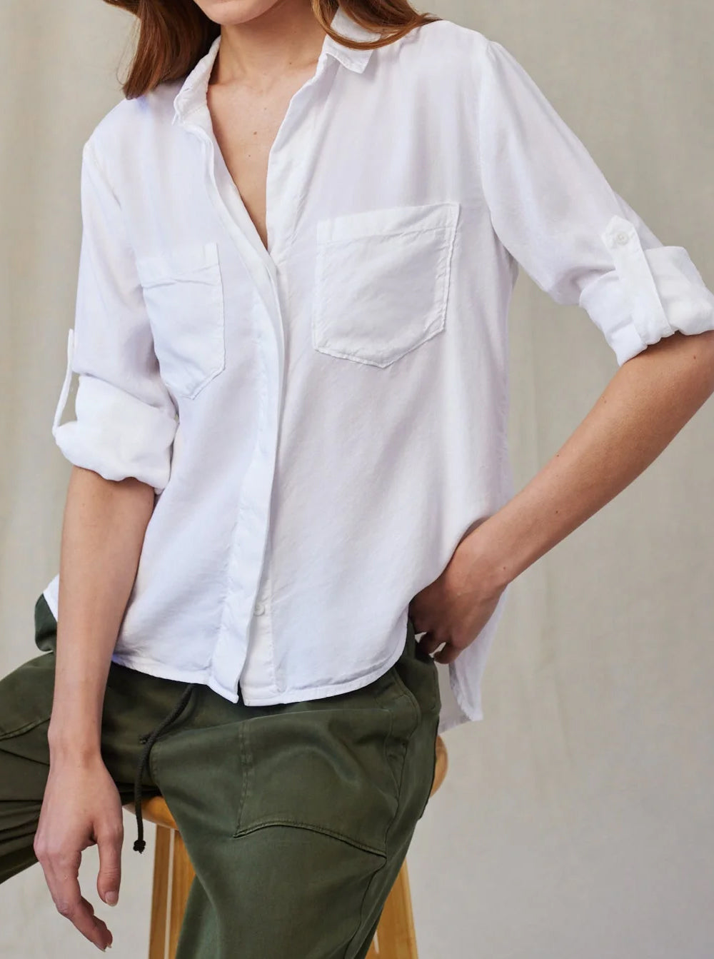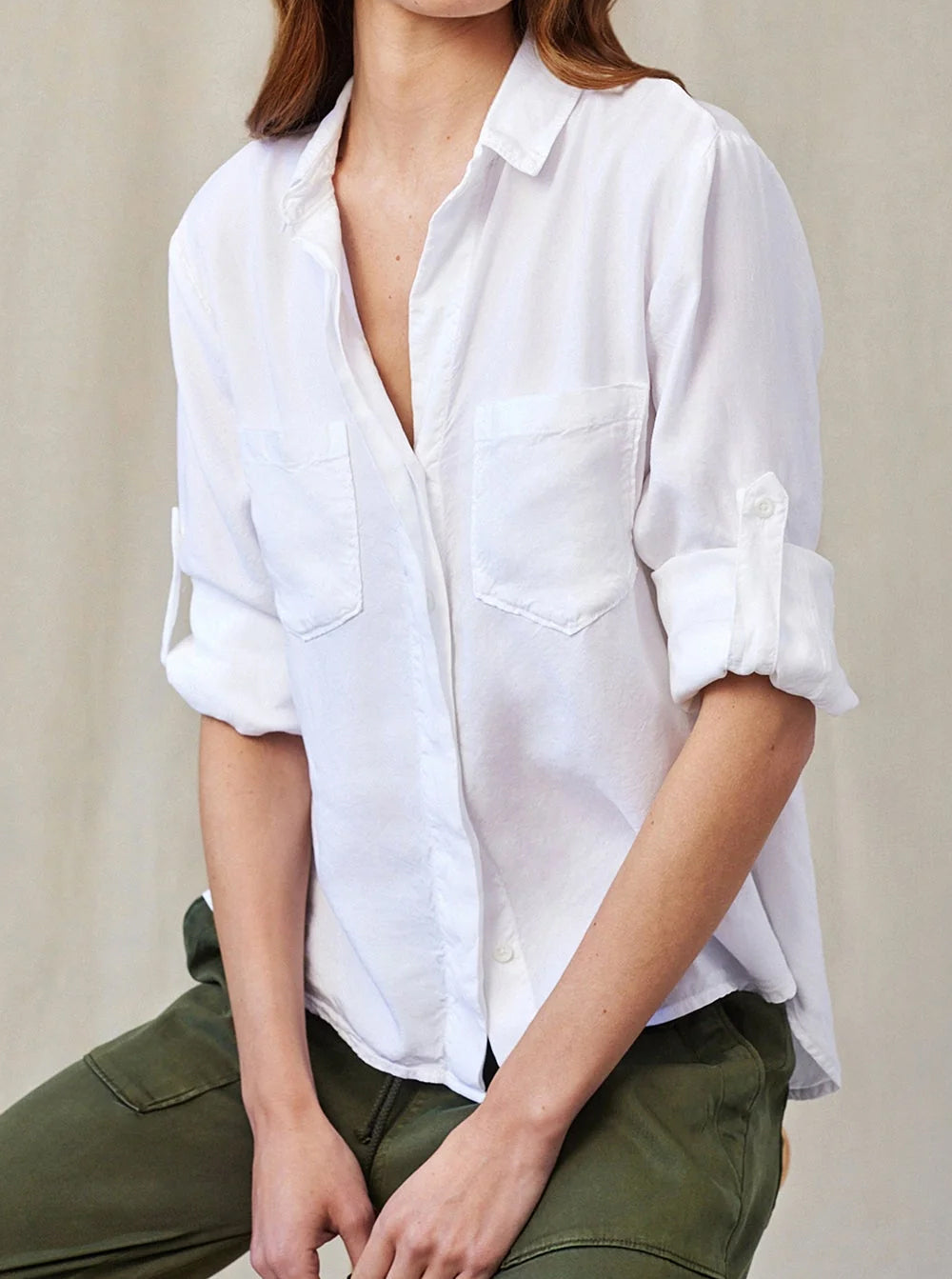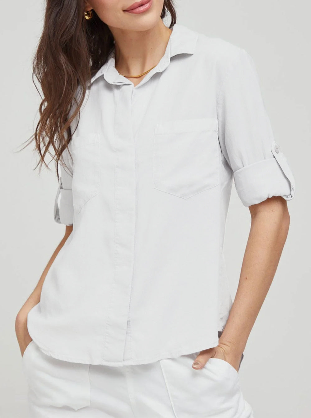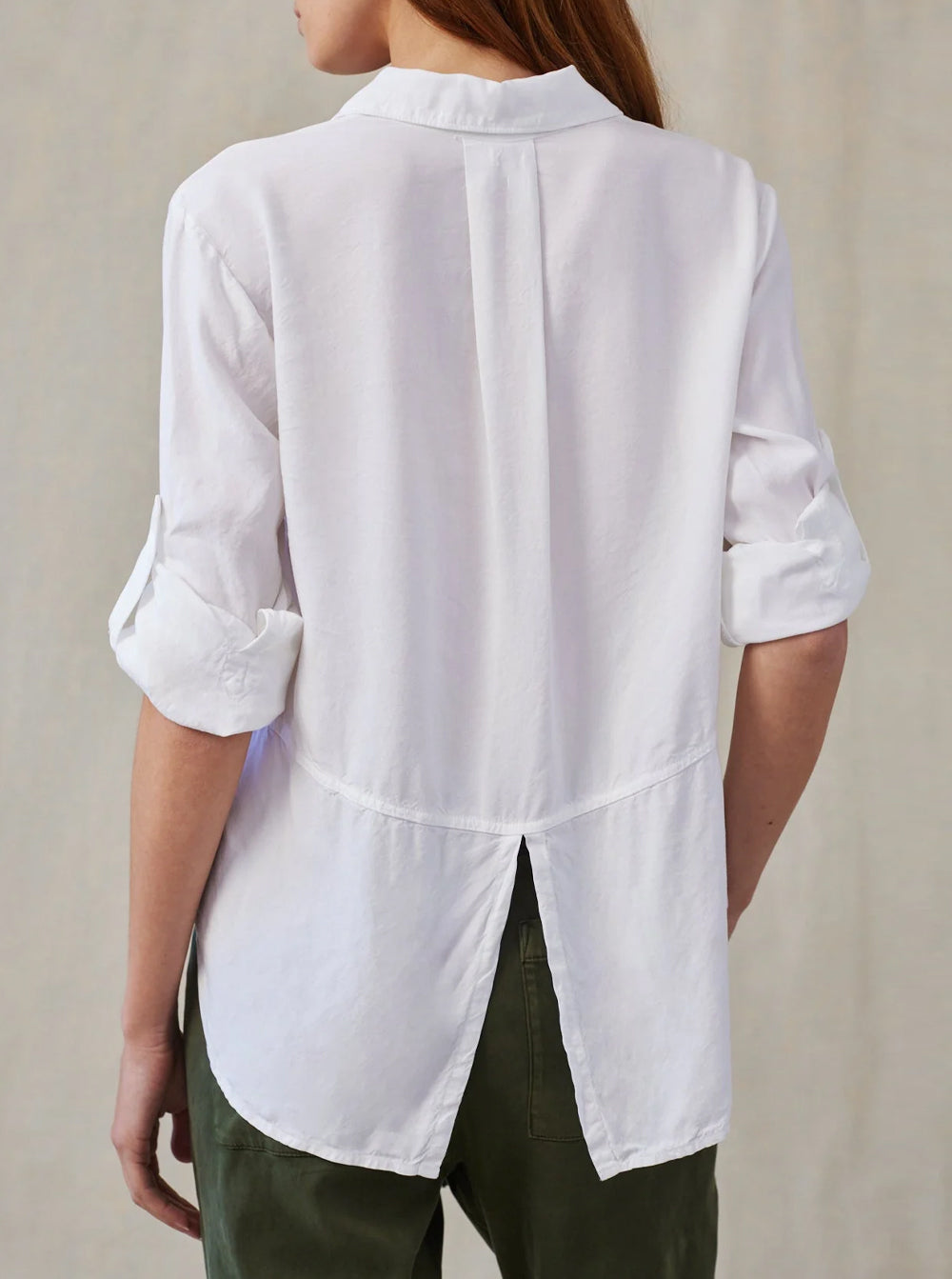 The Split Back Button Down is a signature favorite designed with front buttons, two chest pockets, roll tab sleeves, and a split back detail.