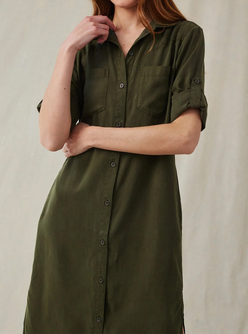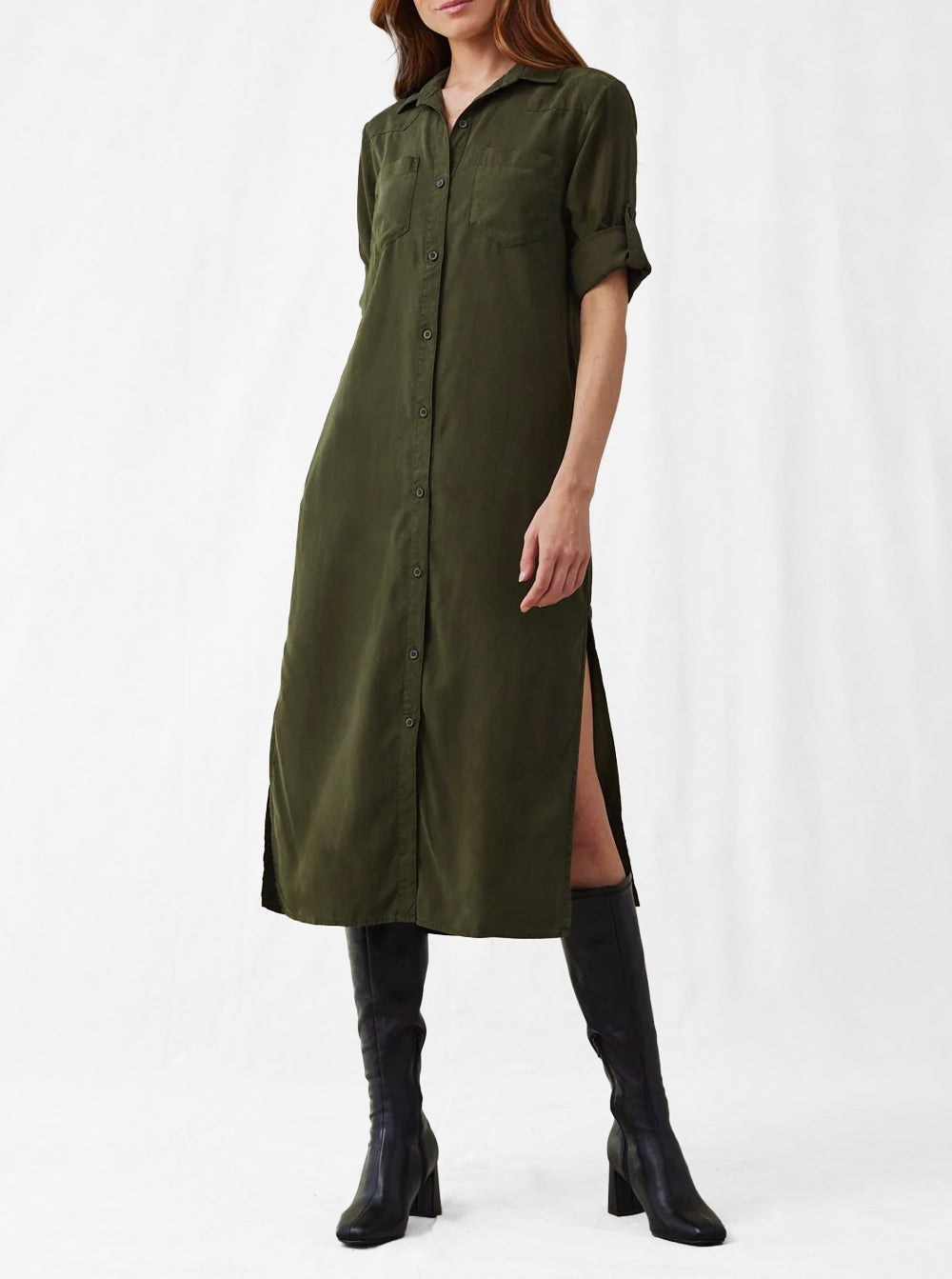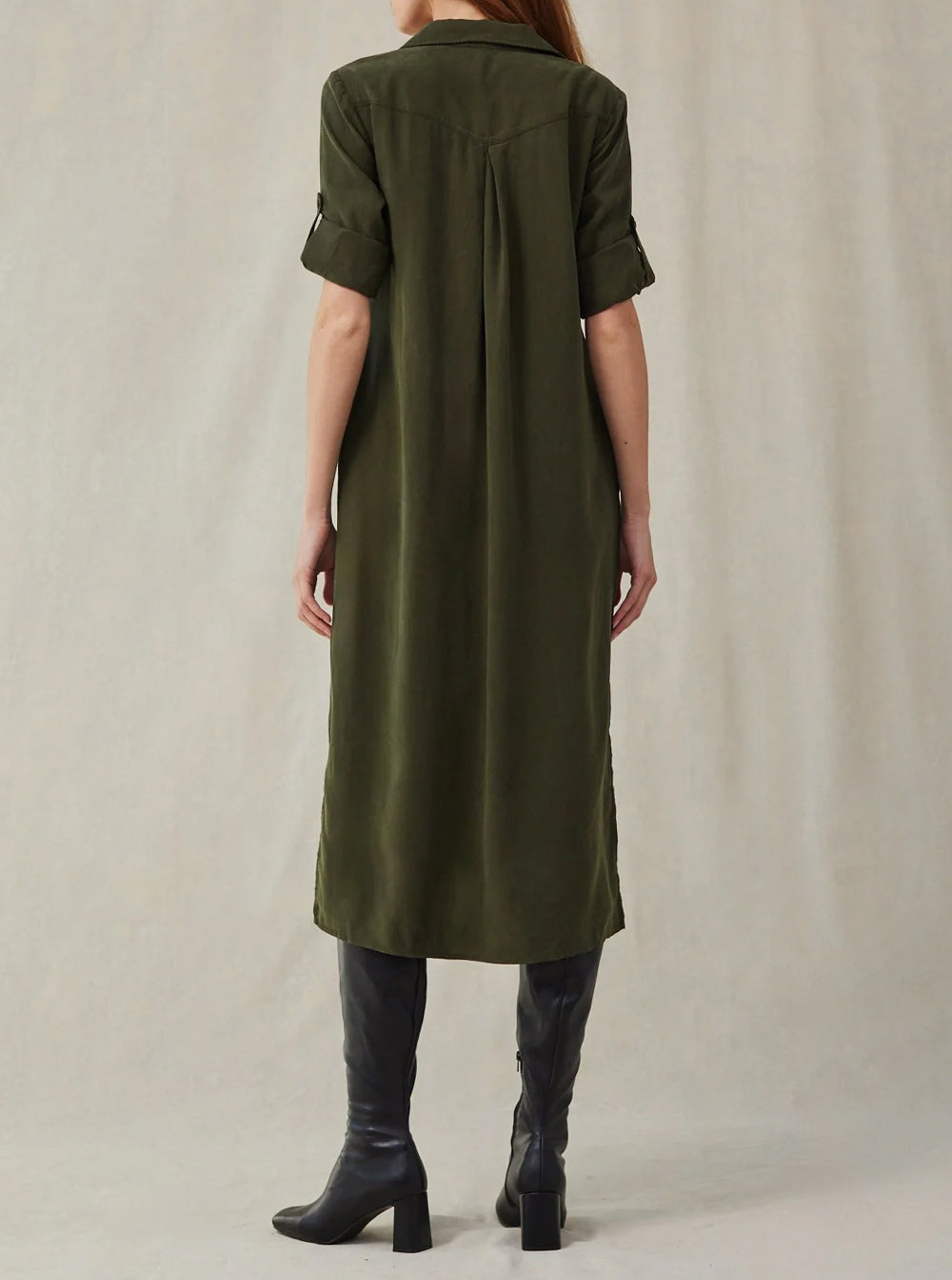 Elevate your wardrobe with Bella Dahl's Western Yoke Duster Dress featuring a western yoke design and side slits for a modern twist on a classic silhouette.