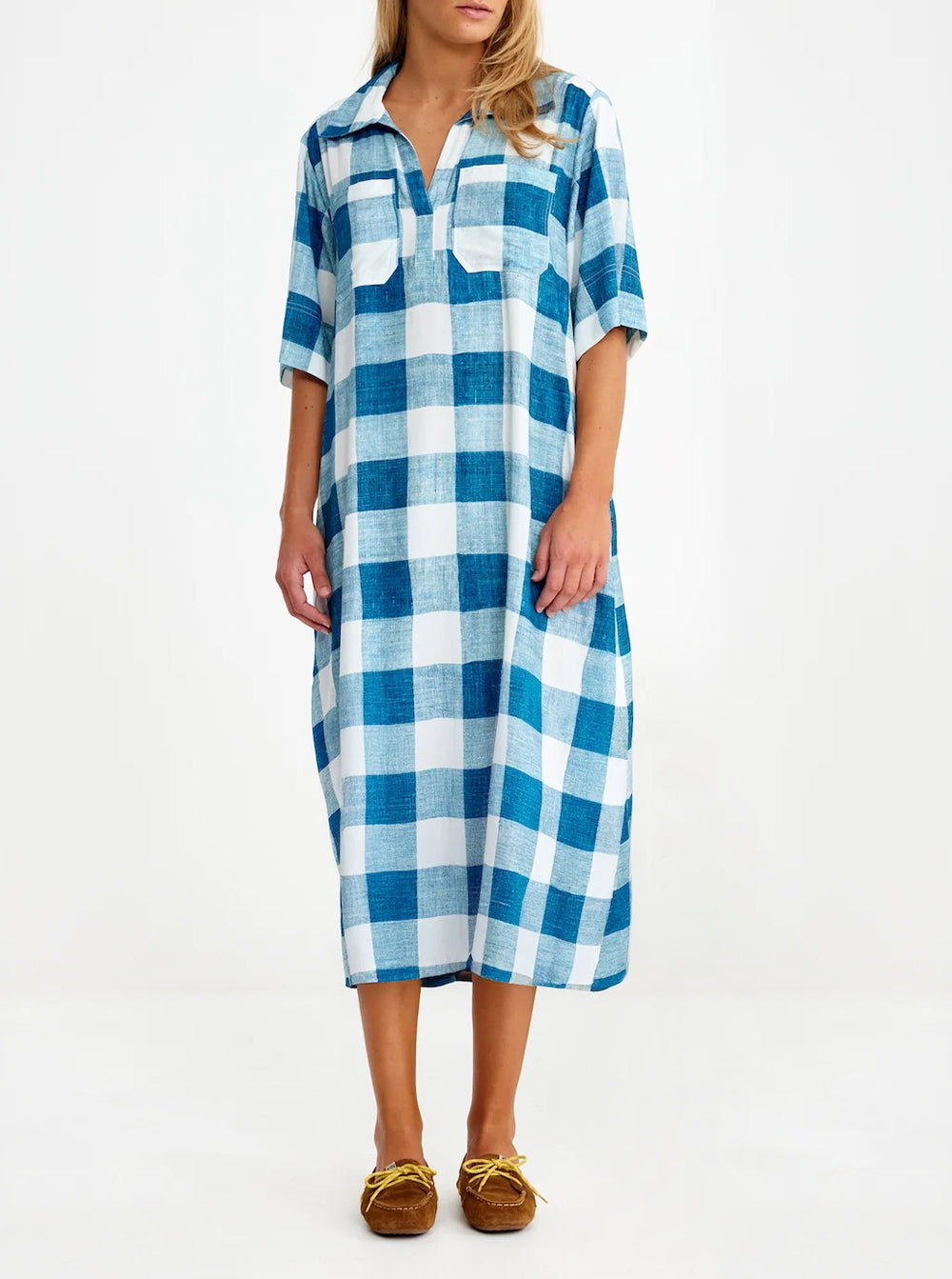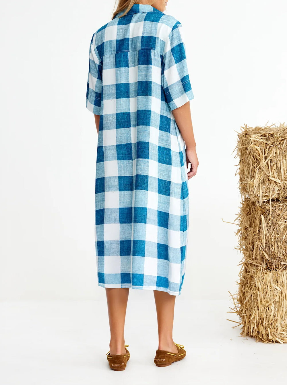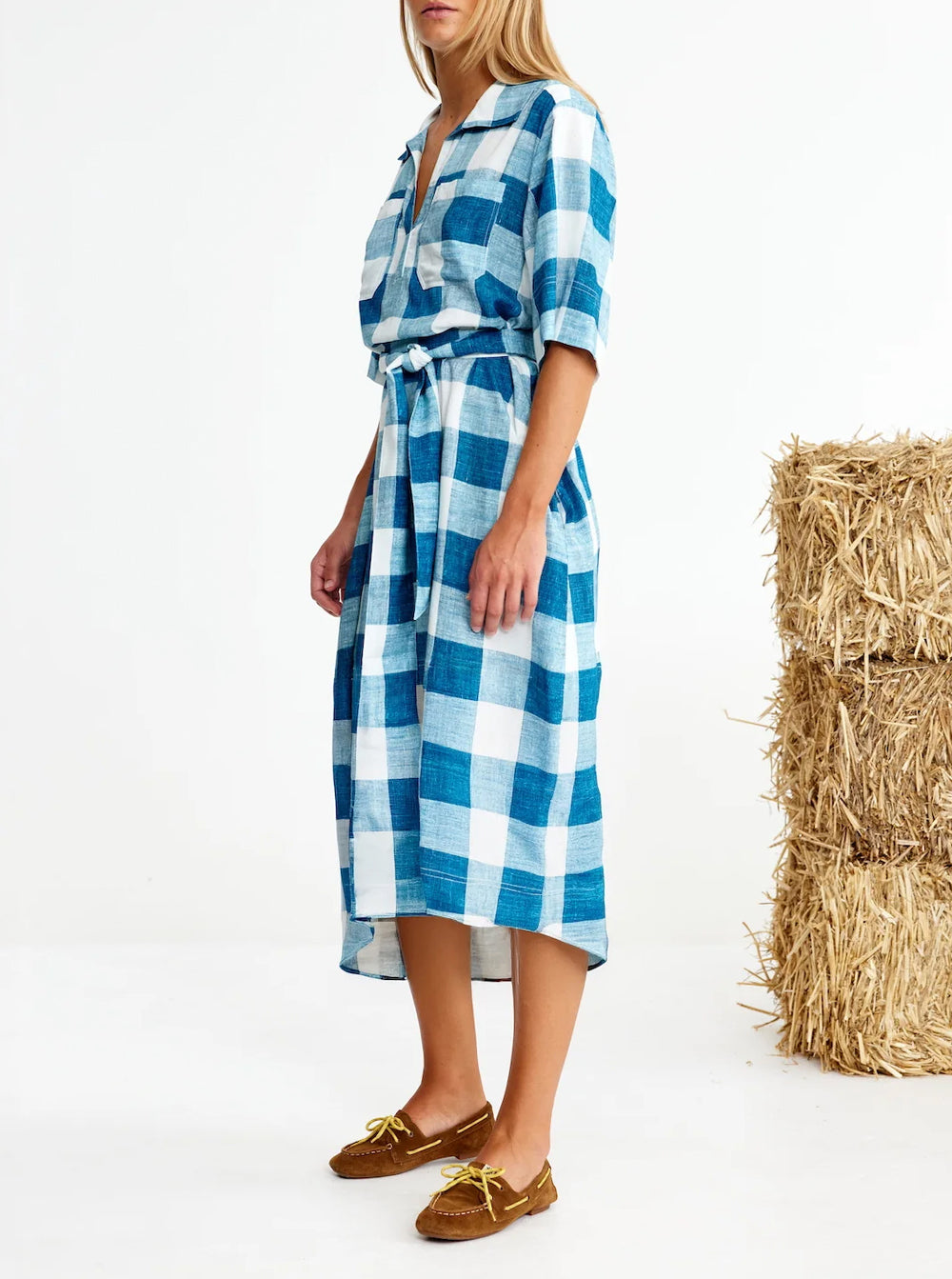 Made with breezy big blue check EcoVero viscose for busy weekend energy. Complete with a shirt-tail hem and tie-waist reins, you'll trot from stable brunch to supermarket to cricket to school drop off.