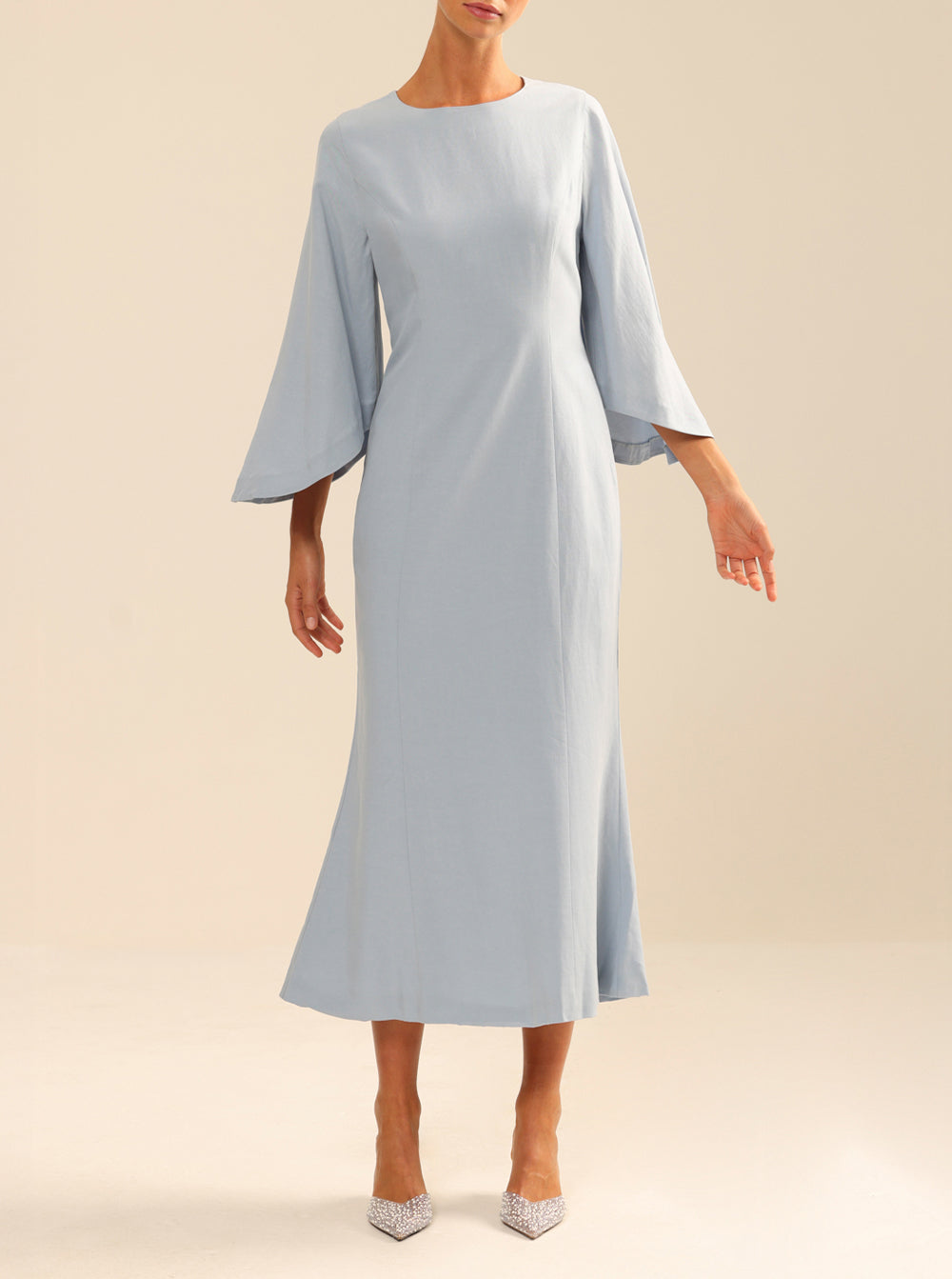 This semi-fitted midi is cut from a drapey linen viscose blend, with flared sleeves & a kick out hem that floats as effortlessly as the corks pop. The removable tie lets you cinch for the win or keep it loose as the day wears on. A beautiful figure flattering silhouette. Perfectly primed for sipping, swanning, and staying just a little longer than you planned.