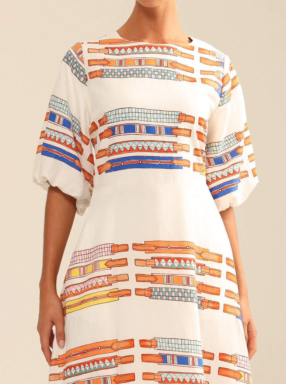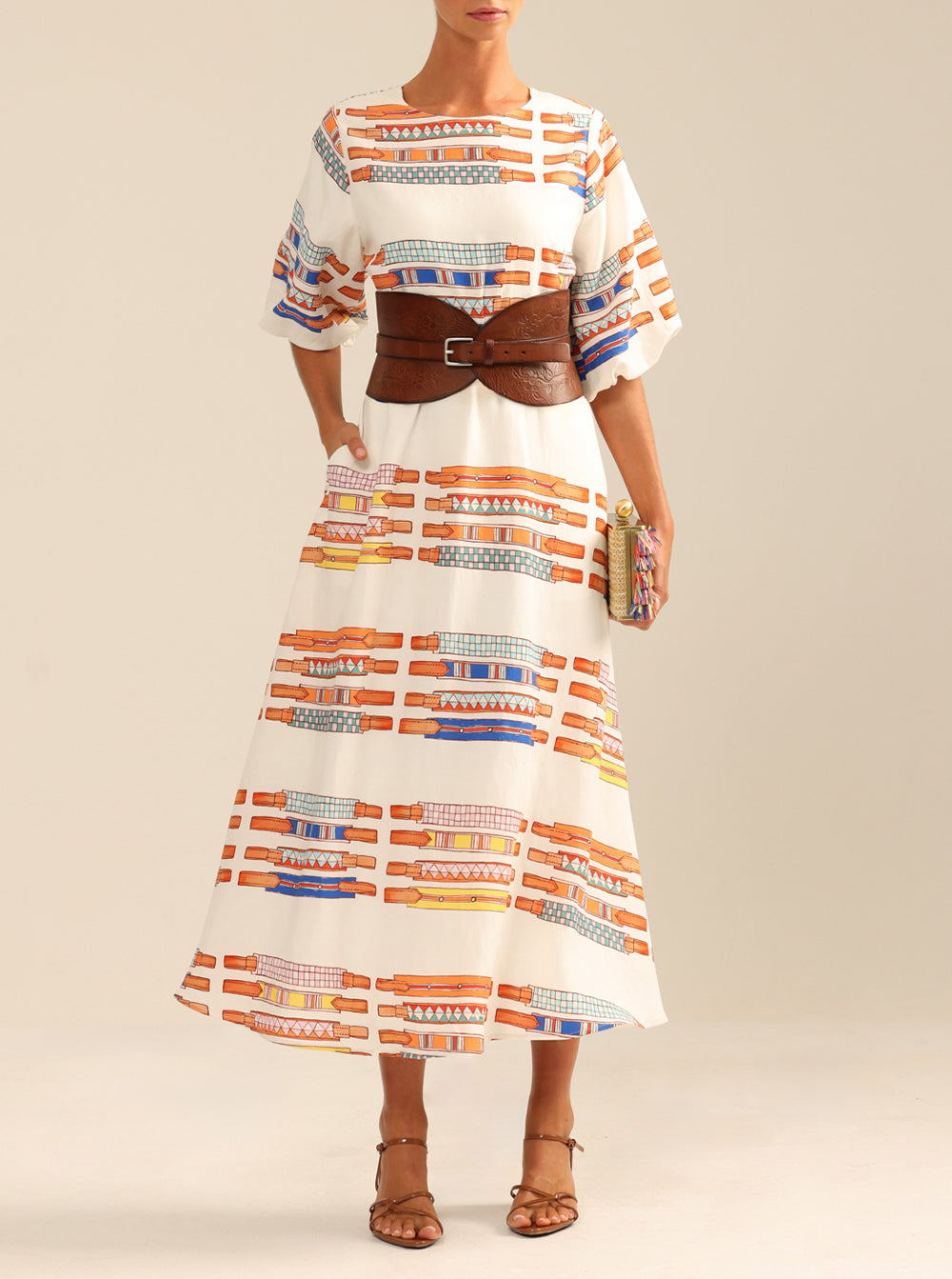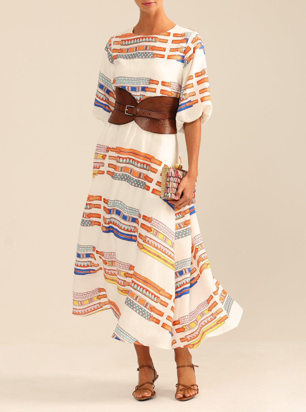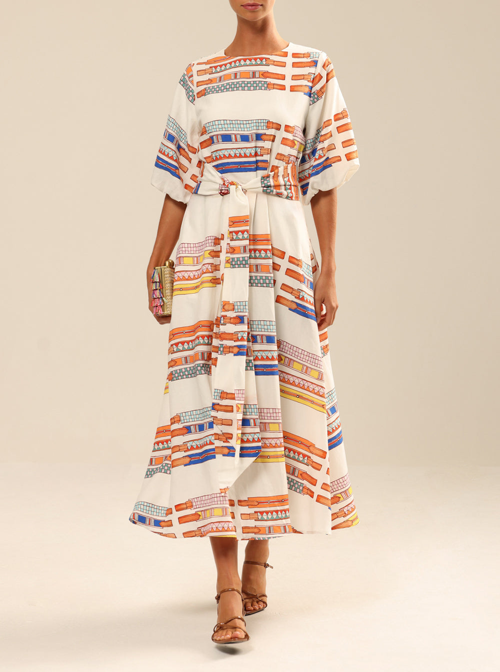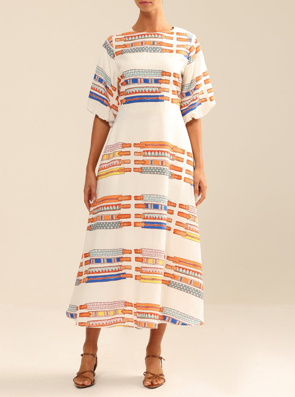There was also nothing in the world that made Binny's horse mad-heart beat faster growing up than plaited ribbon browbands. So the brand handpainted six of them beautifully onto to this perfectly cut midi dress. Cut in a beautiful silky viscose linen blend, with gently puffed sleeves.