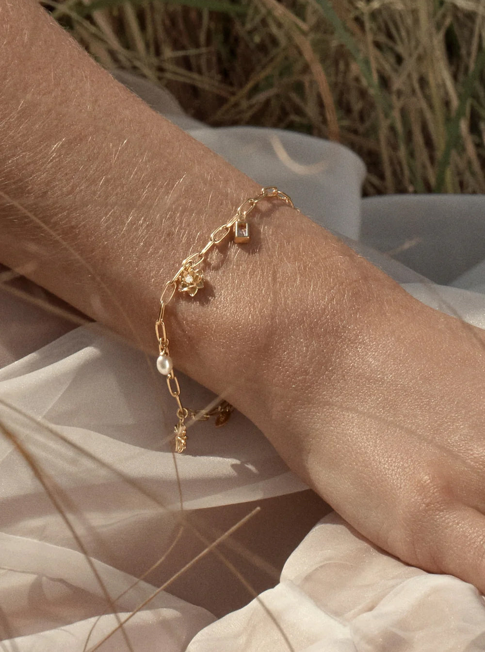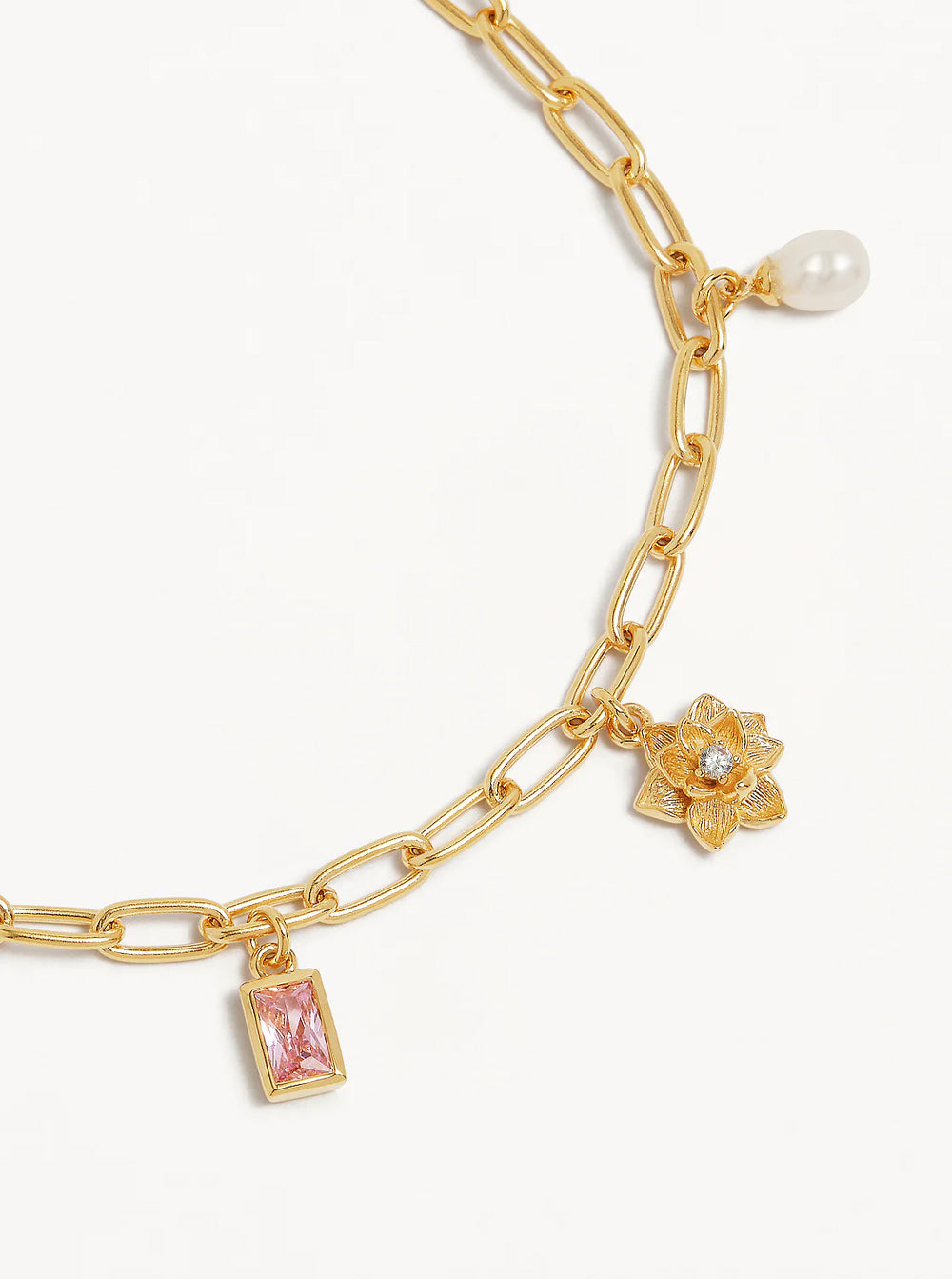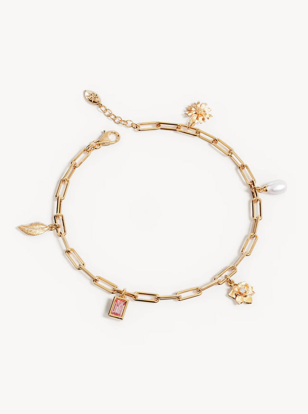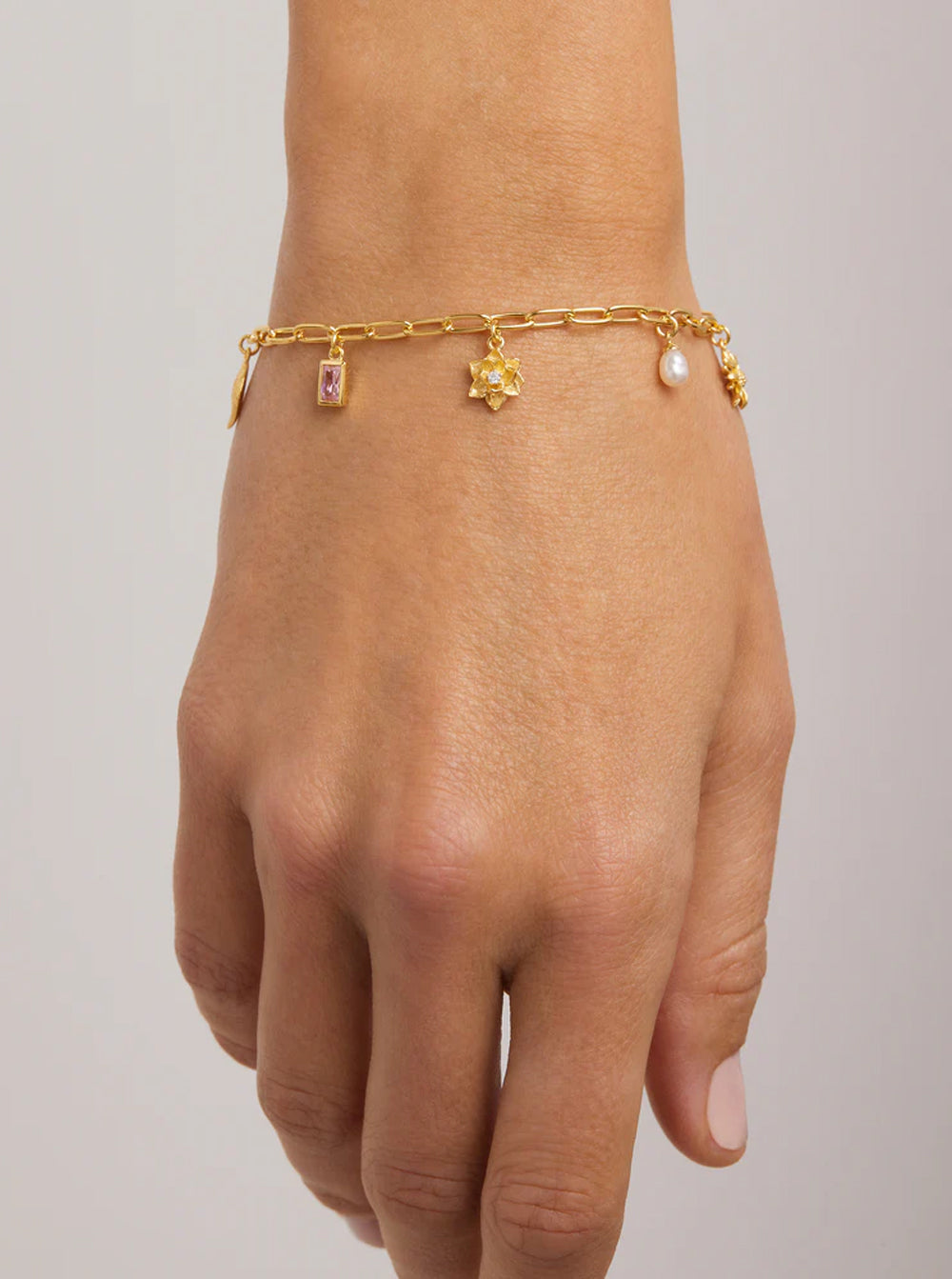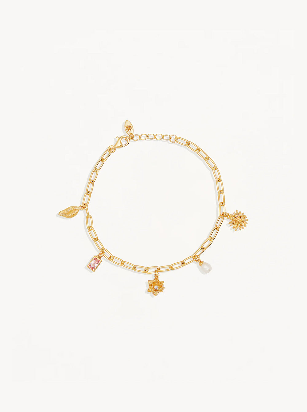 - Multi-charm bracelet featuring a pink crystal, leaf, daisy and lotus flower pendants, and a natural freshwater pearl