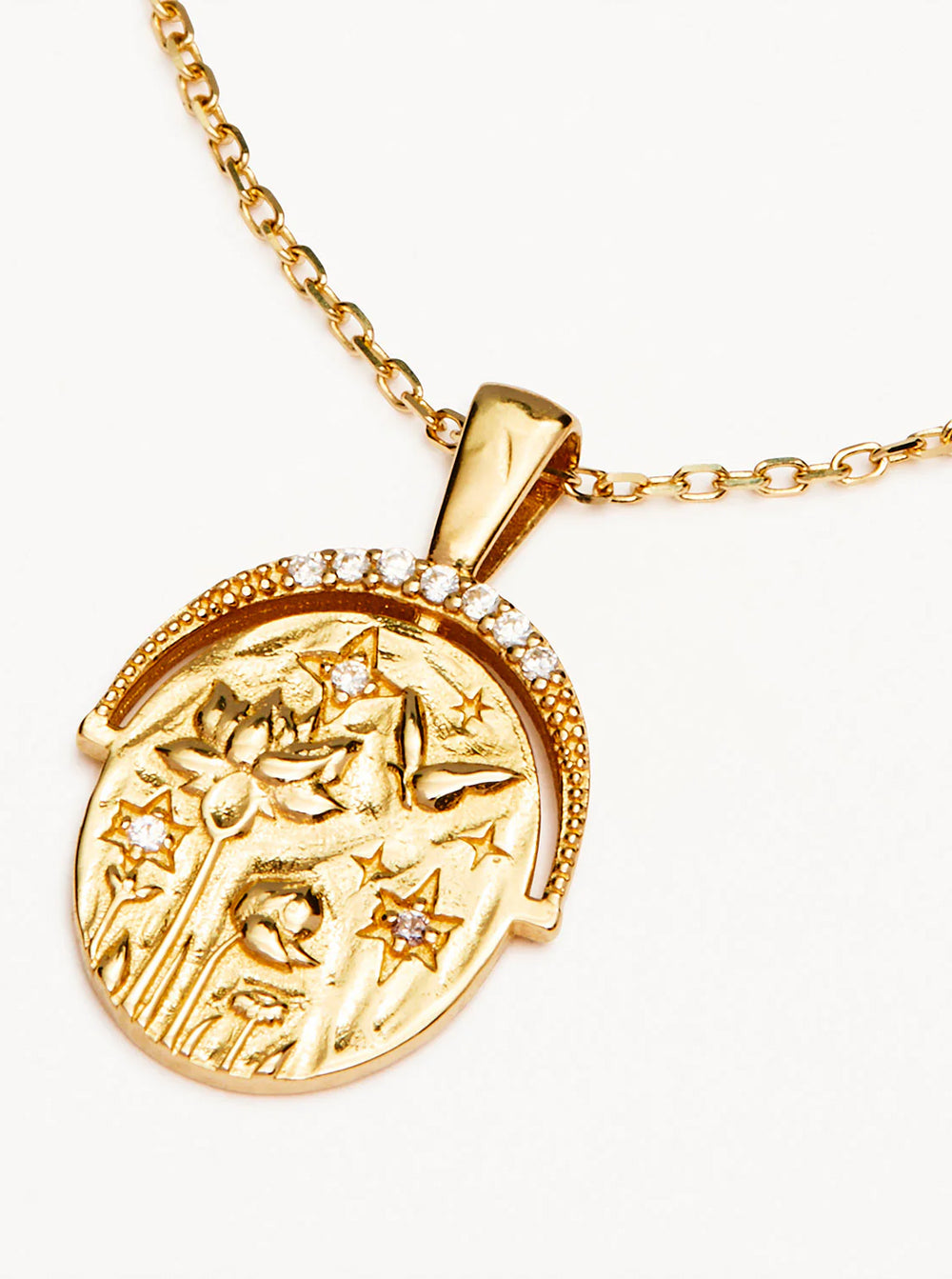 This adjustable oval pendant necklace features a butterfly dancing through a lotus flower garden under the stars, symbolic of freedom, discovery and self-acceptance.
