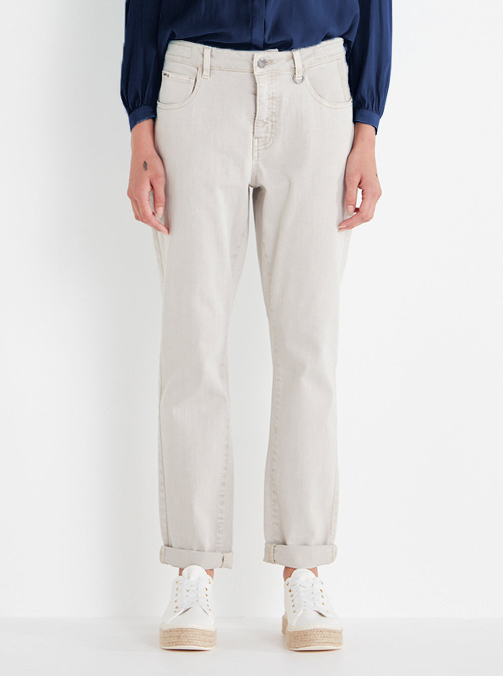 VERGE's ever popular boyfriend jean in Almond with tonal embroidery stich down the side of the leg.