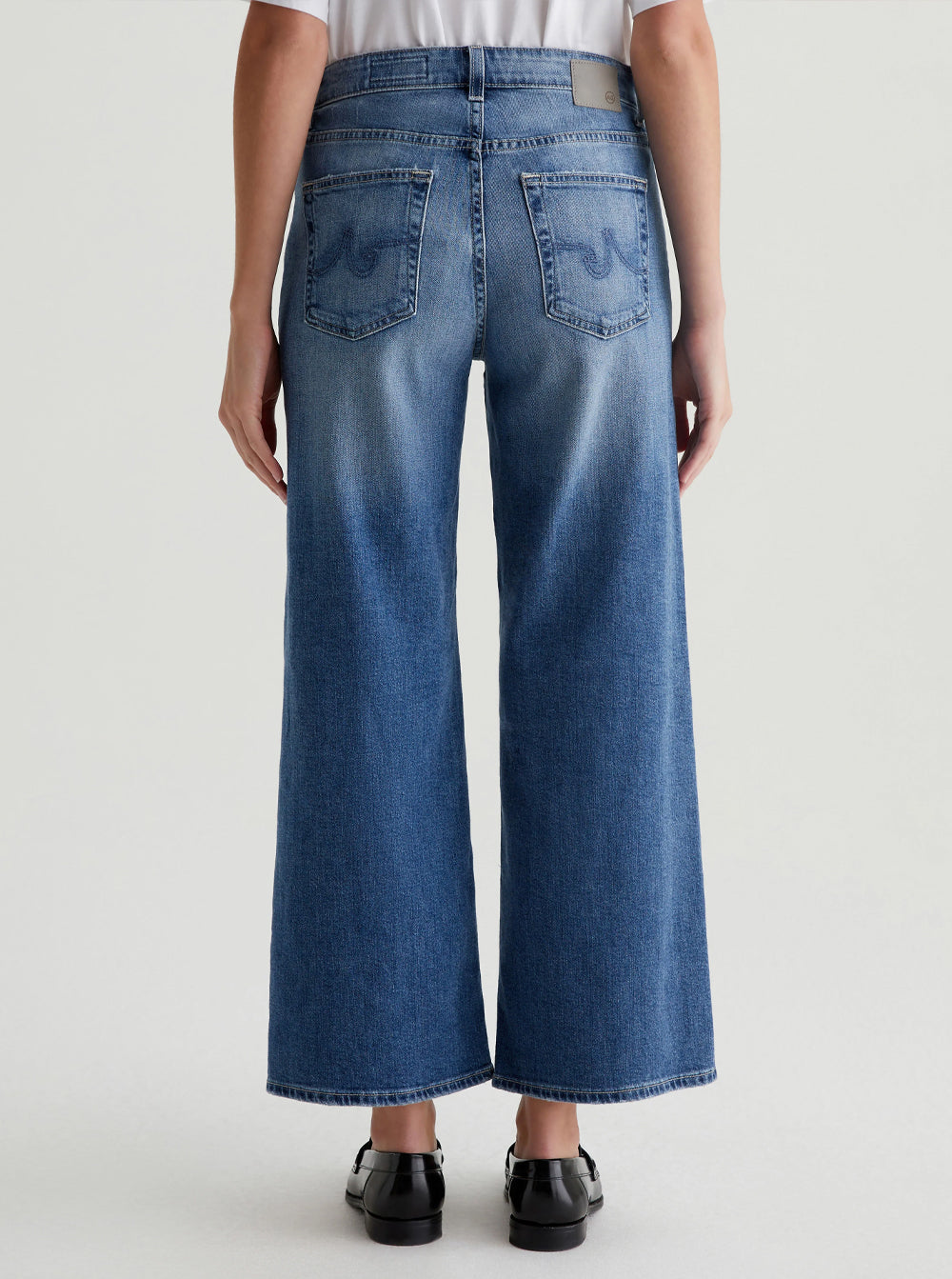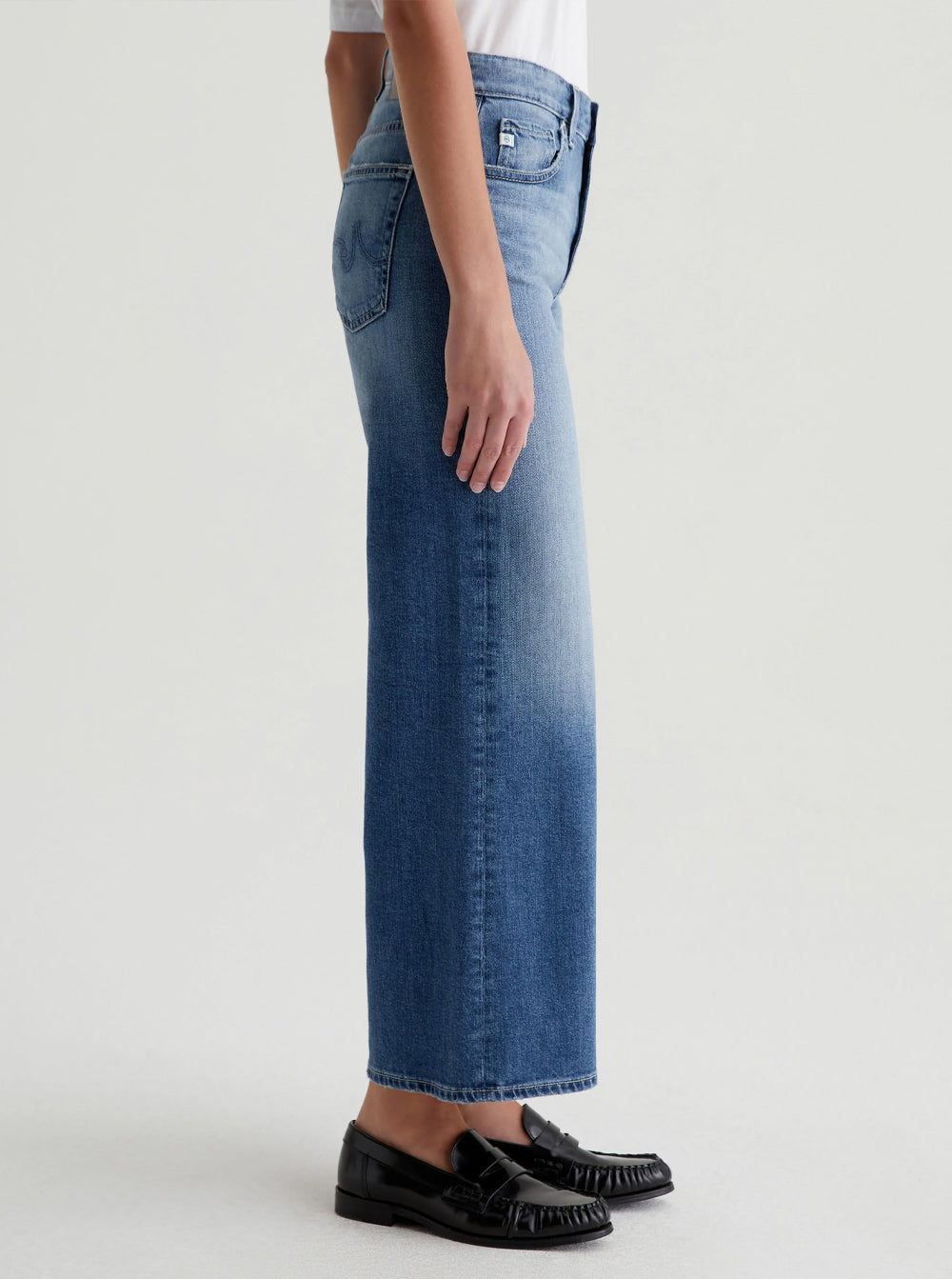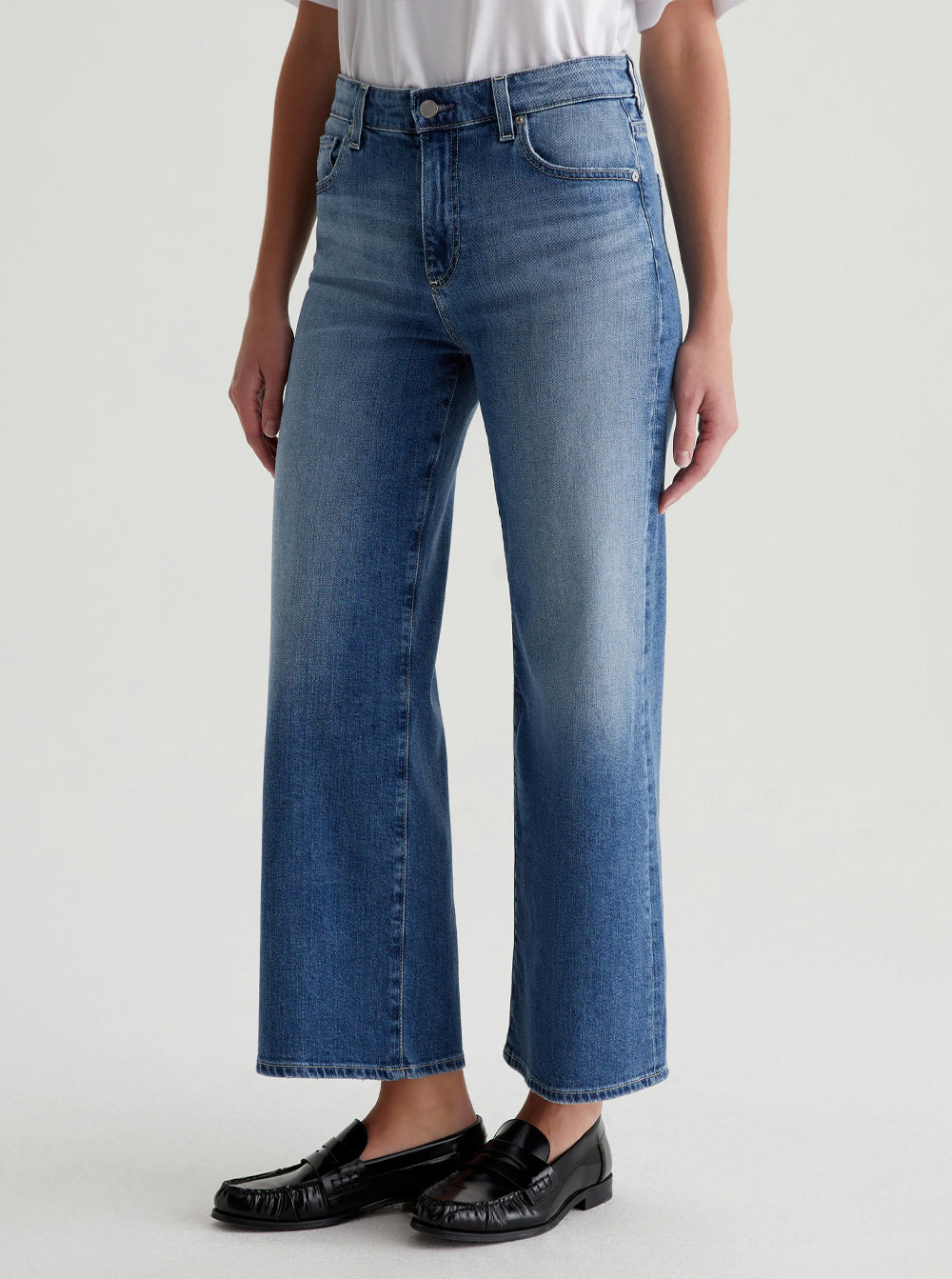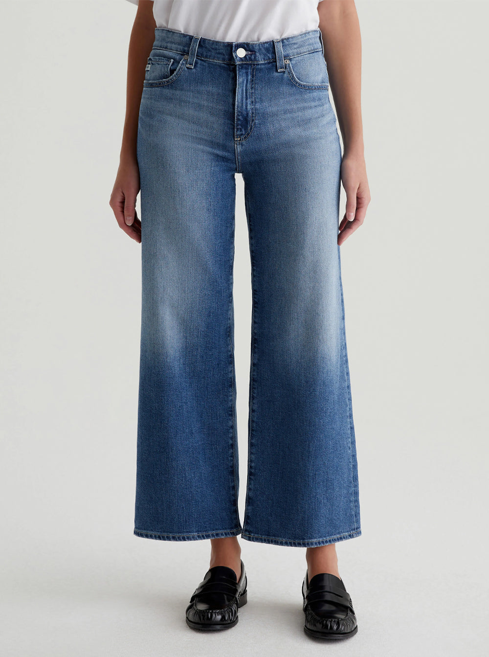 The Saige Wide Leg Crop features a mid-rise waist and loose, cropped legs with worn hems.