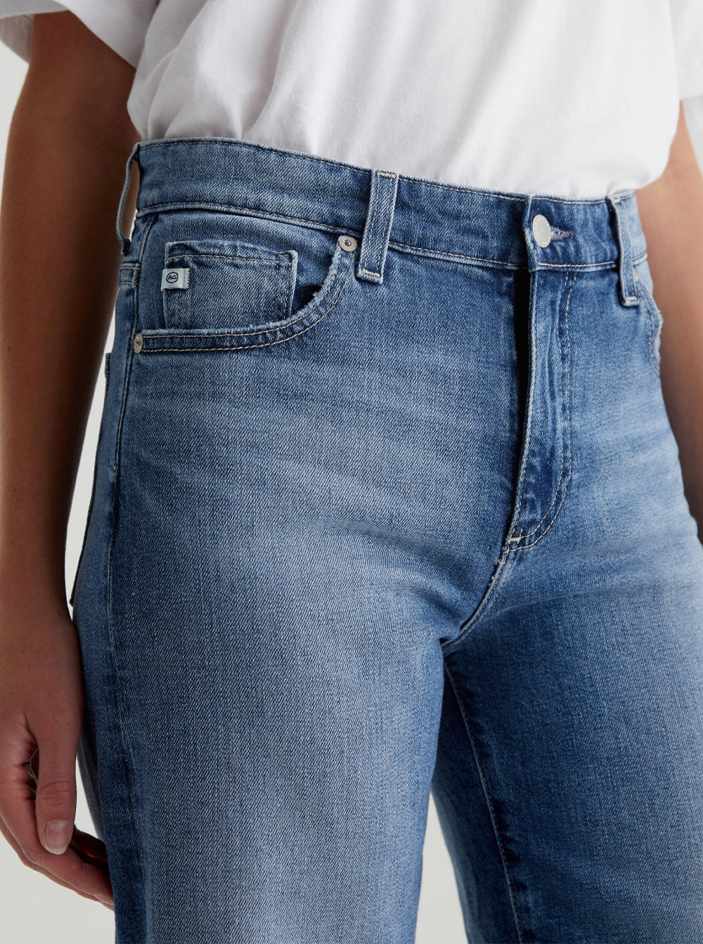 Contrast stitching and slightly worn edges finish the five-pocket style.