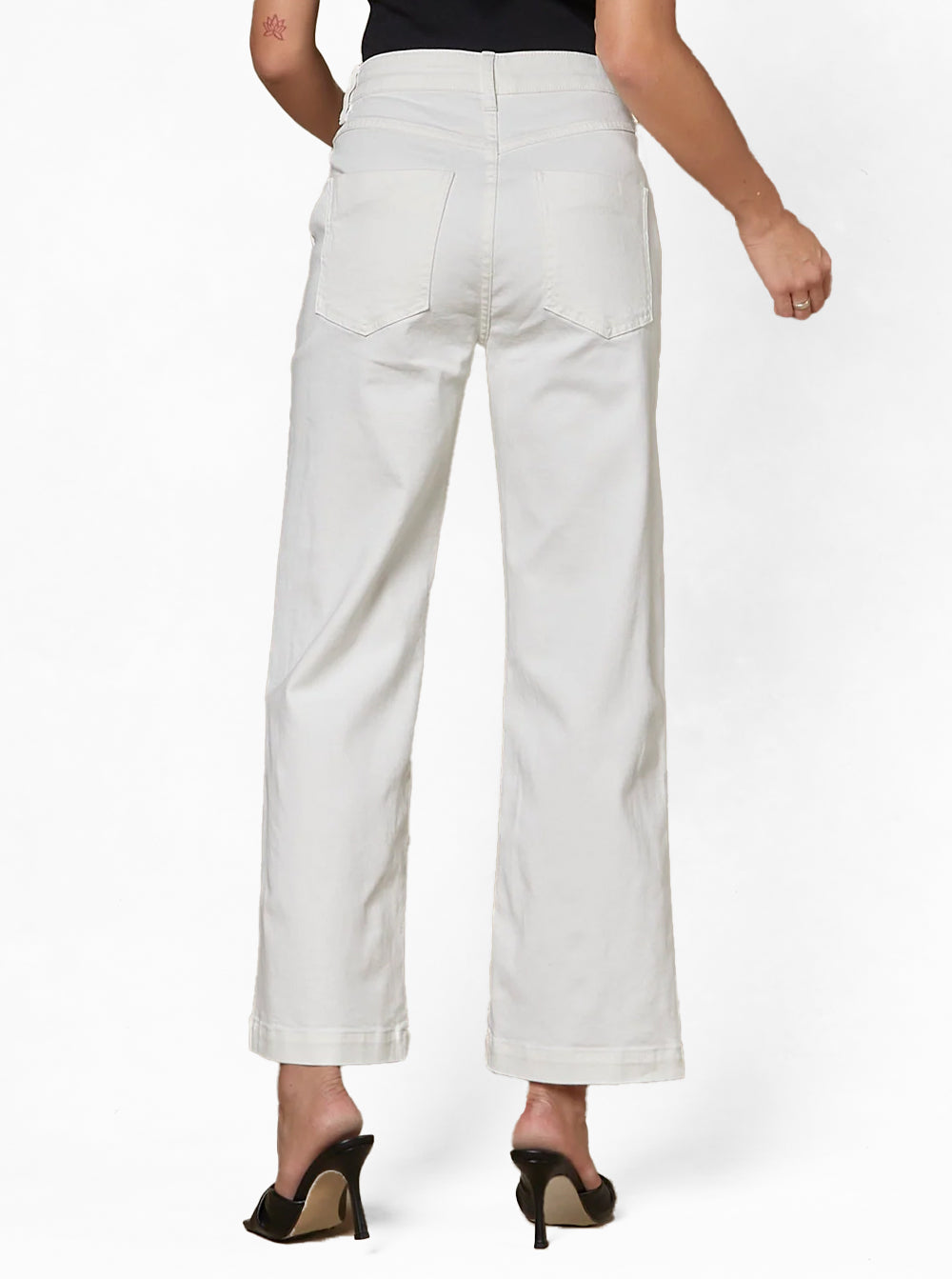 These are cut from stretch denim with slanted pockets in a smooth Ivory colour and beautifully styled with a fitted top.