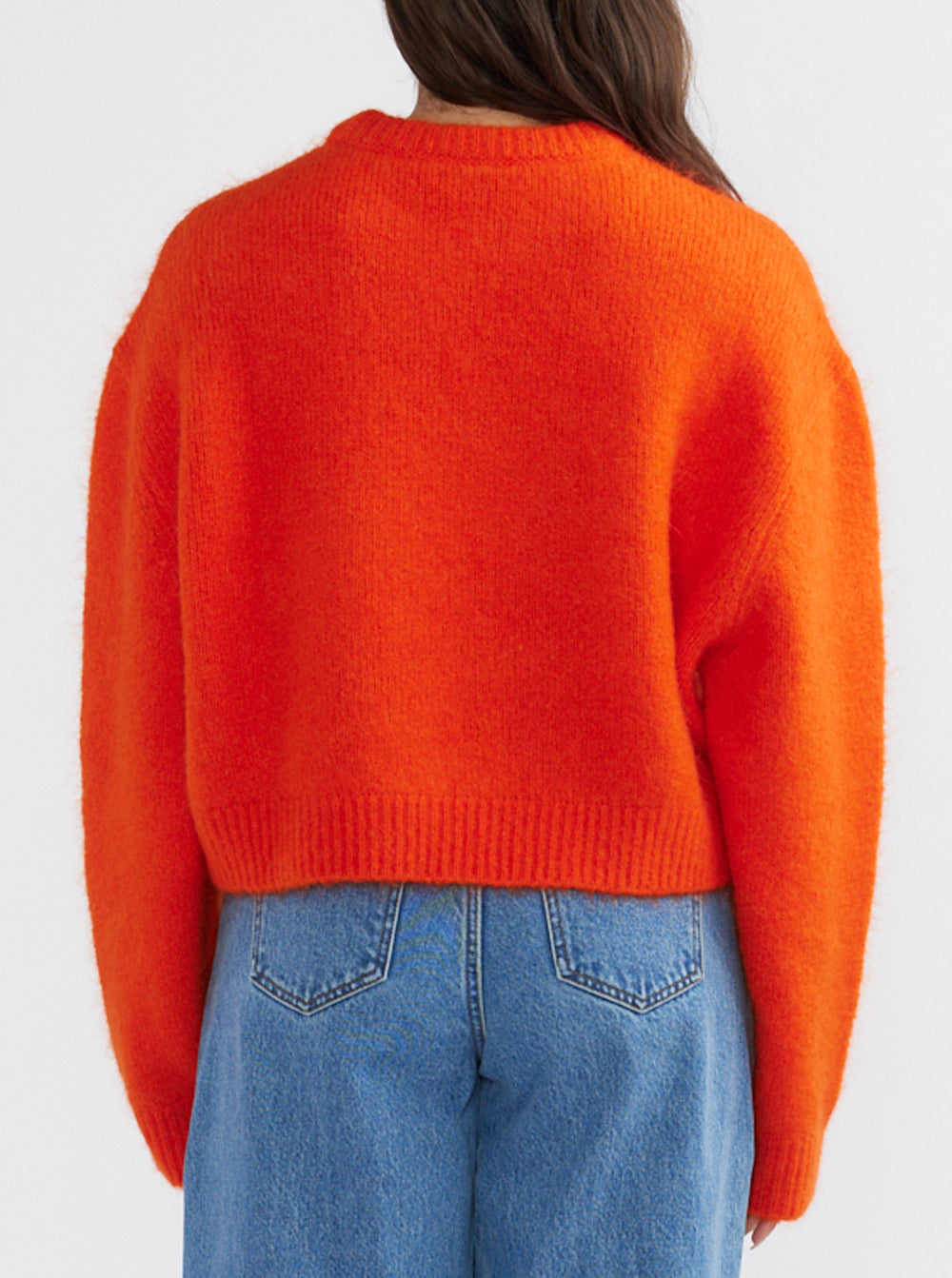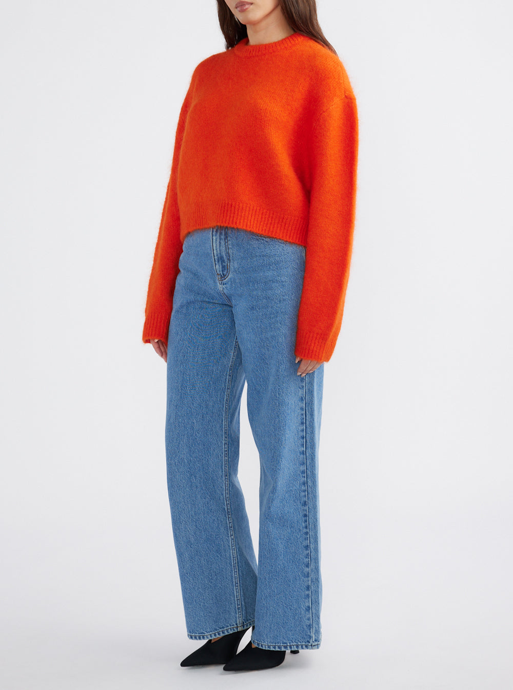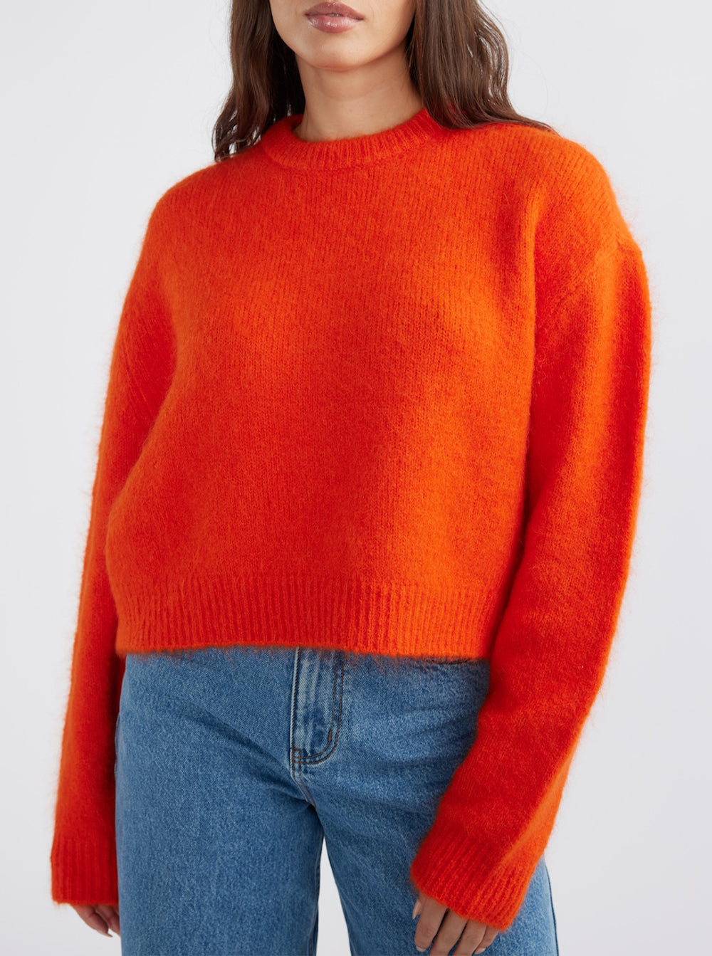 Nella Mohair Blend Knit in Tangerine is a fluffy oversized sweater designed with a ribbed crew neck, hem band, and cuffs for structured comfort.