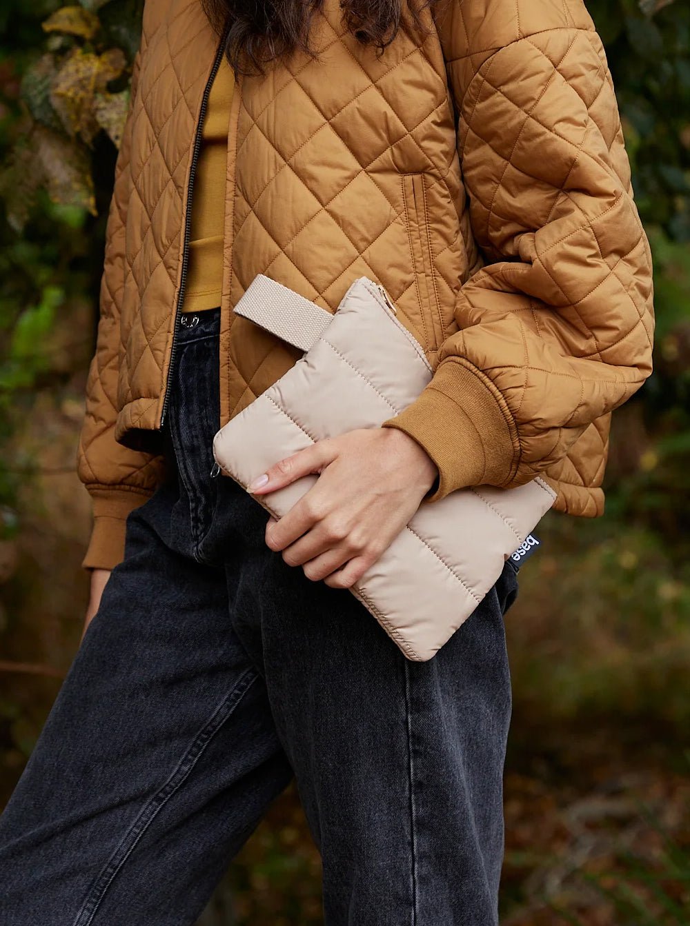 Tucked under an arm, the ultra-lightweight, ultra-compact puffer clutch makes for easy carrying.
