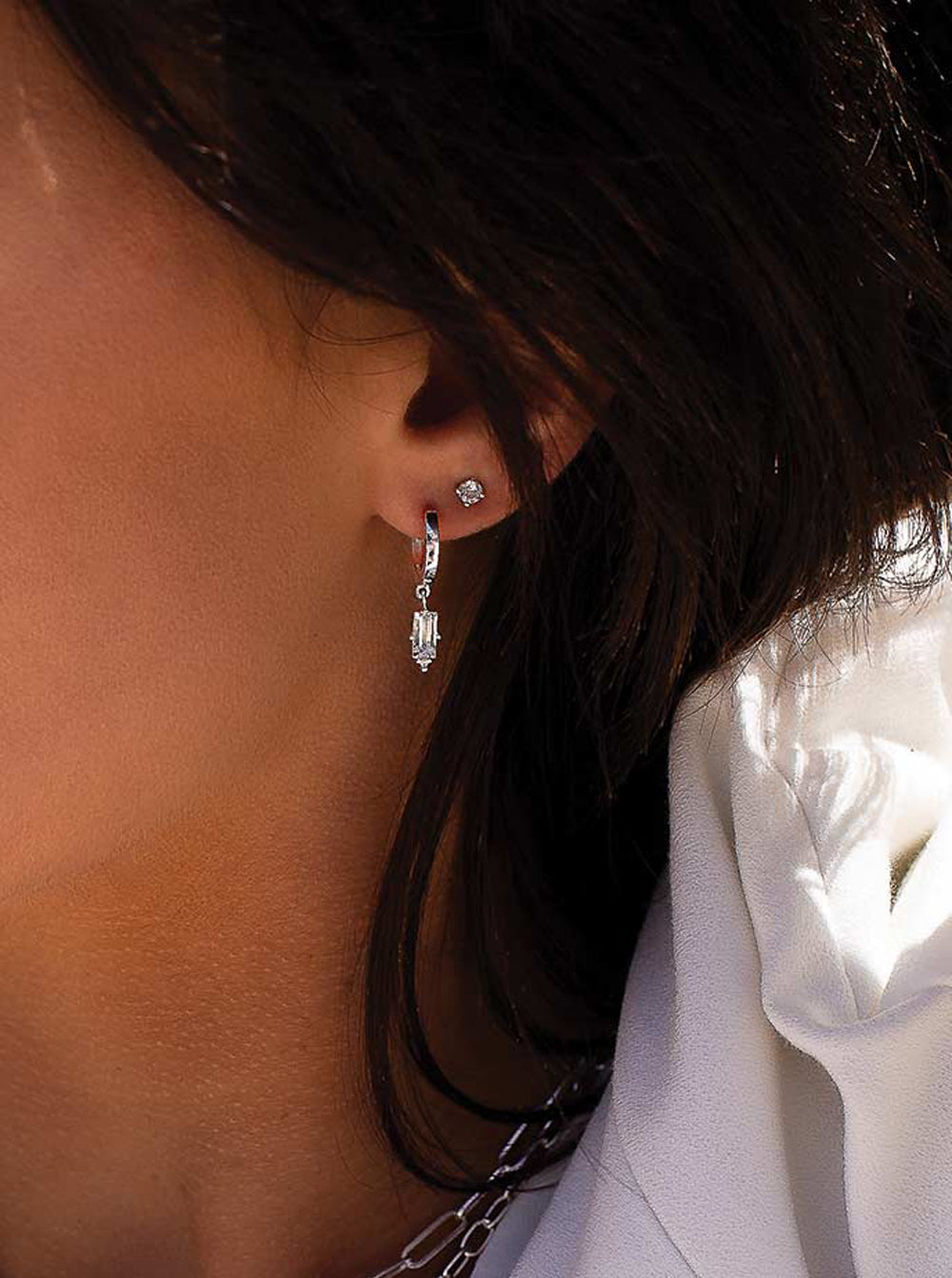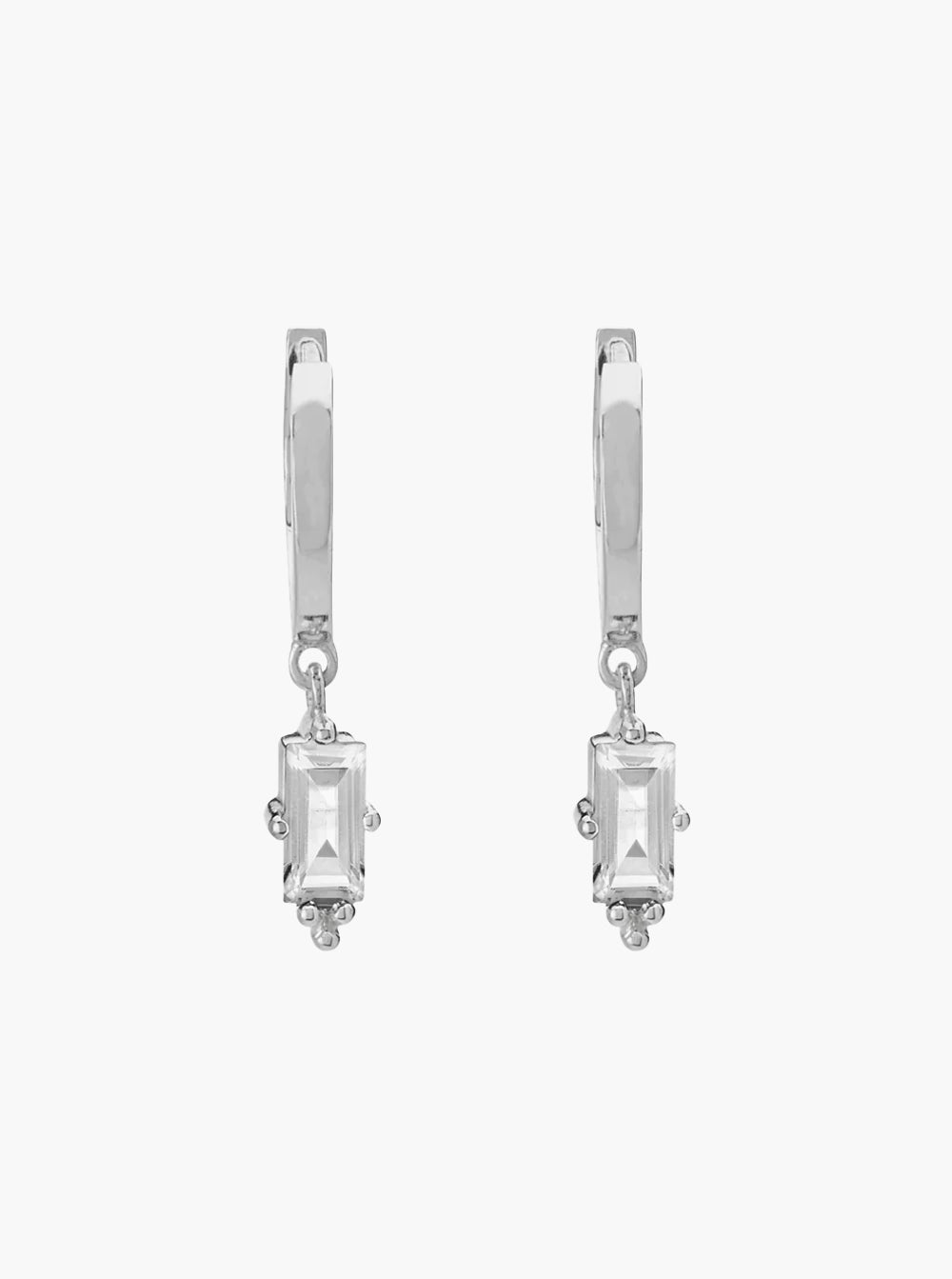 Huggies with Hanging White Topaz Baguette - Sterling Silver
