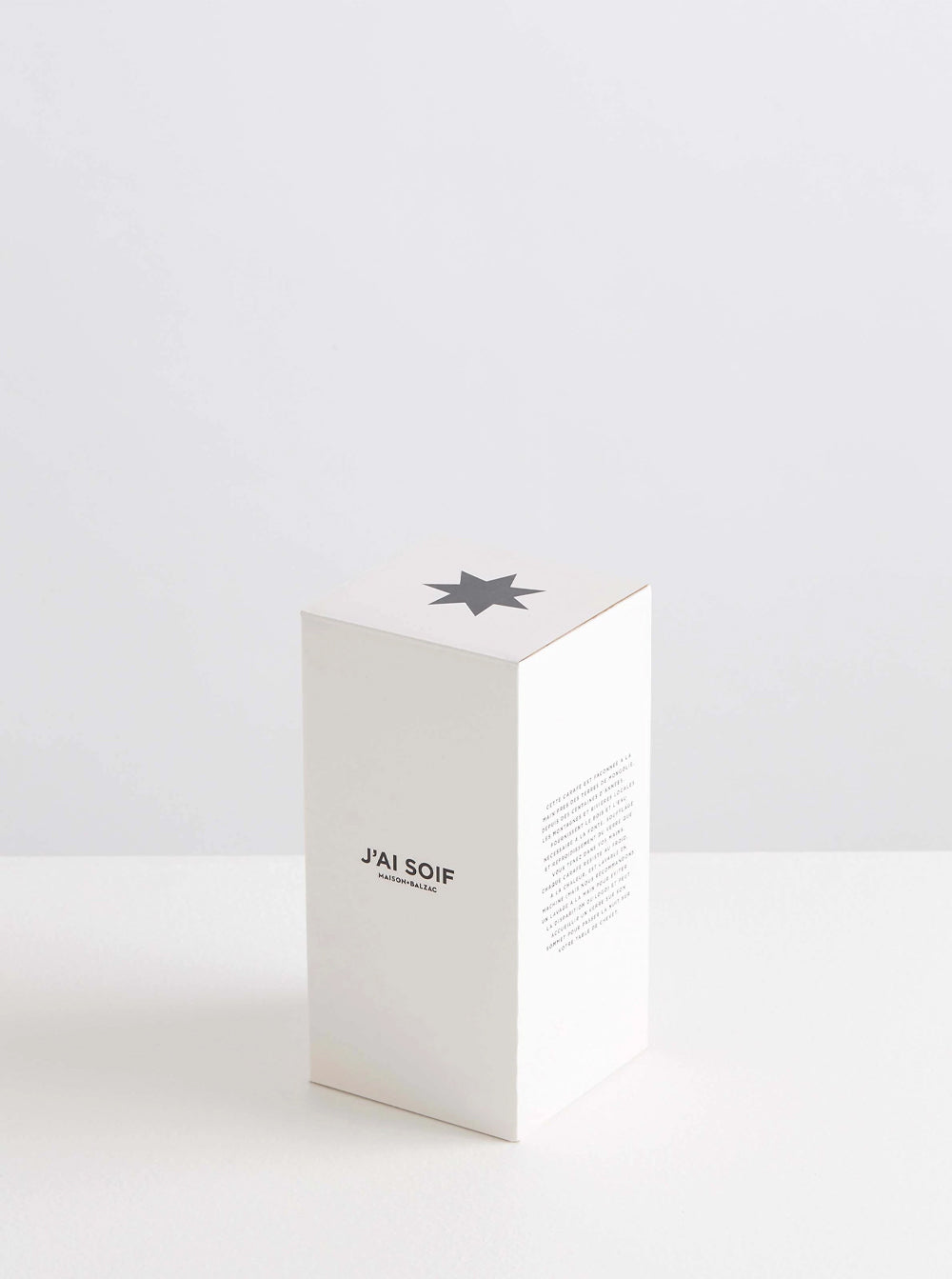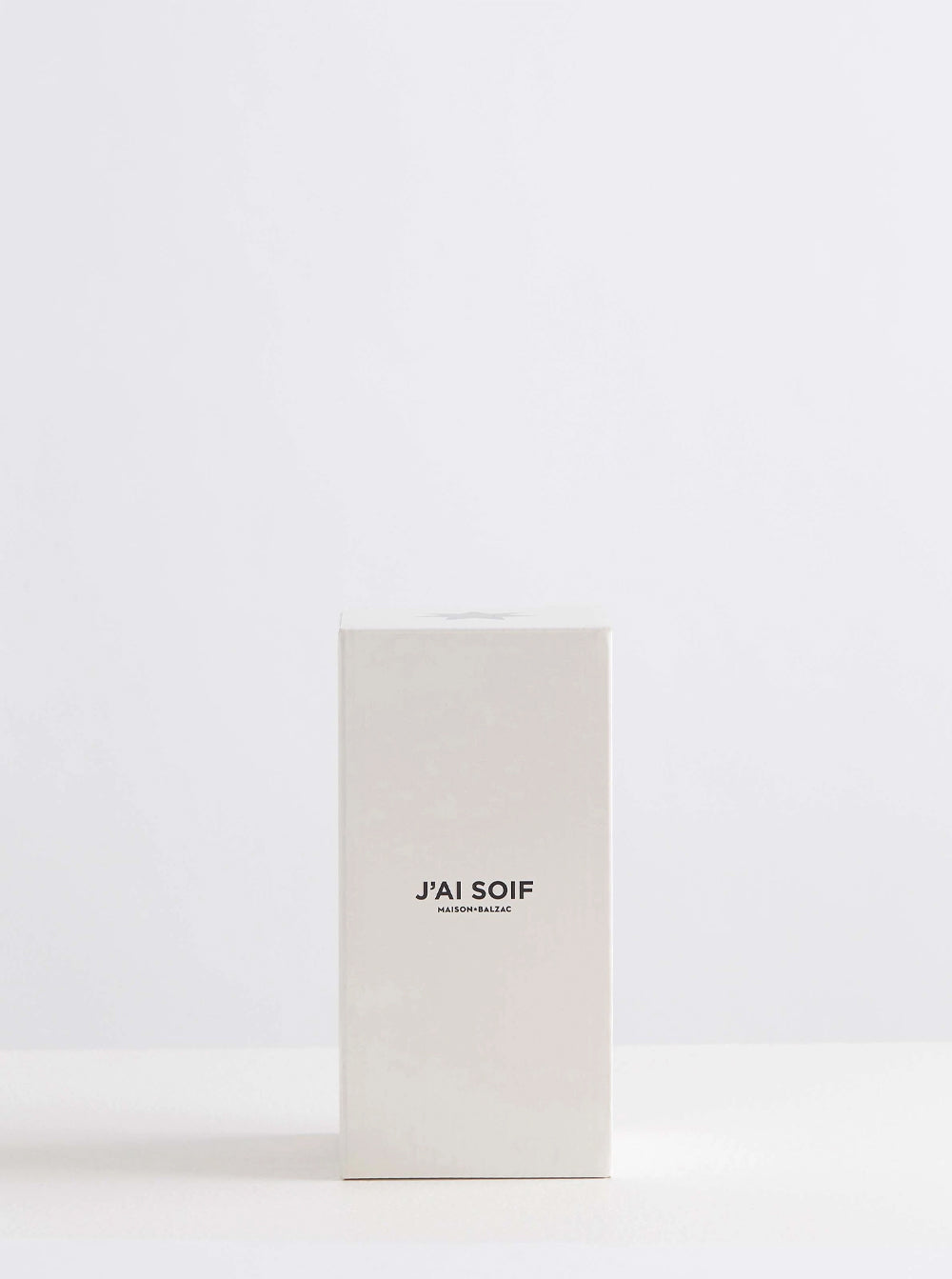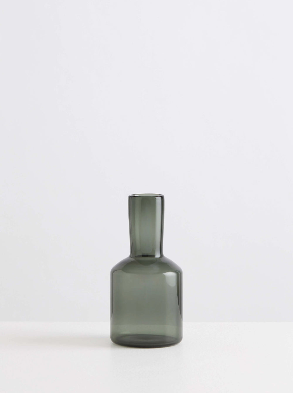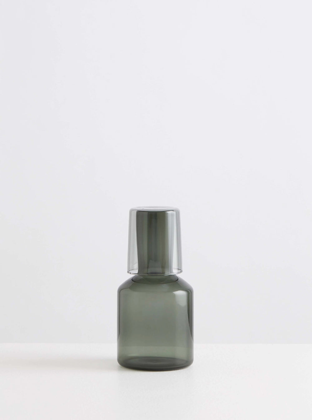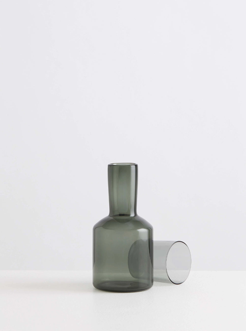 The J’ai Soif carafe and tumbler are expertly crafted from smoke Borosilicate glass, inspired by the traditional drinkware sets displayed on bedside tables in France.