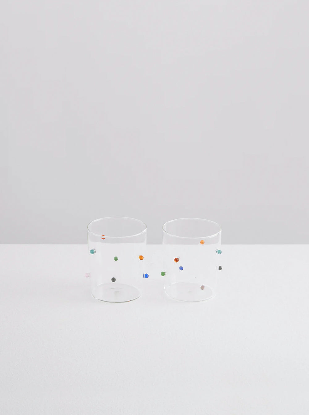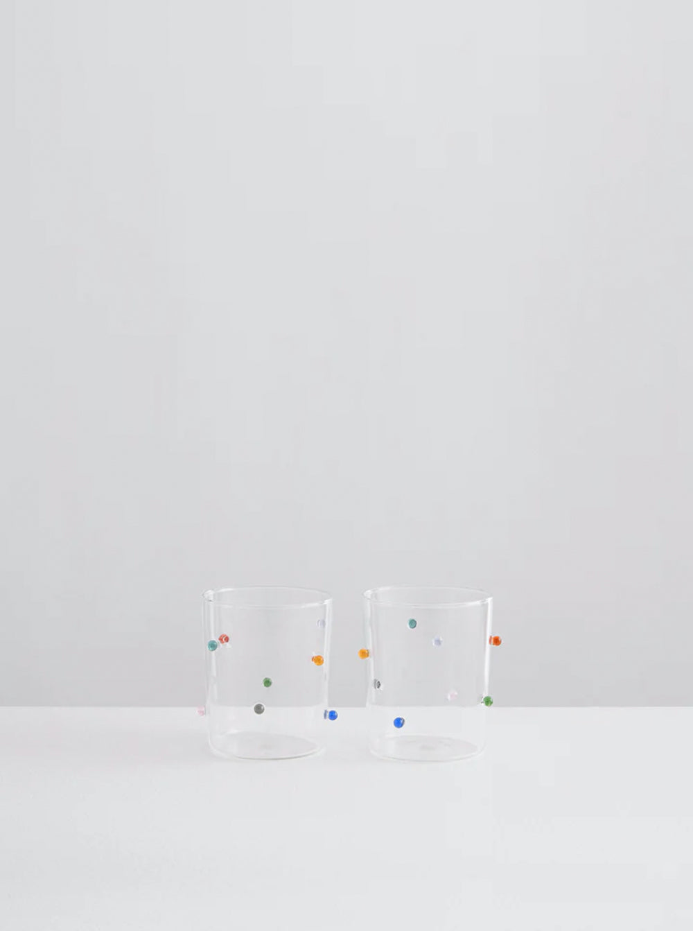 These two drinking tumblers are each handcrafted in clear borosilicate glass and adorned with floating glass balls.