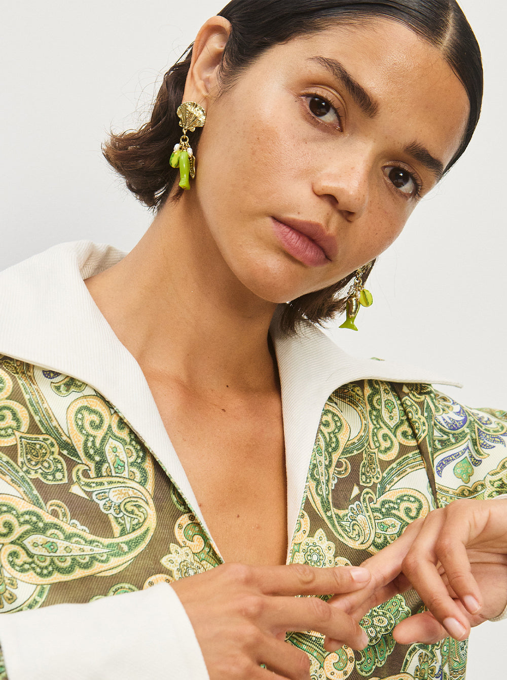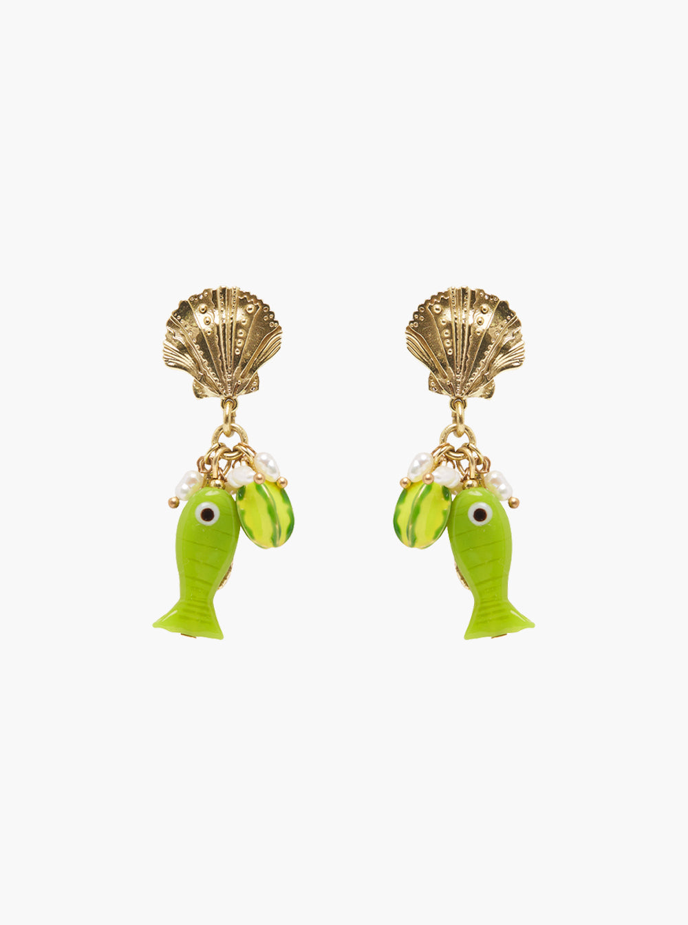 - Shell motif earring studs with a cluster of charms & freshwater pearl drops