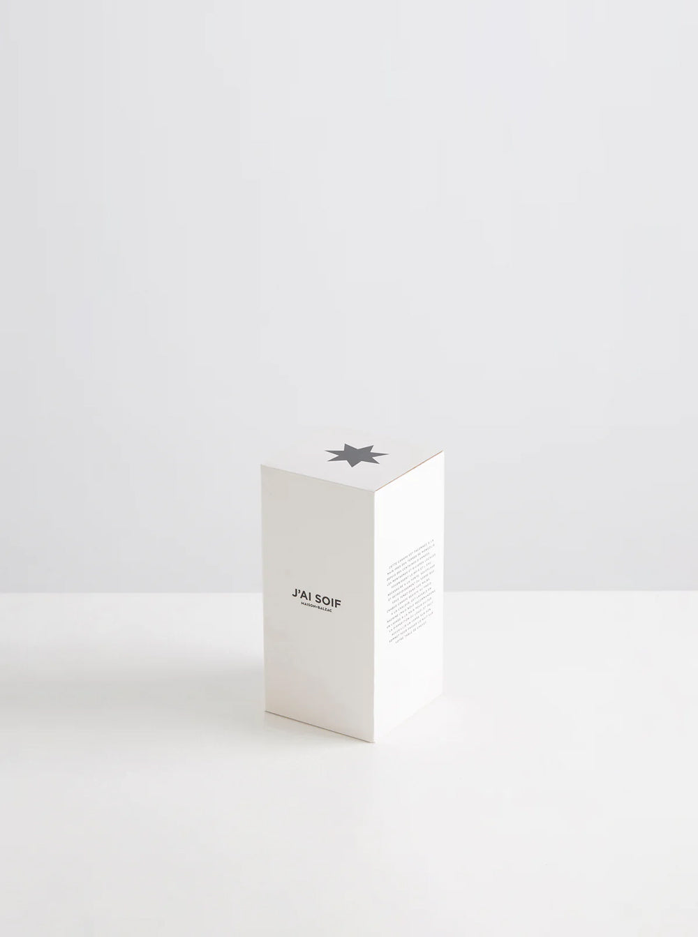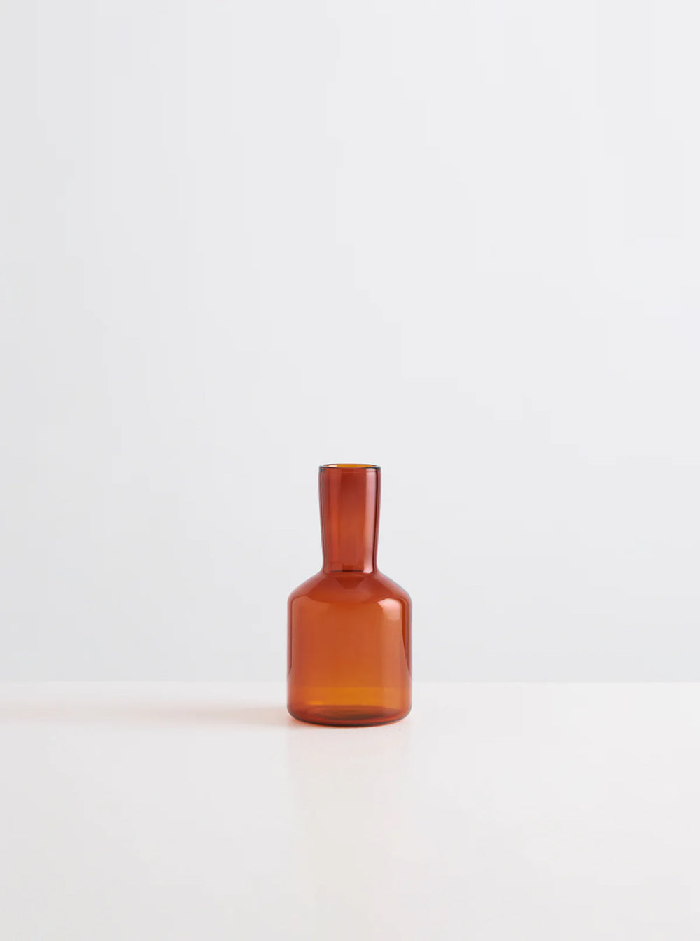 The J’ai Soif carafe and tumbler are expertly crafted from amber Borosilicate glass, inspired by the traditional drinkware sets displayed on bedside tables in France.