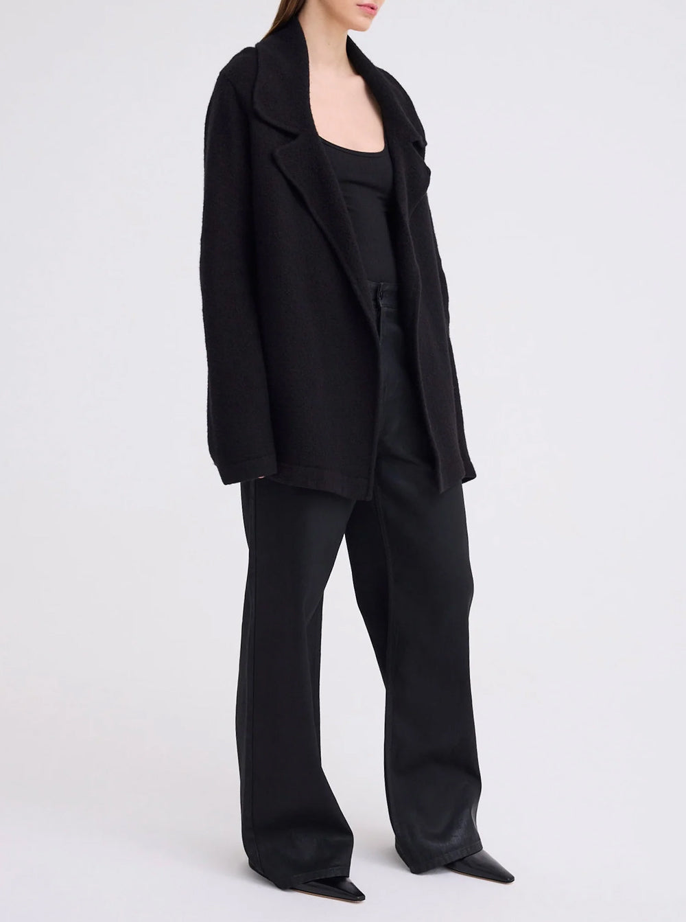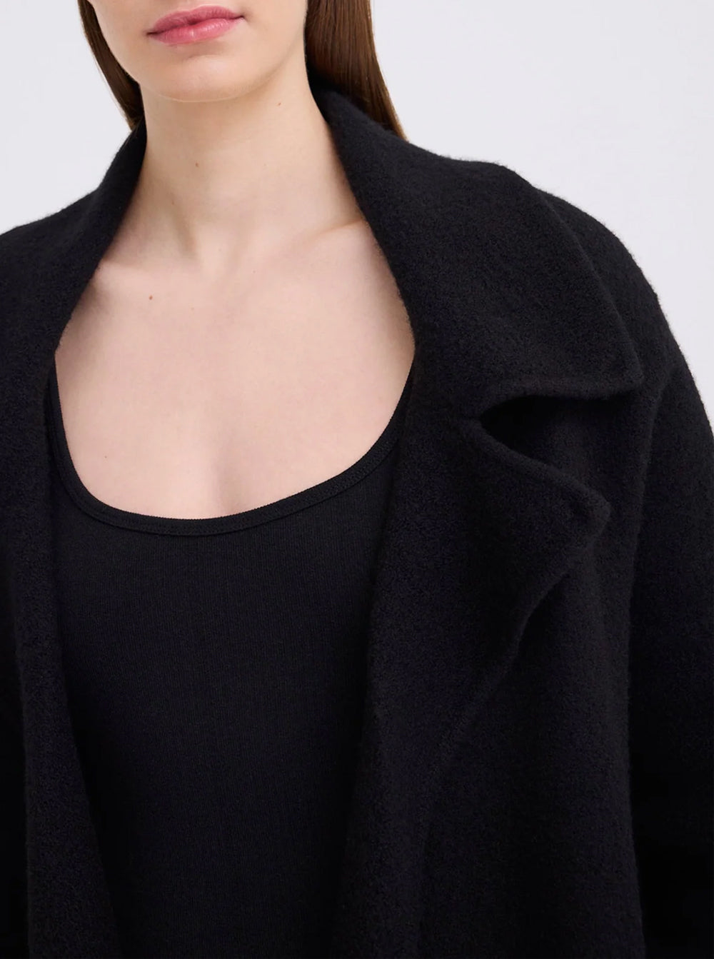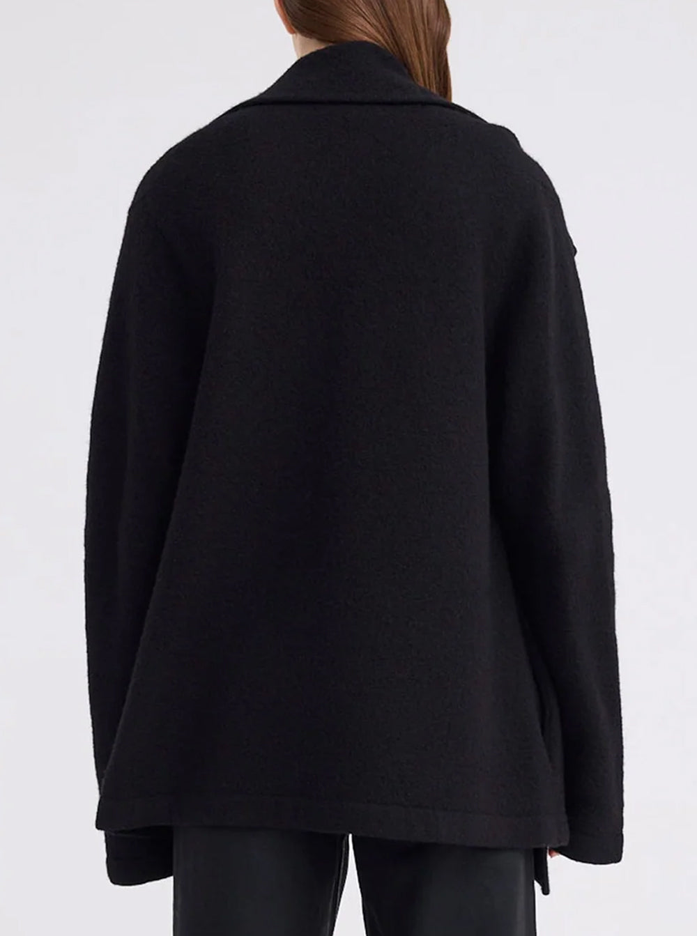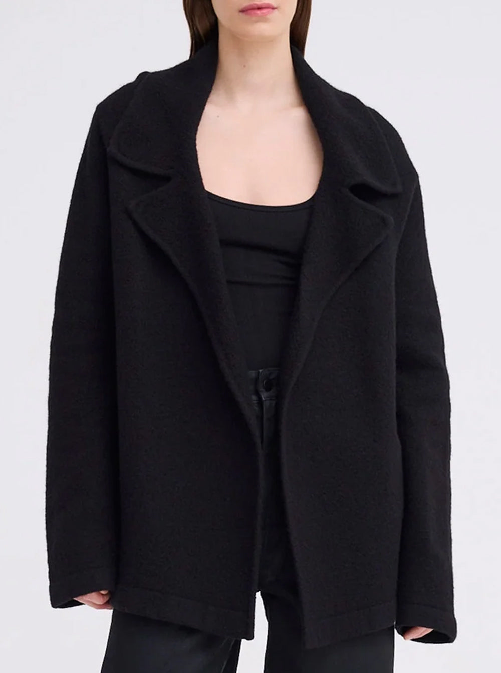 An elegant outerwear piece that blends soft tailored details with a sculptural yet unstructured shape.