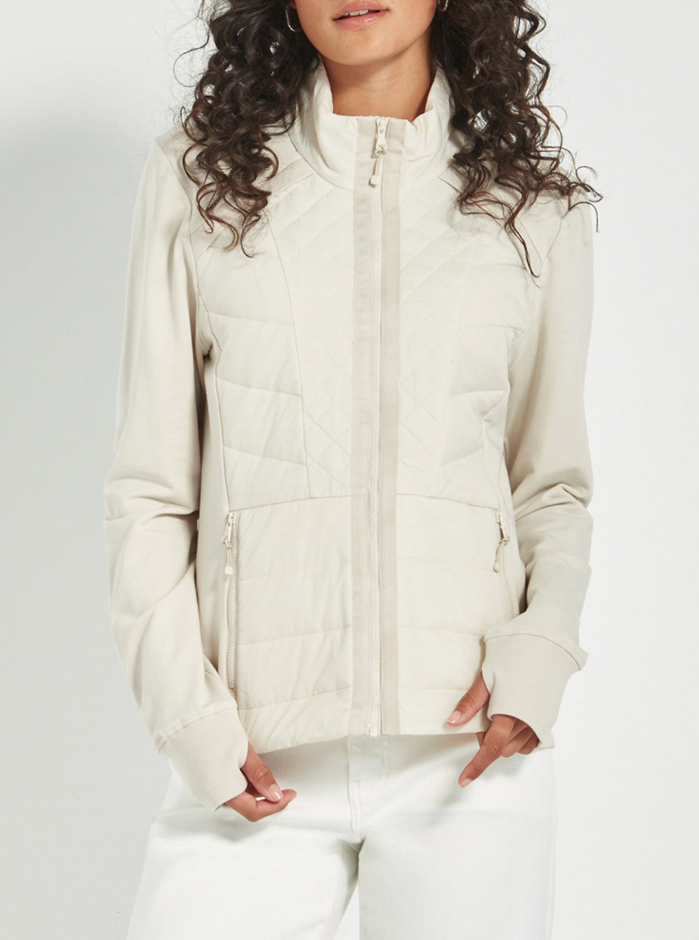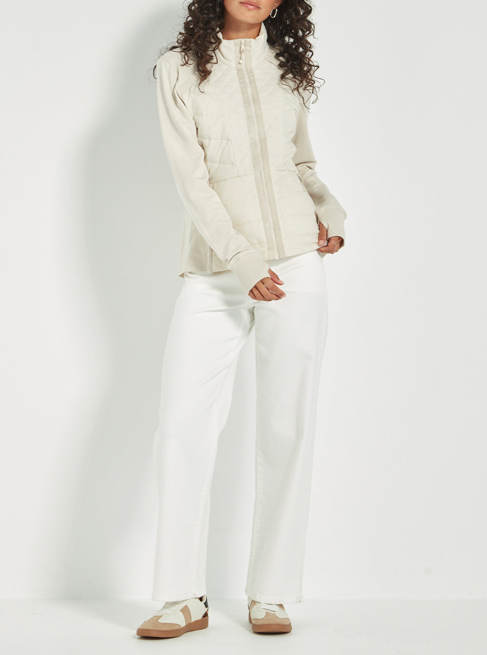 Crafted in soft, unbrushed French terry with lightly quilted front panels, it offers the perfect blend of structure and softness. A high neckline, full-length sleeves with cuffs, and a front zip add to its functional appeal, while side pockets and a flattering hip-length cut keep it effortlessly wearable.