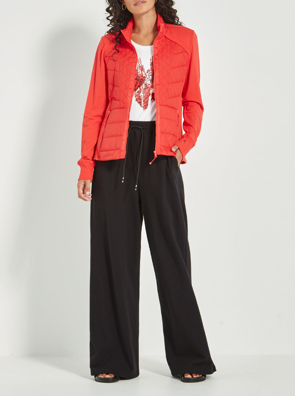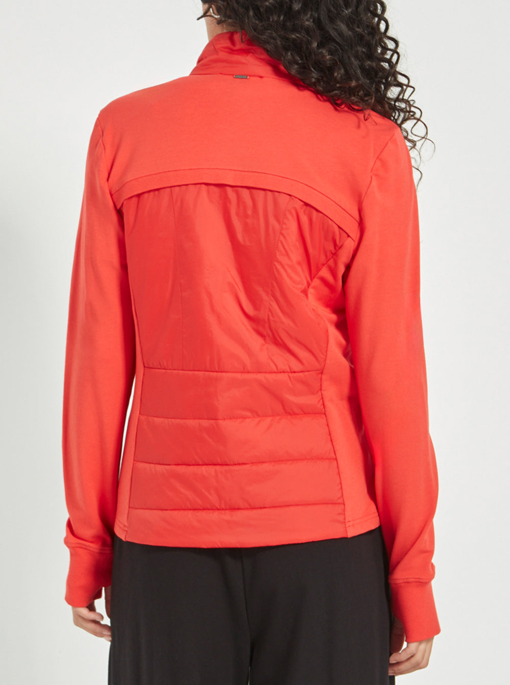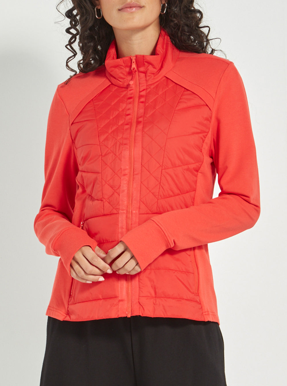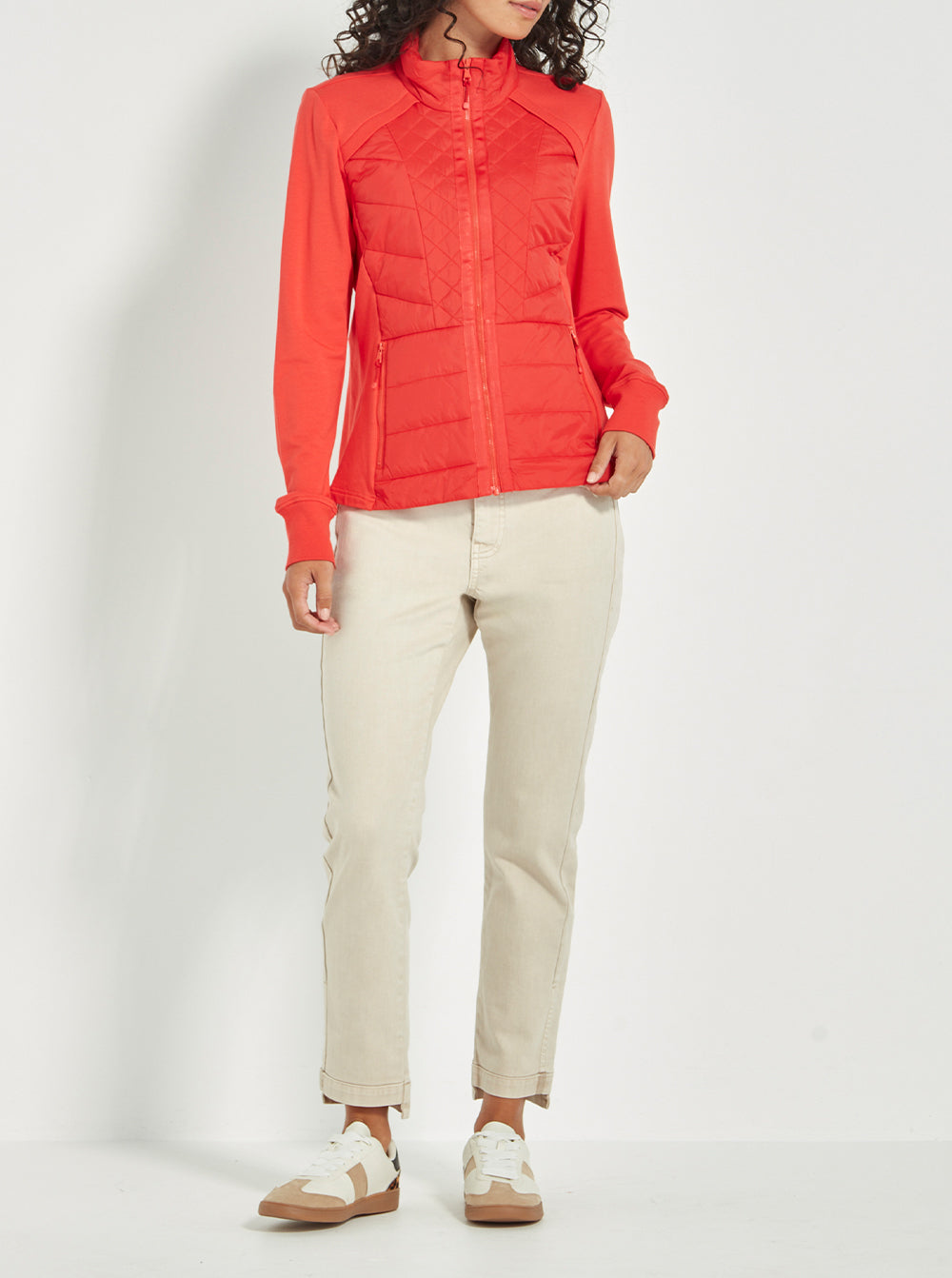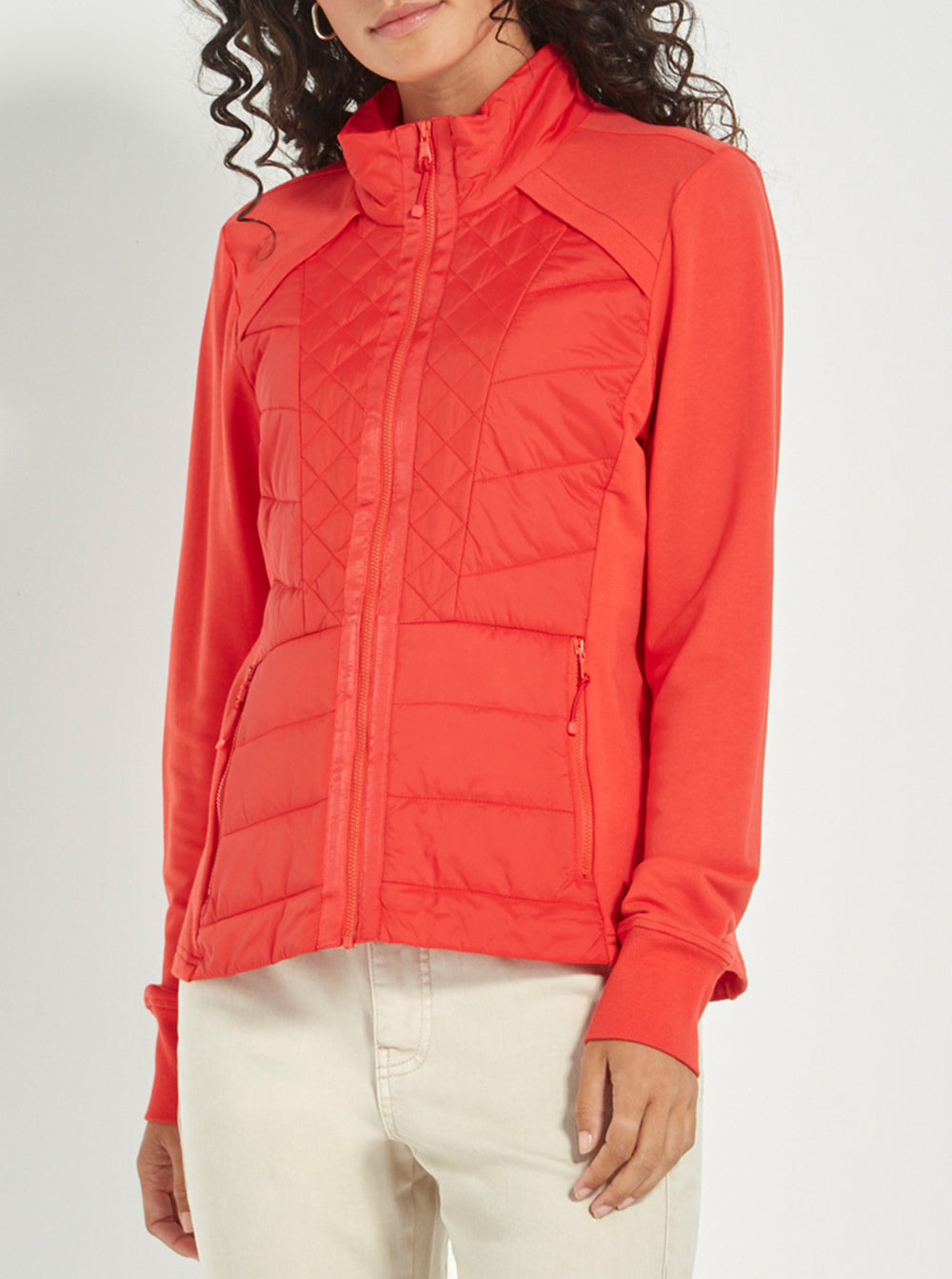 Crafted in soft, unbrushed French terry with lightly quilted front panels, it offers the perfect blend of structure and softness. A high neckline, full-length sleeves with cuffs, and a front zip add to its functional appeal, while side pockets and a flattering hip-length cut keep it effortlessly wearable.