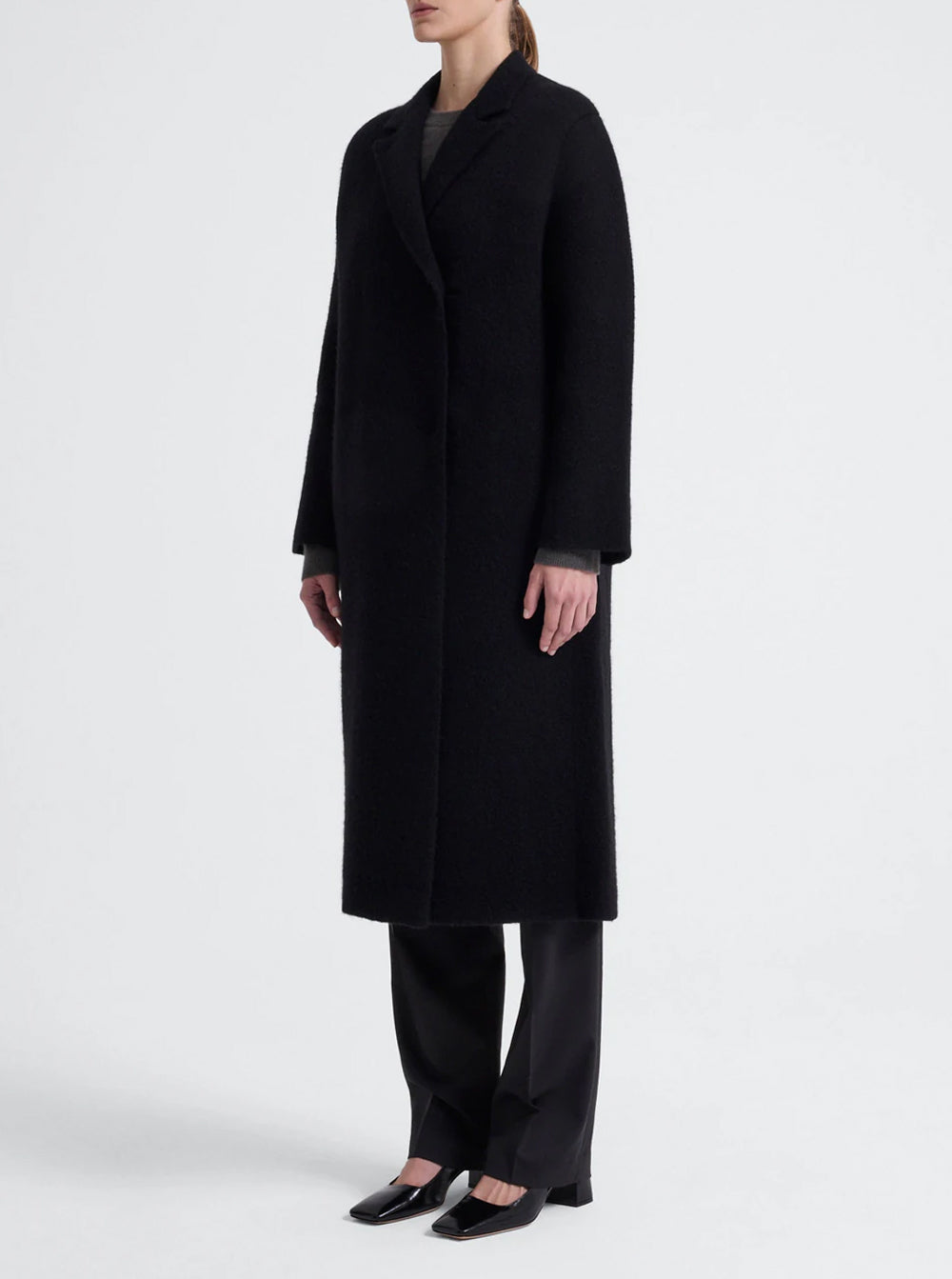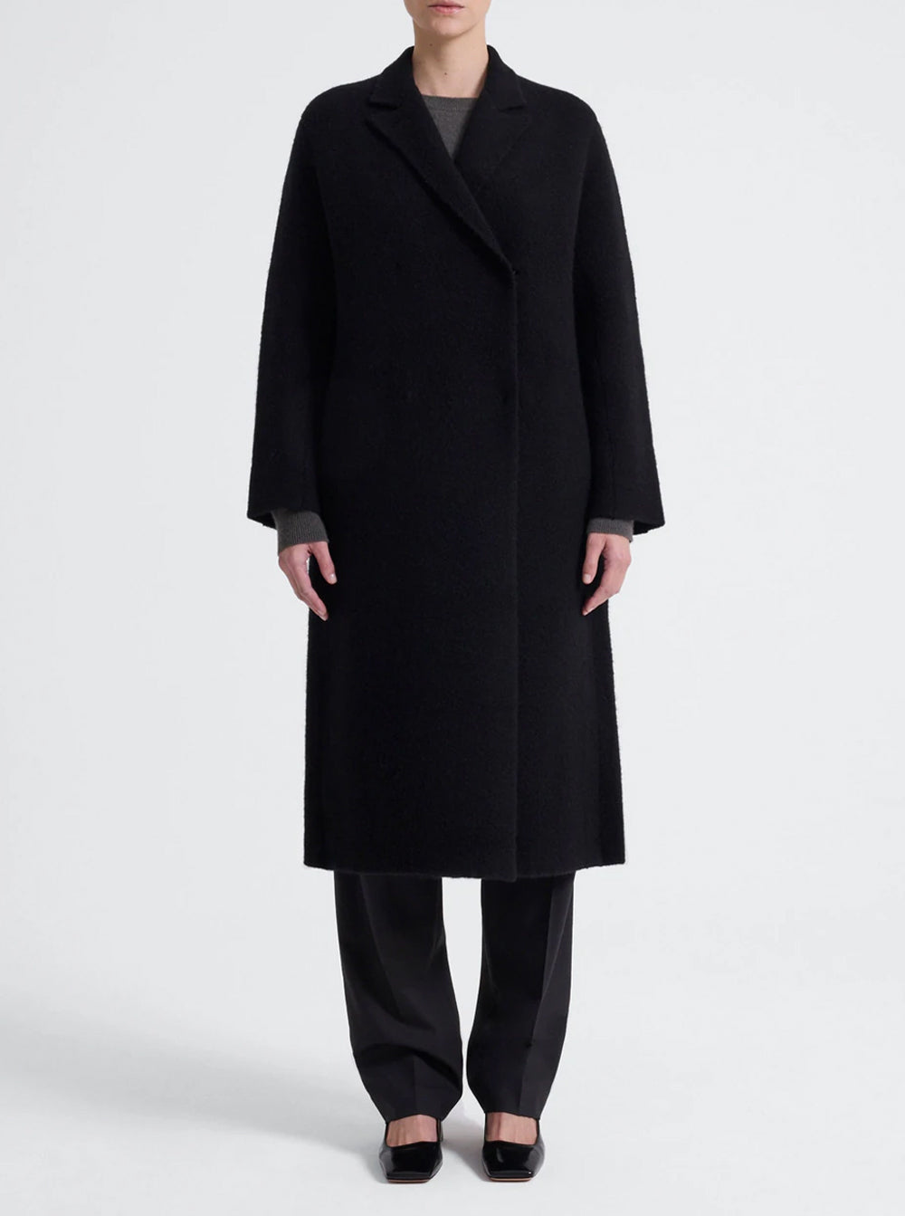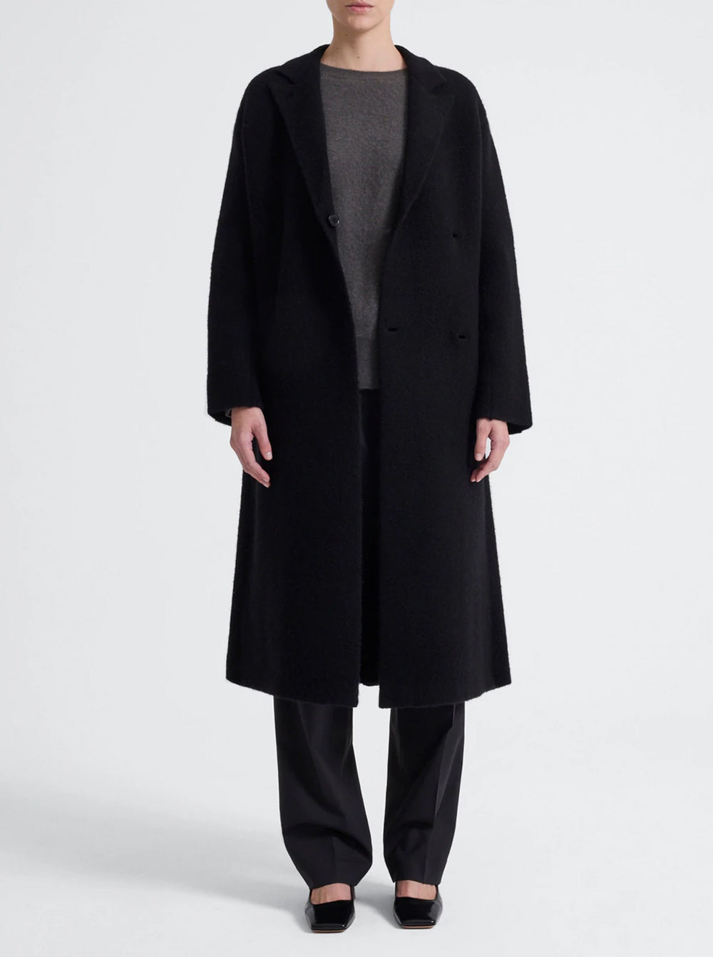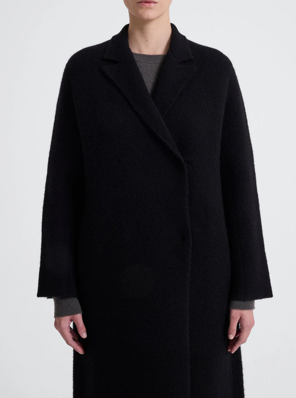 Crafted from a soft yak and wool blend, it features a relaxed notched lapel, drop shoulders and an oversized silhouette, perfect for throwing on over soft tailoring and unstructured silks.