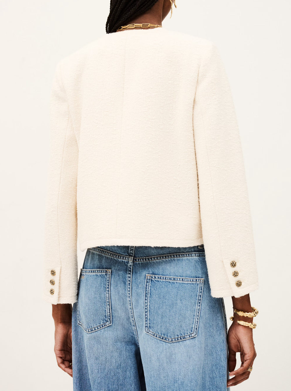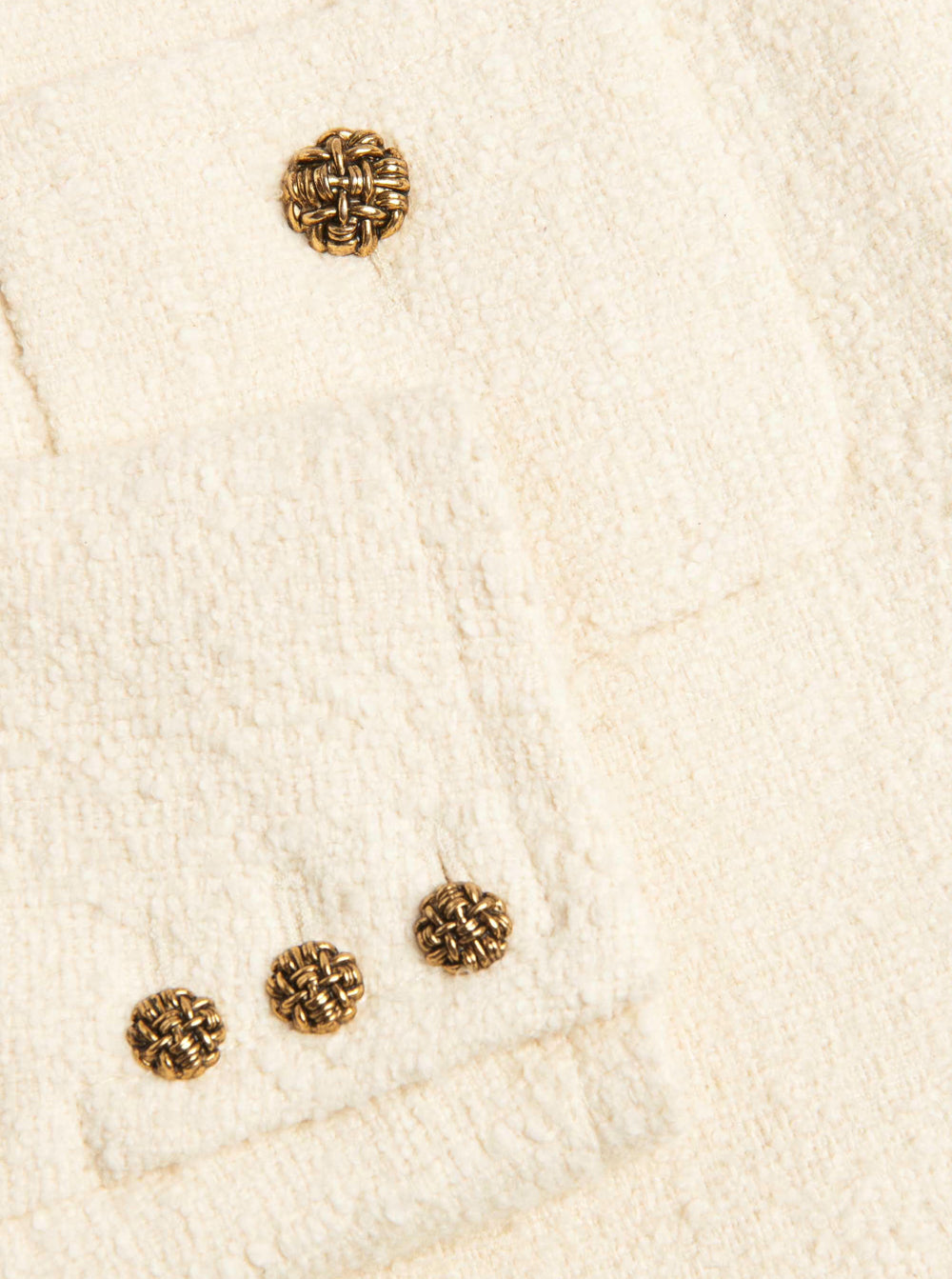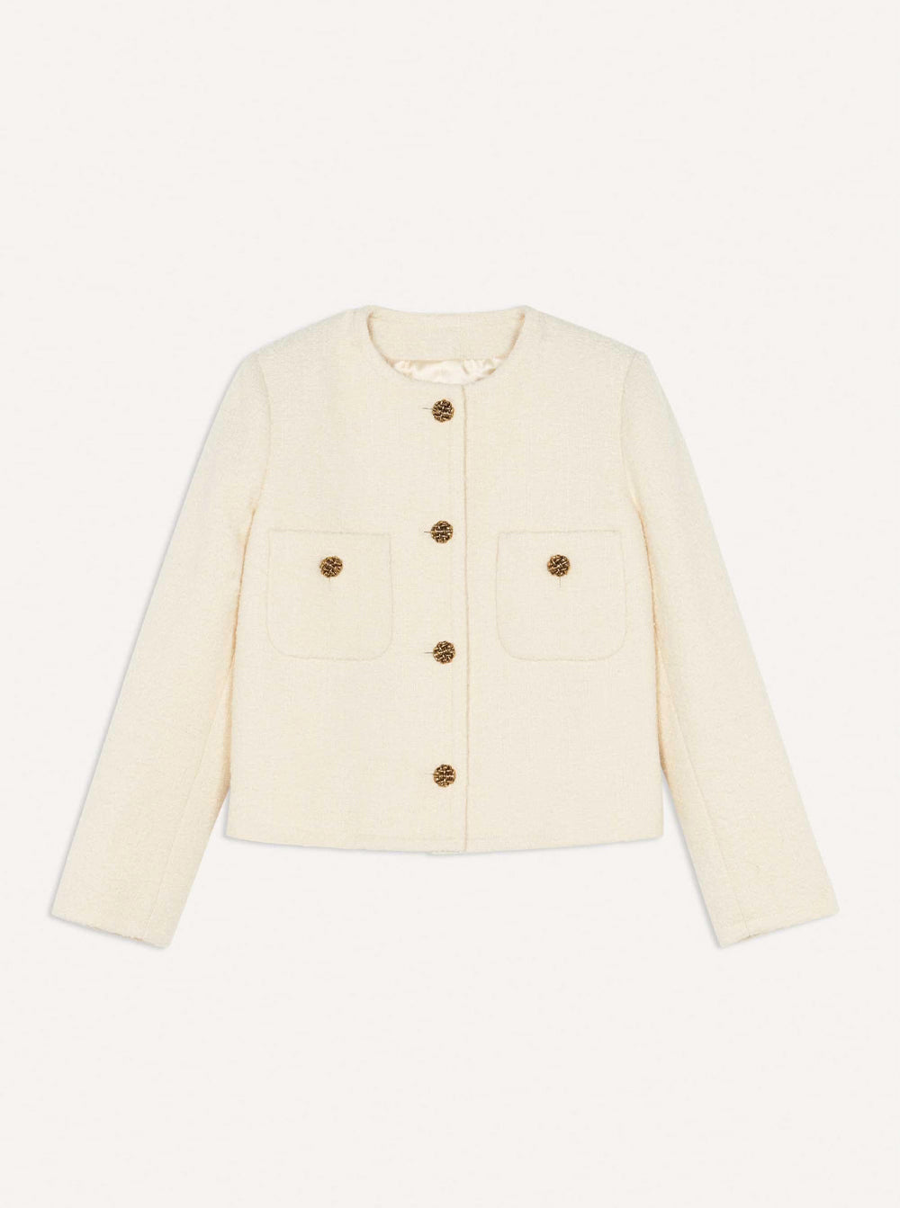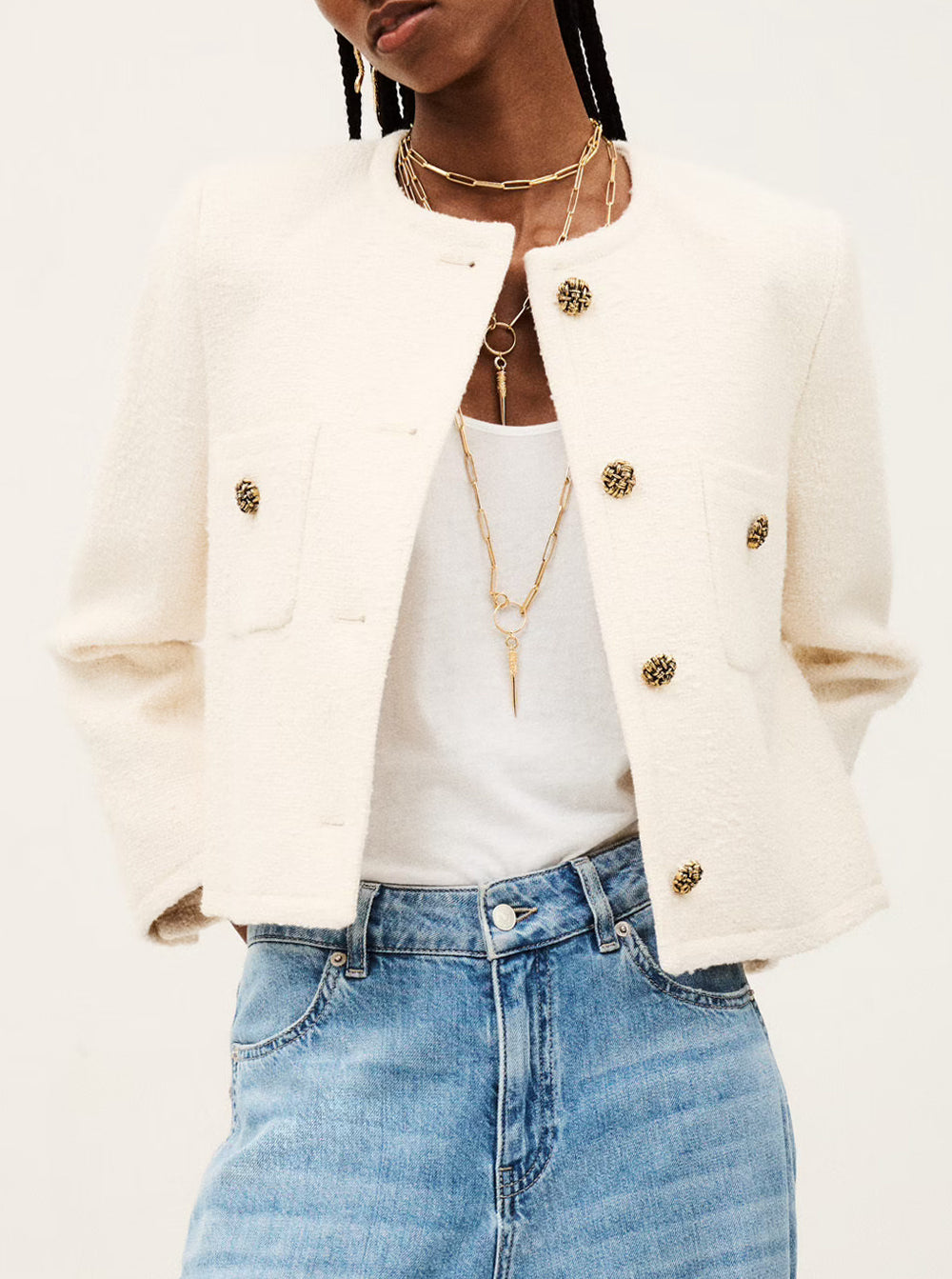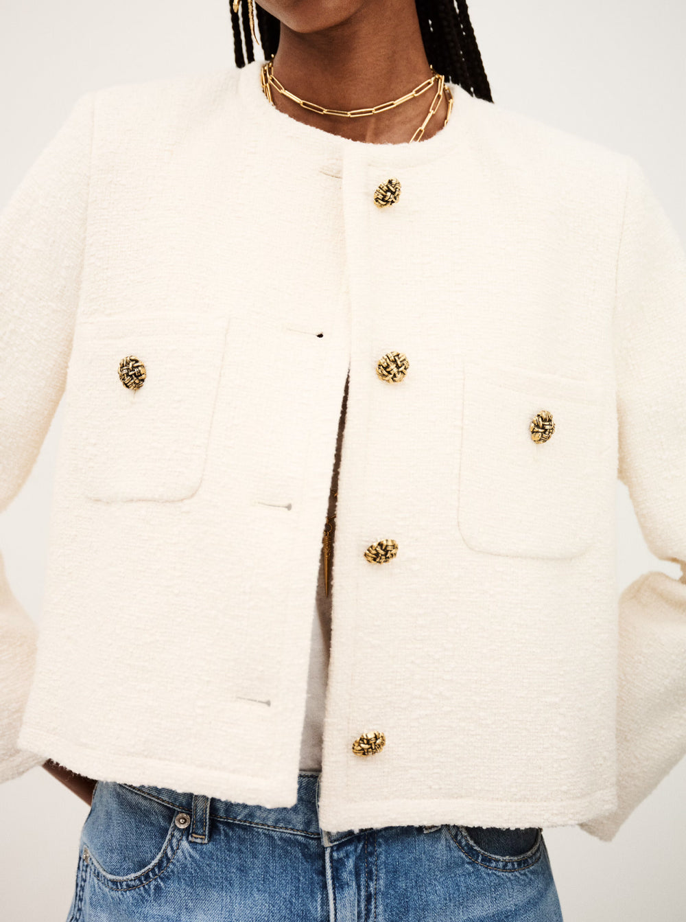 It features a round neckline, two patch pockets and buttons crafted with care on the front and cuffs. Personally, we love the chic golden buttons!