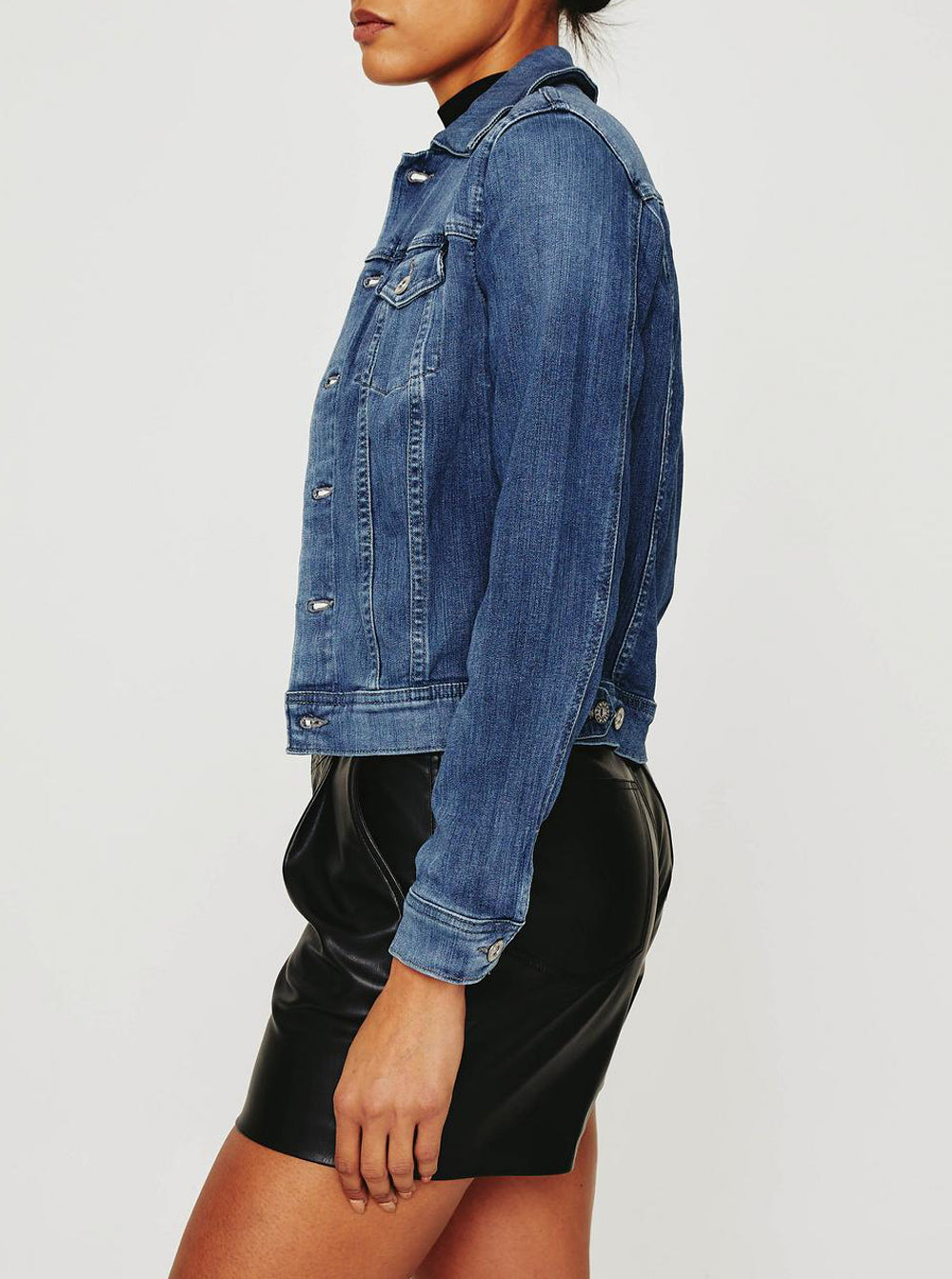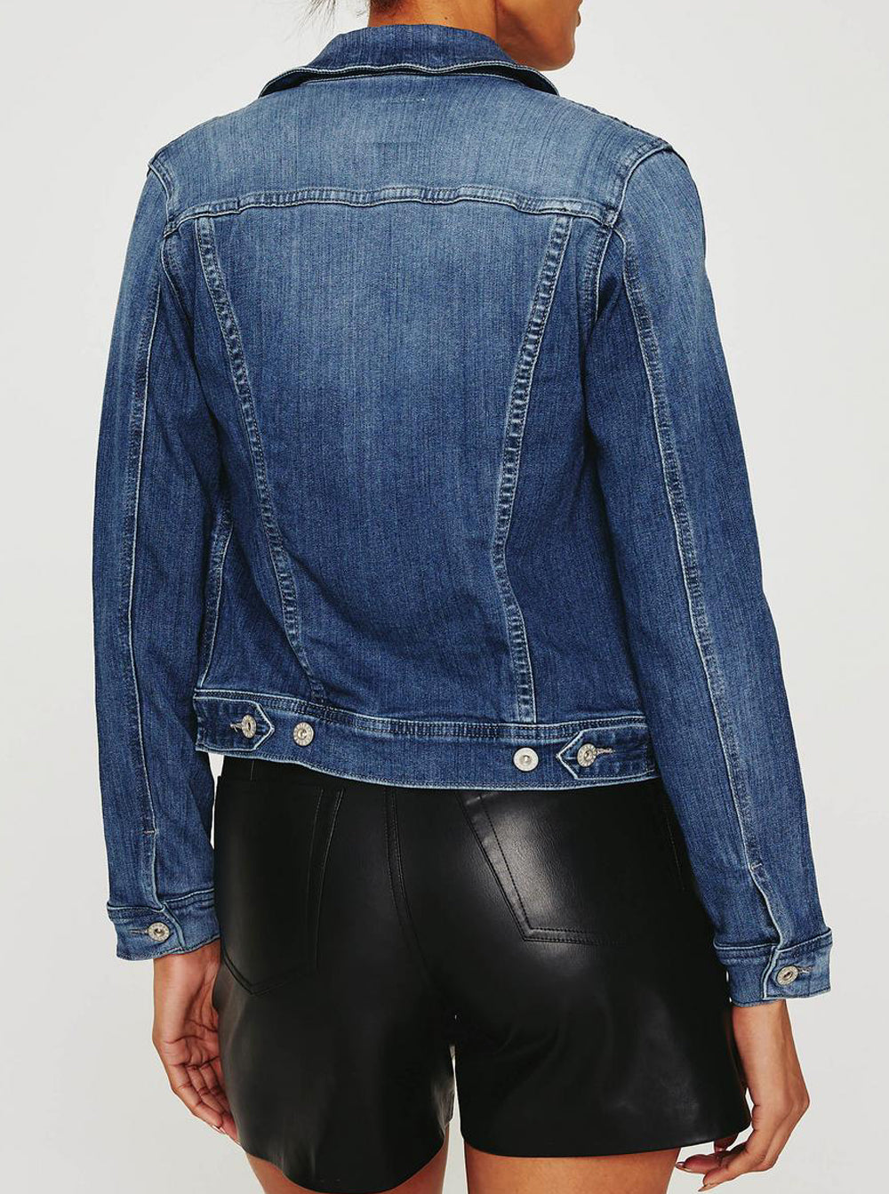 The Robyn Jacket for women is a slim-cut jean jacket in a faded blue wash. It's a fitted version of the classic trucker, complete with flap pockets, tonal button closures, and adjustable waist tabs.