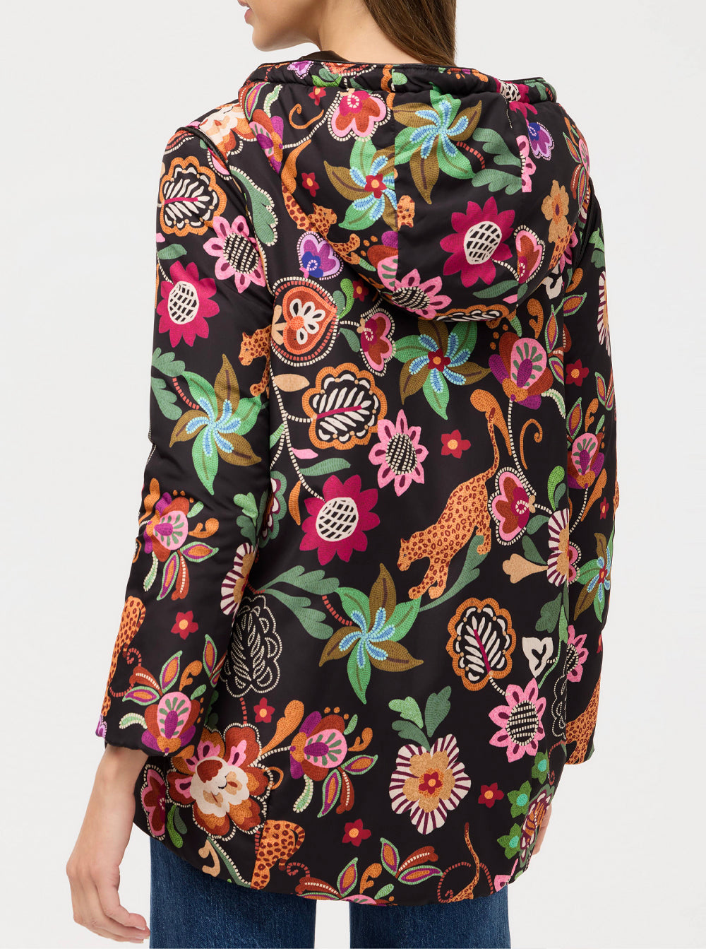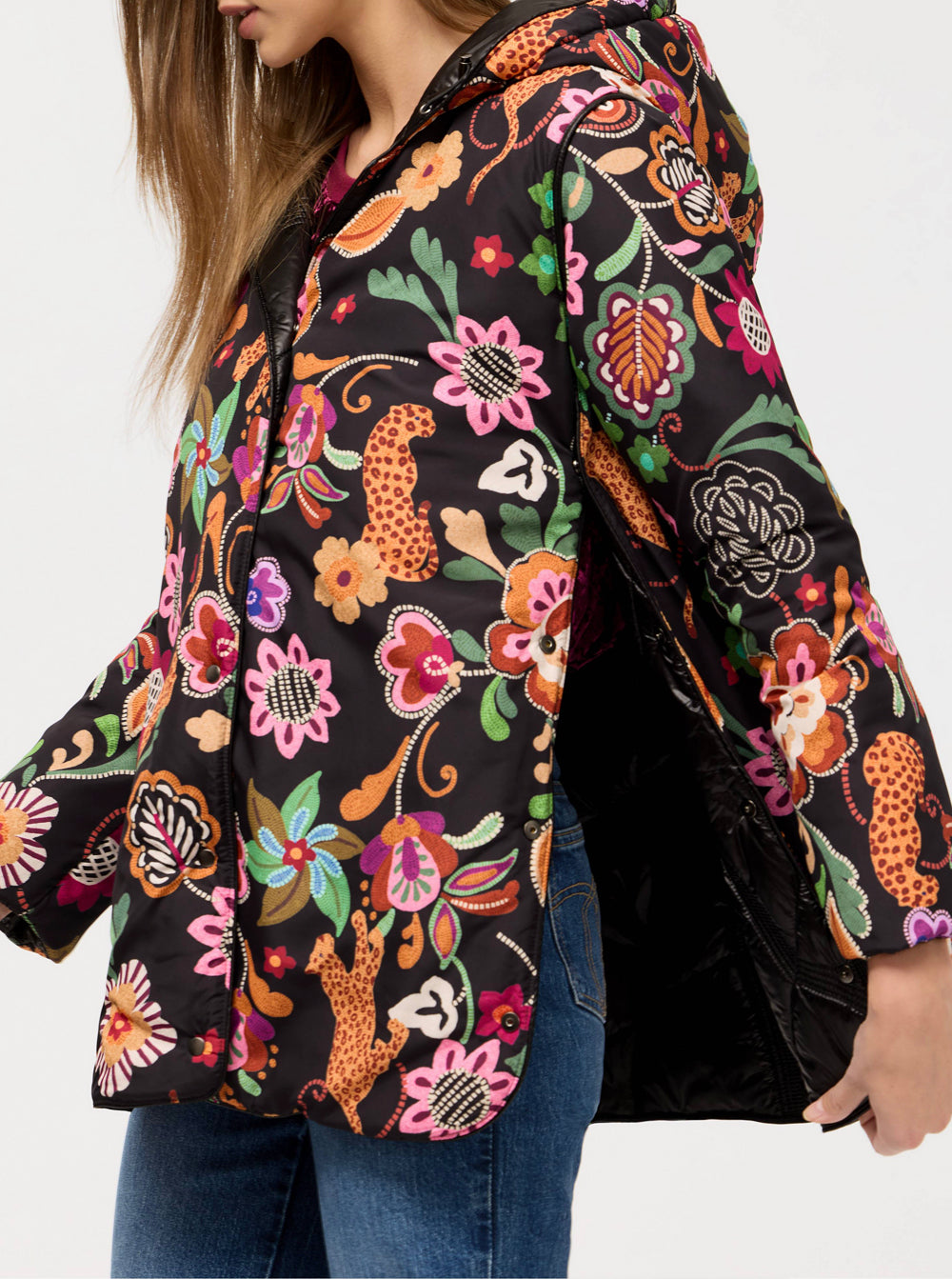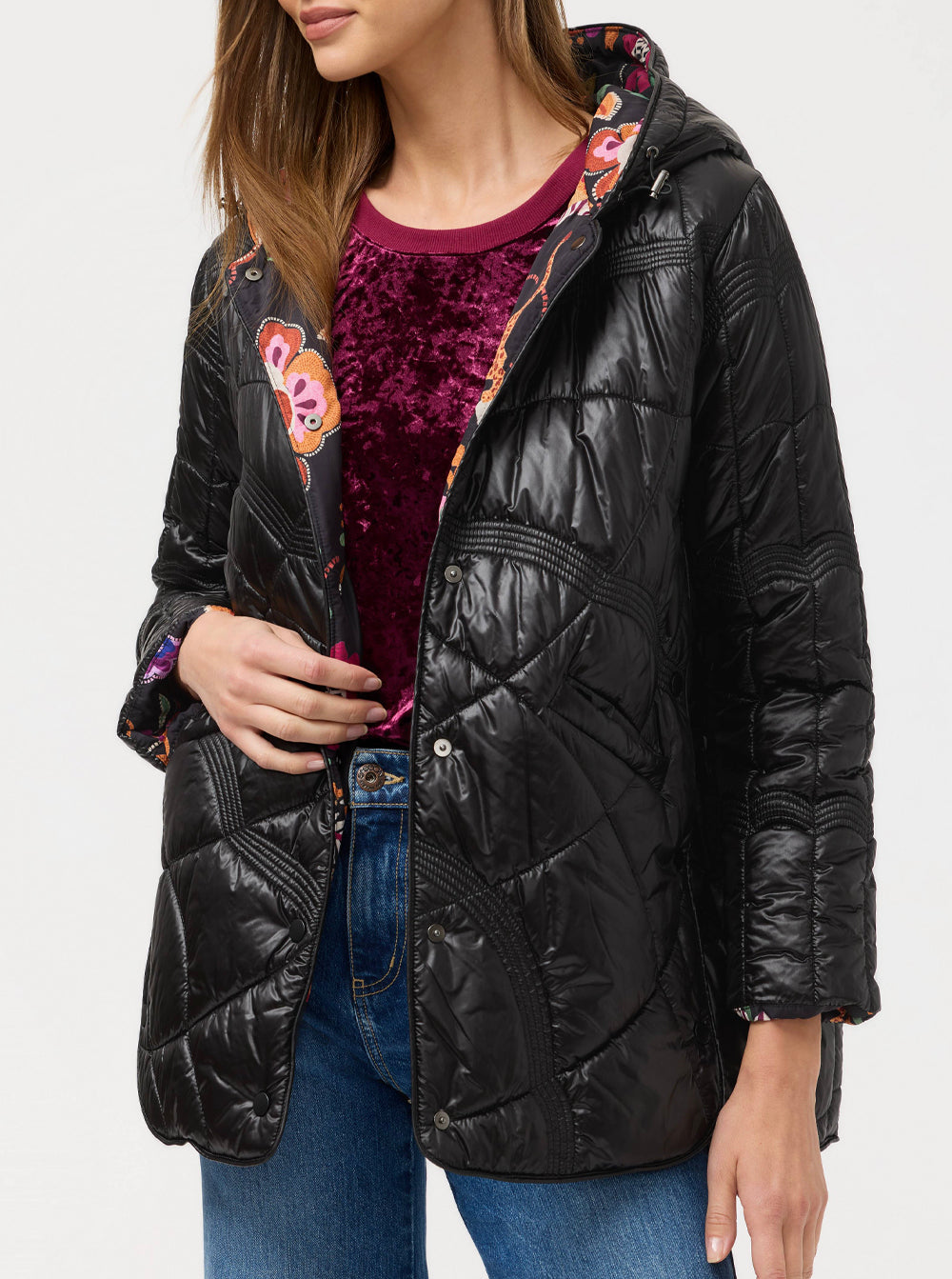 Crafted in a classic puffer style, this jacket features a snap front and a bungee hood closure and is finished with a vibrant floral lining for a splash of color.