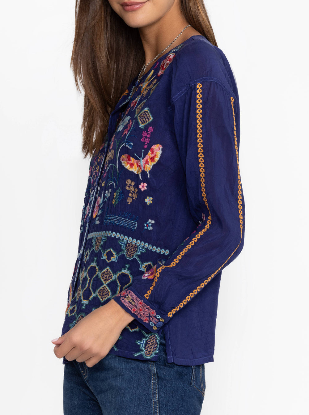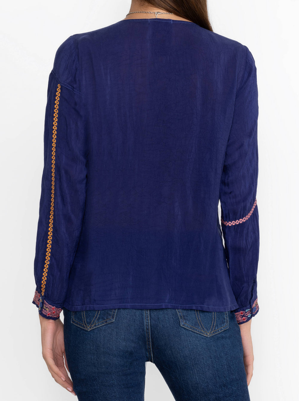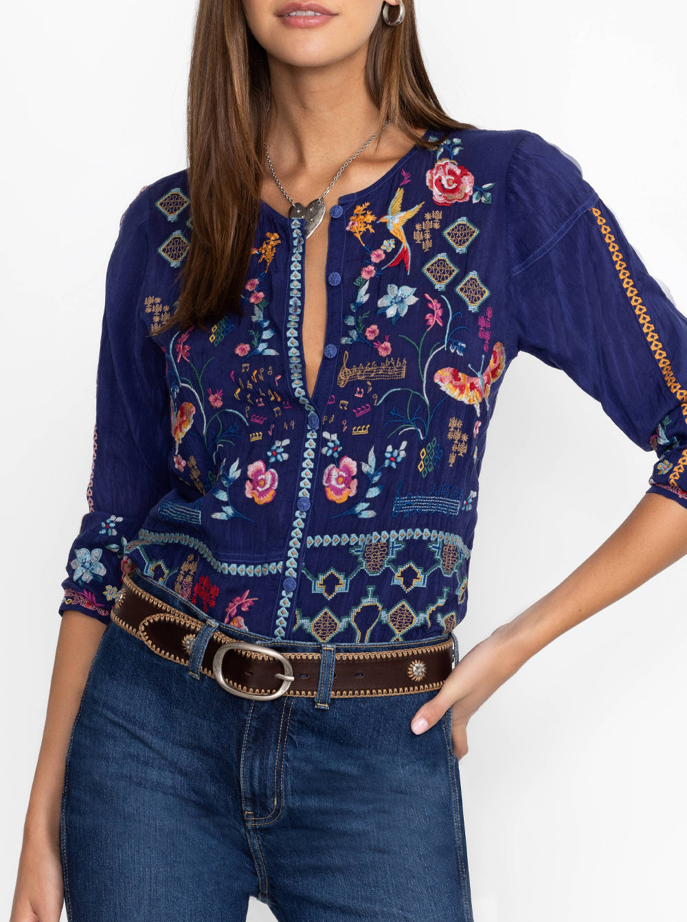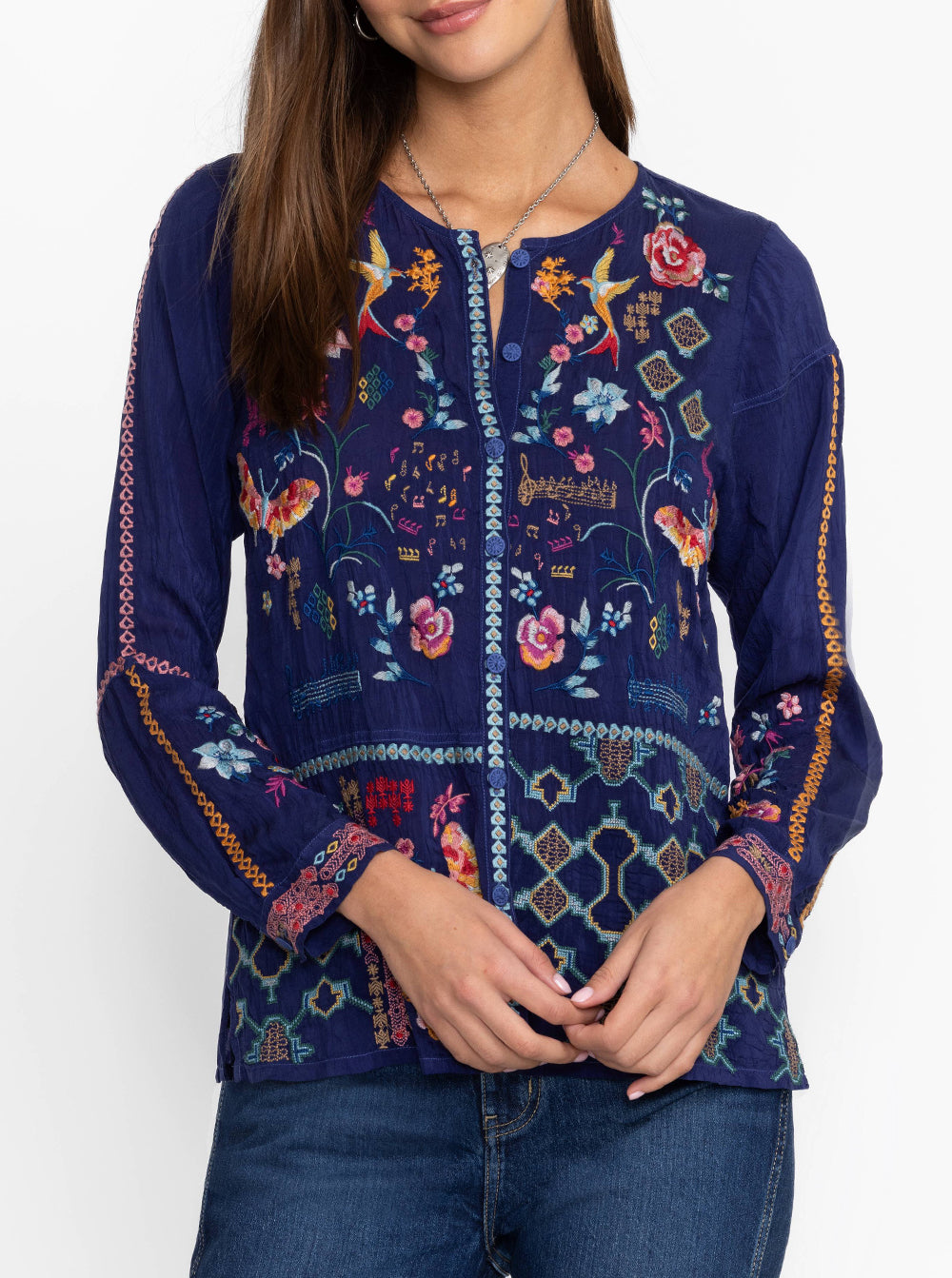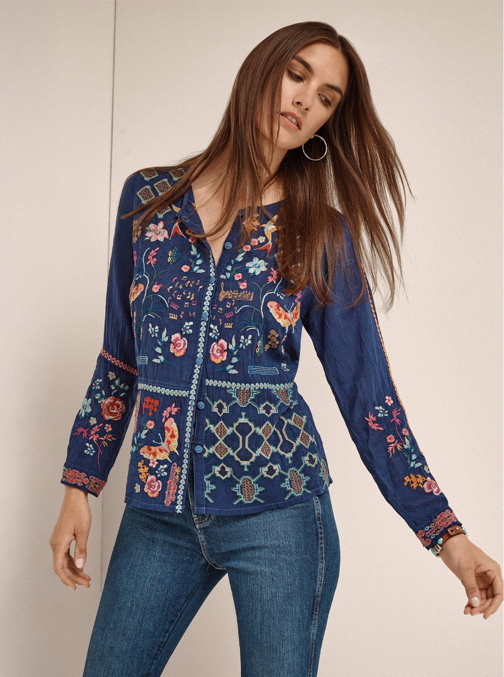 Featuring a rounded neckline and a button front, this long sleeve blouse is embellished with intricate placement embroidery in vibrant color.
