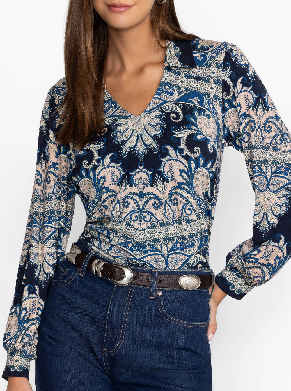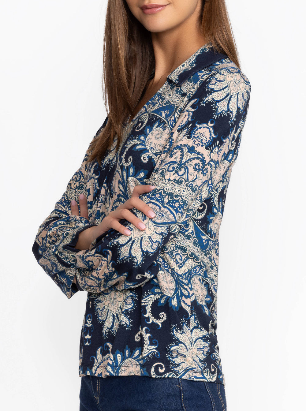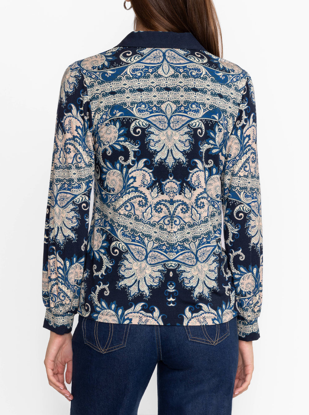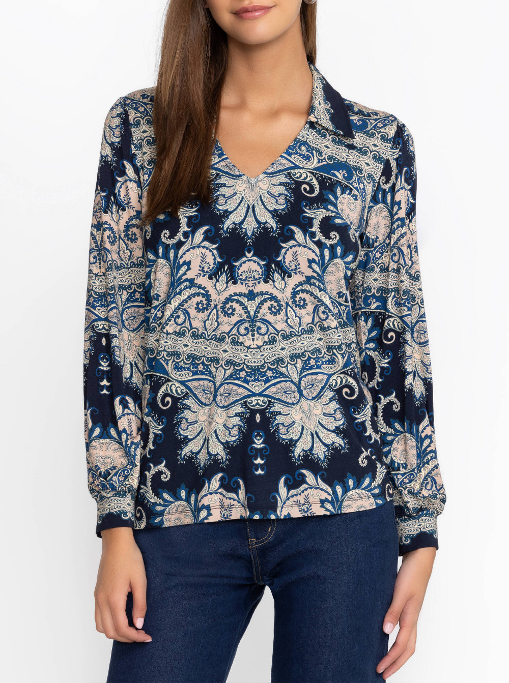 The Janie Favorite Puff Sleeve Polo - Roman Paisley Scarf Print