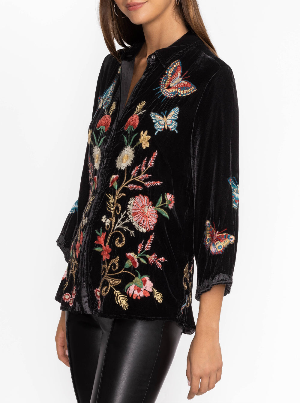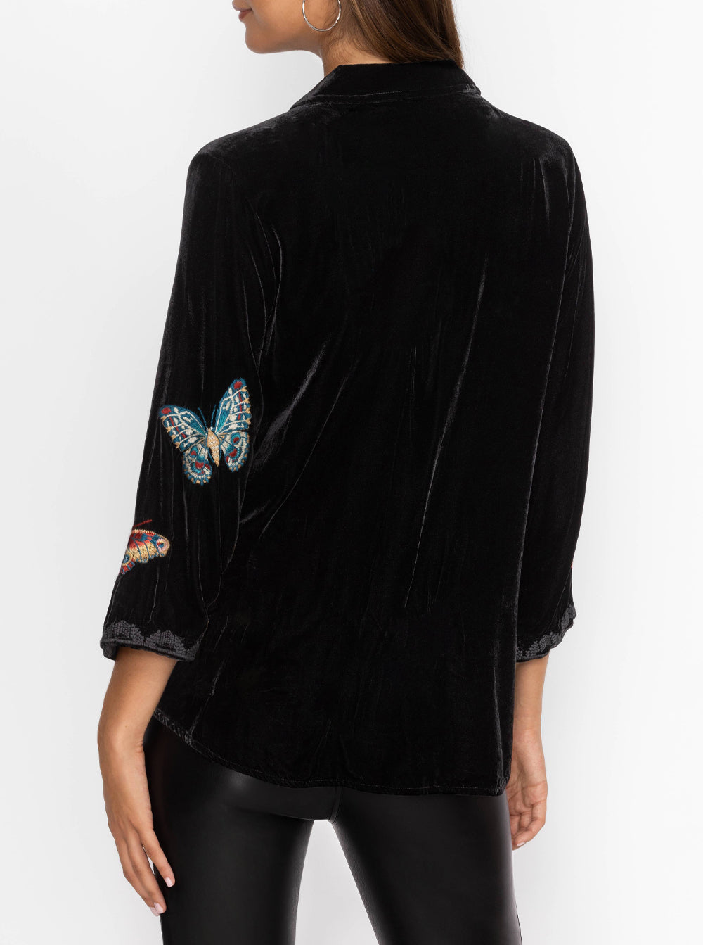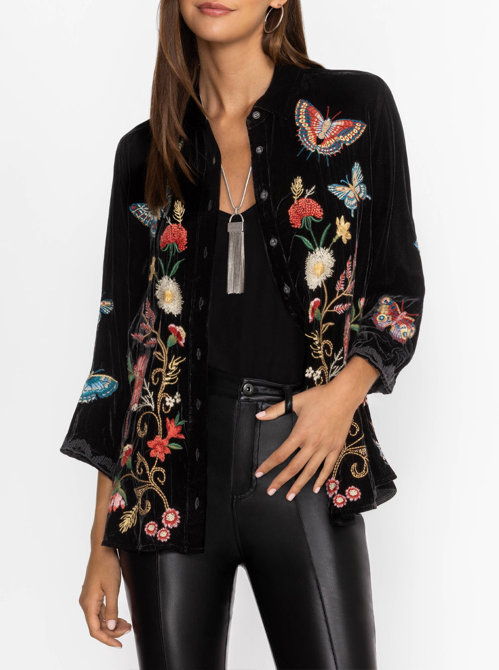 Embellished with vibrant embroidered detailing, the Luciana Velvet Kimono Sleeve Shirt is crafted from a luxurious silk blend.