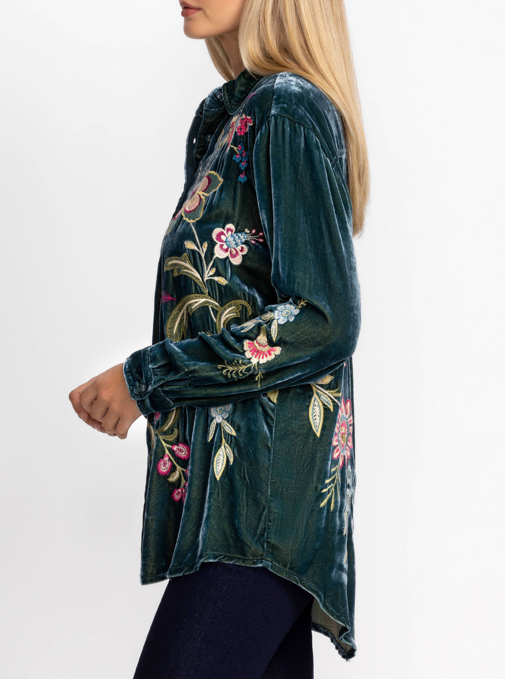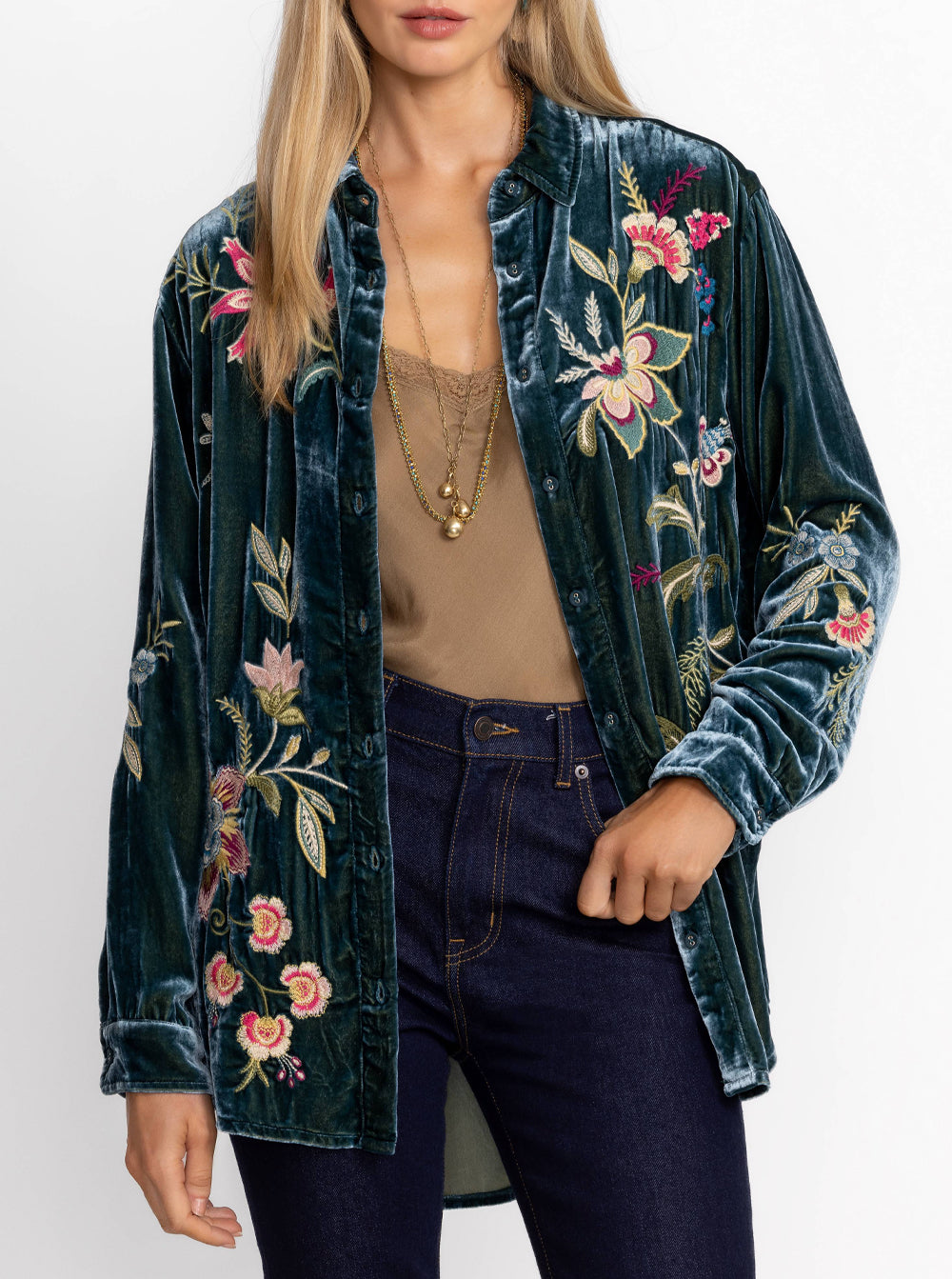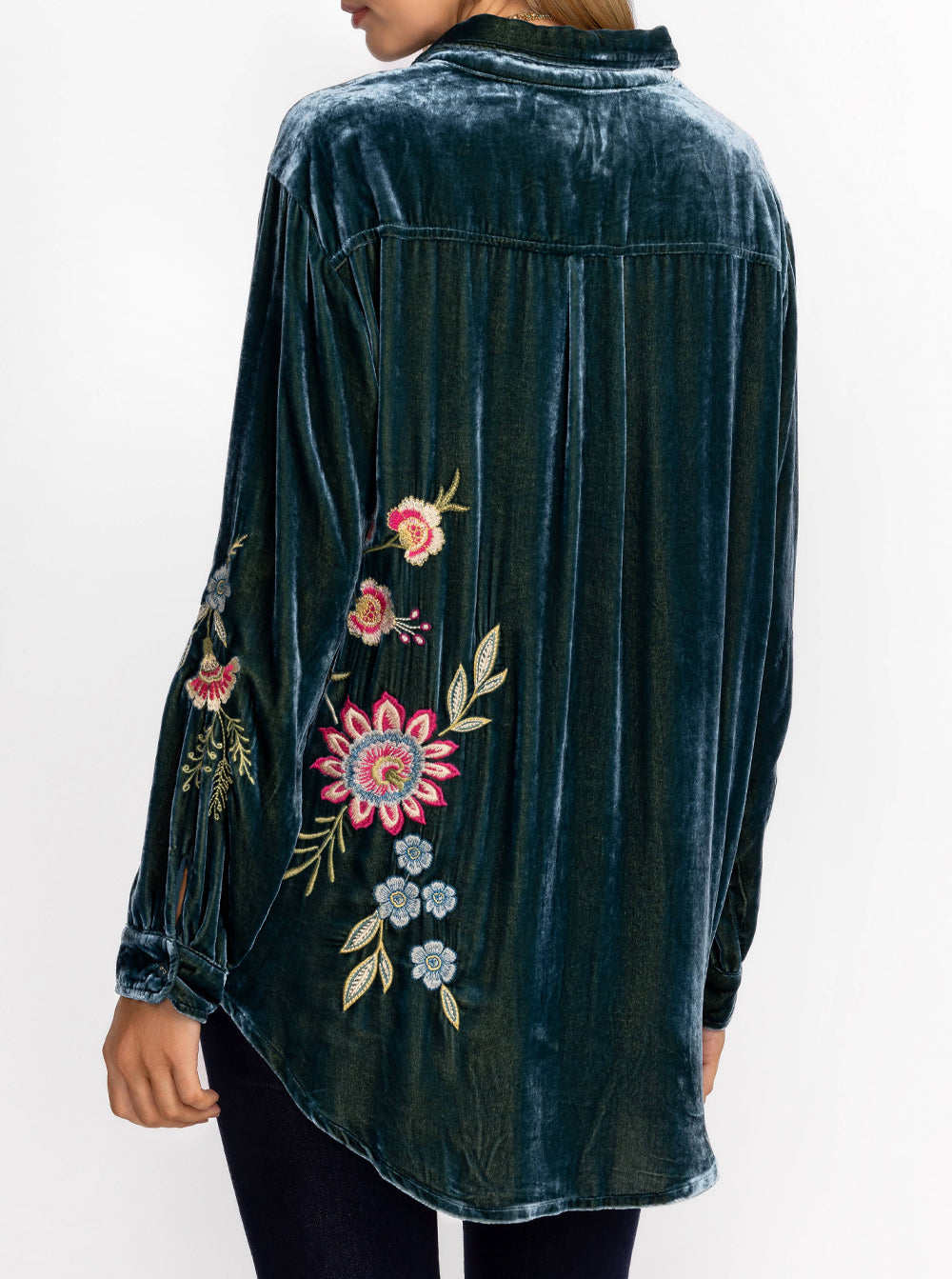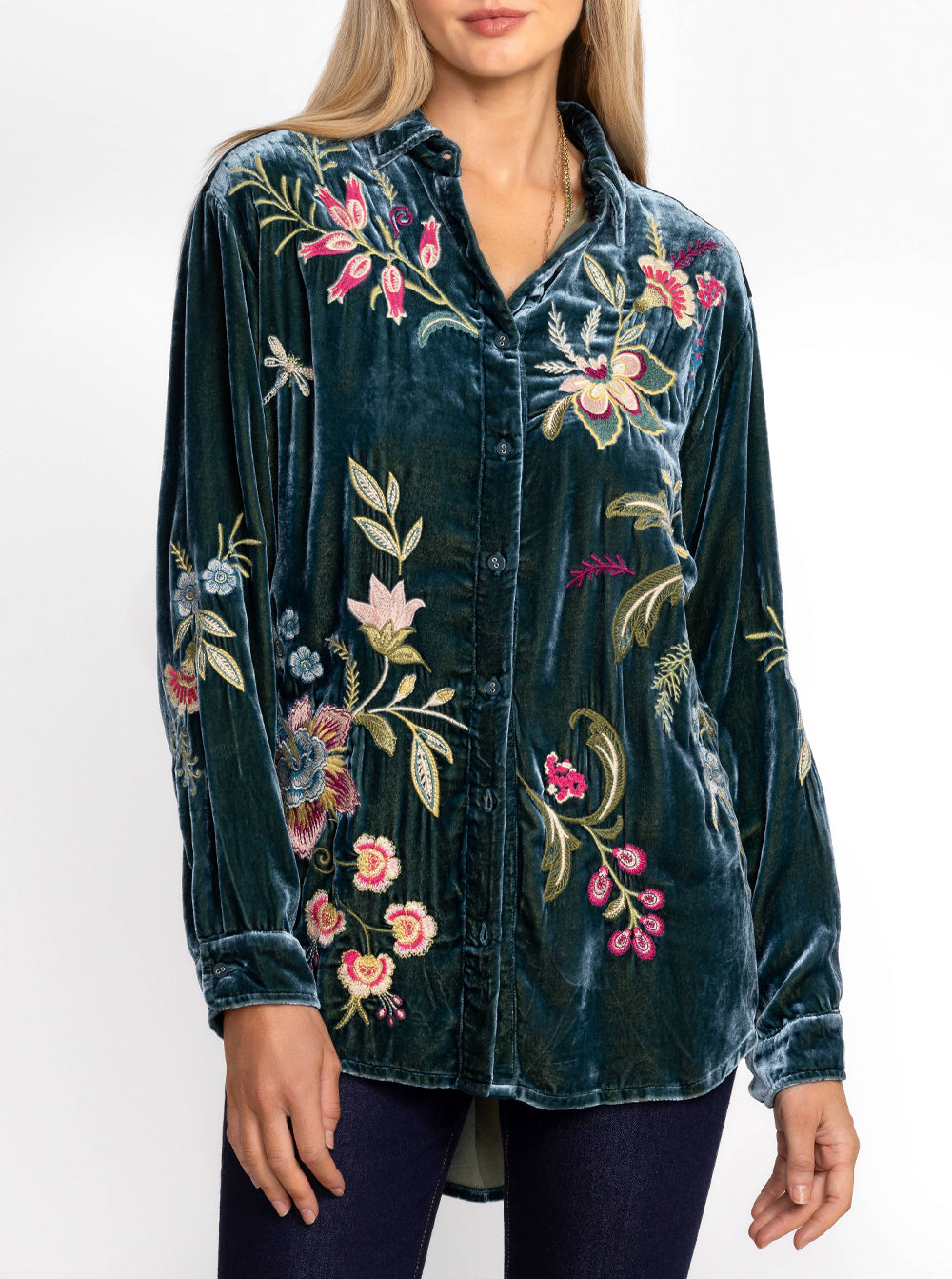 Featuring a classic collared button front and long sleeves, this luxurious top is embellished with intricate embroidered detailing for a splash of color.