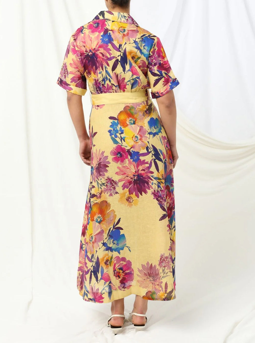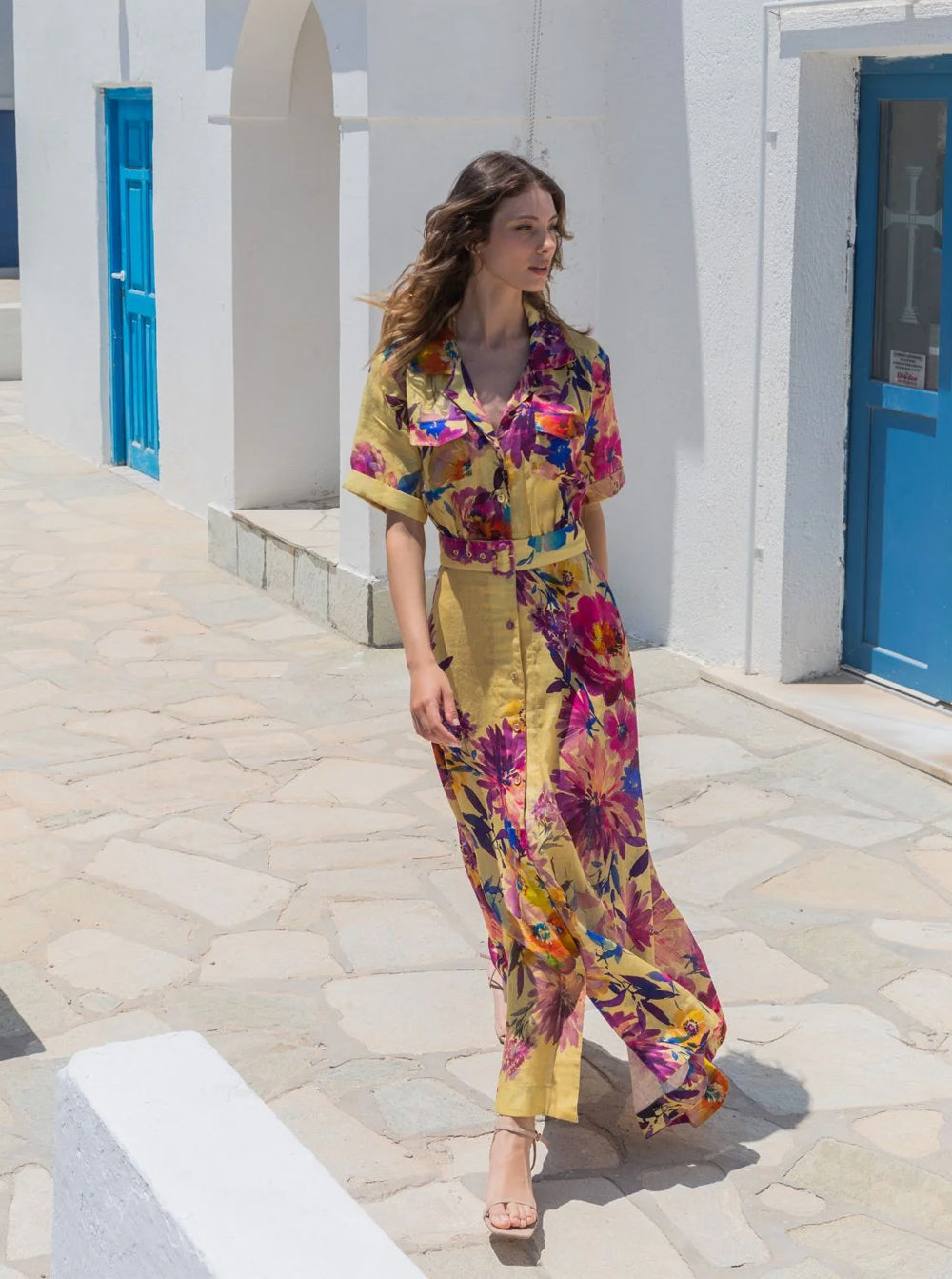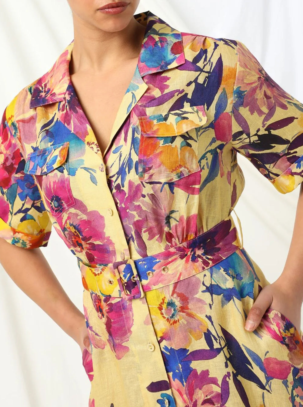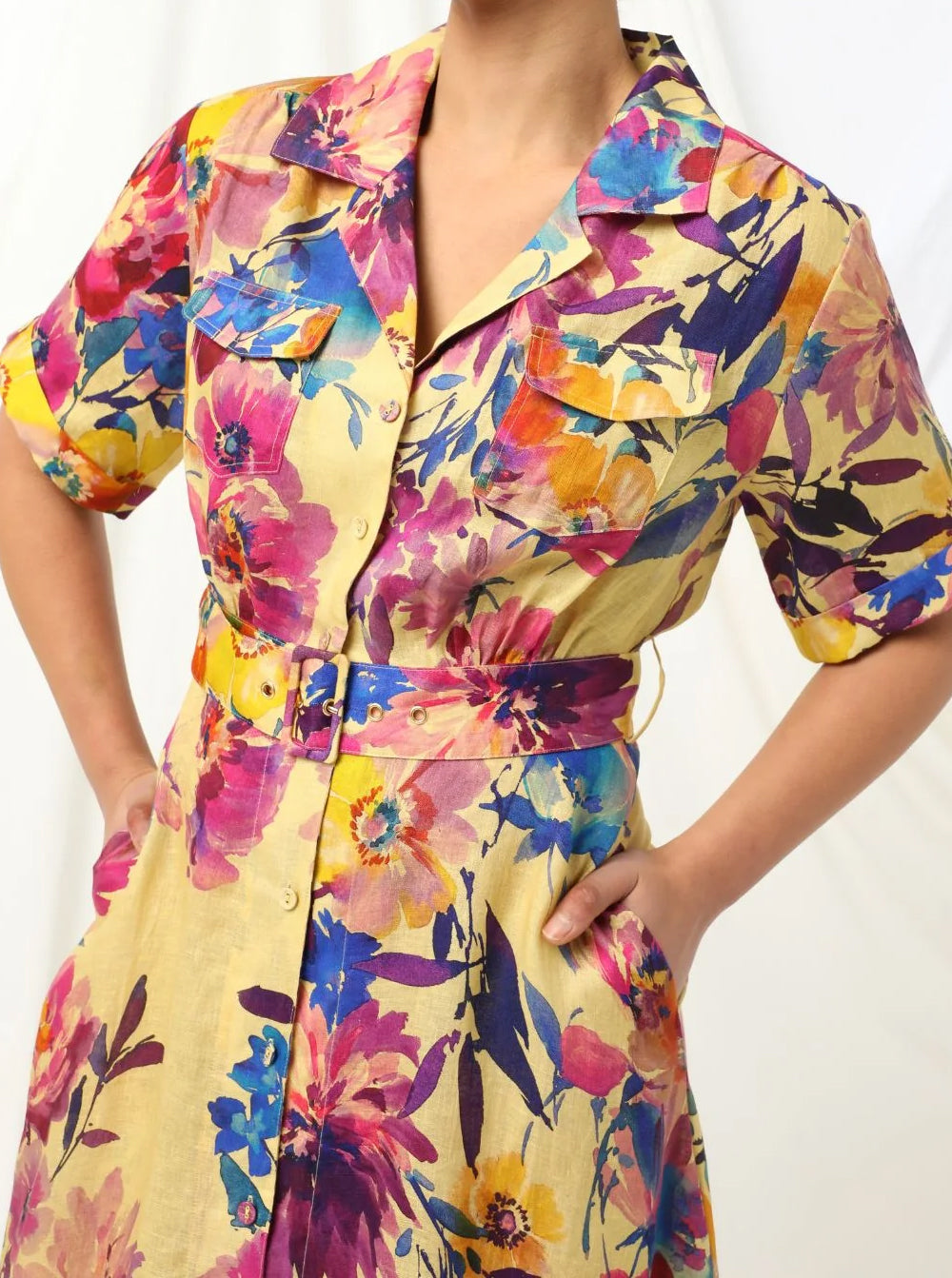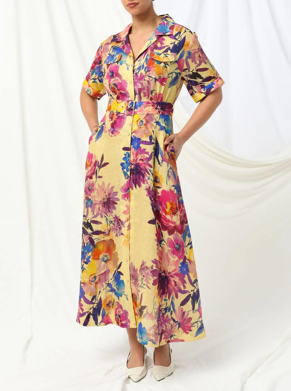 With short sleeves, a classic collared neckline, front pockets, and a button-down design, the Eliana Dress offers effortless style. Filled with vibrant, colourful florals, it's a real head-turner.