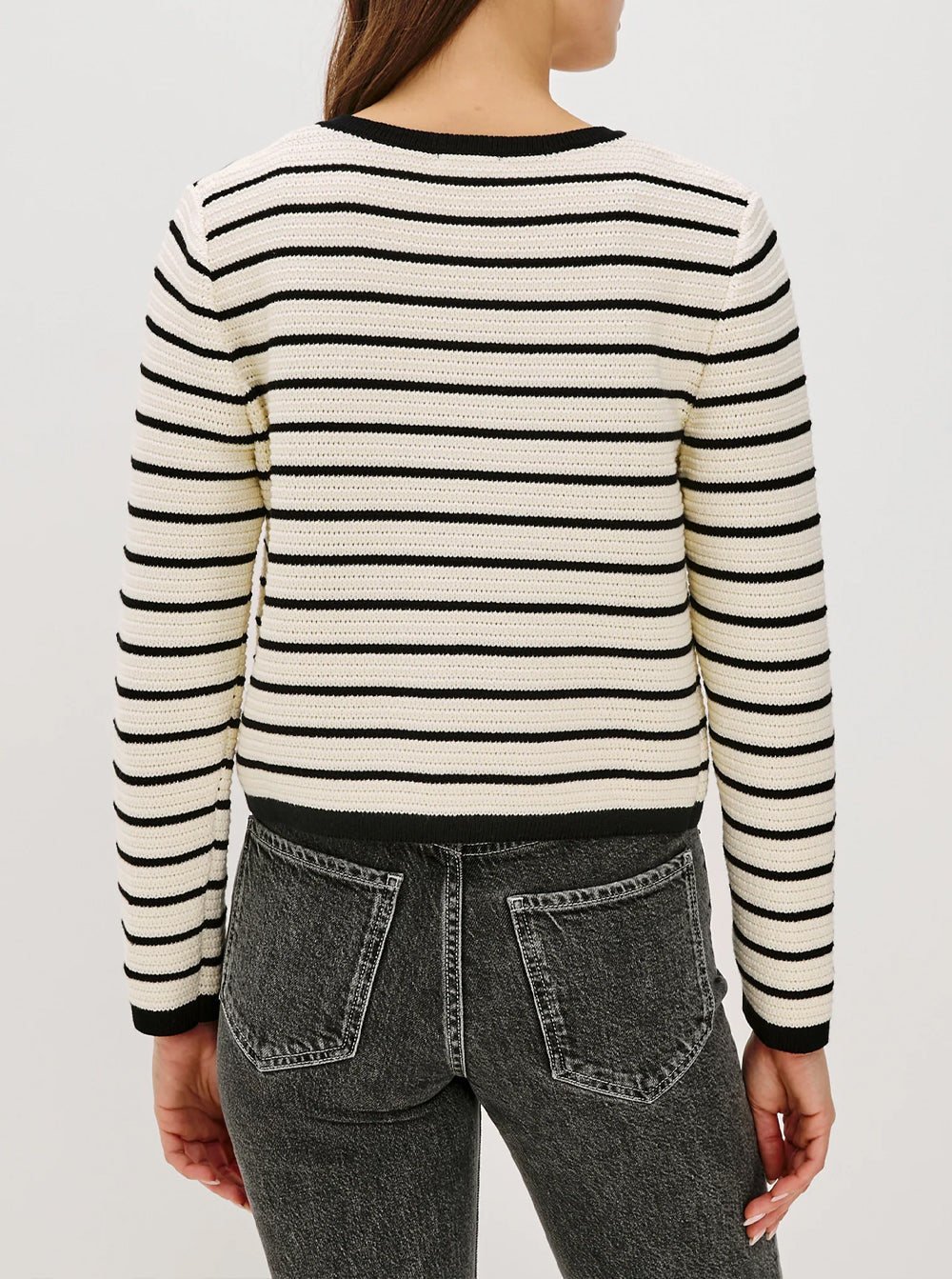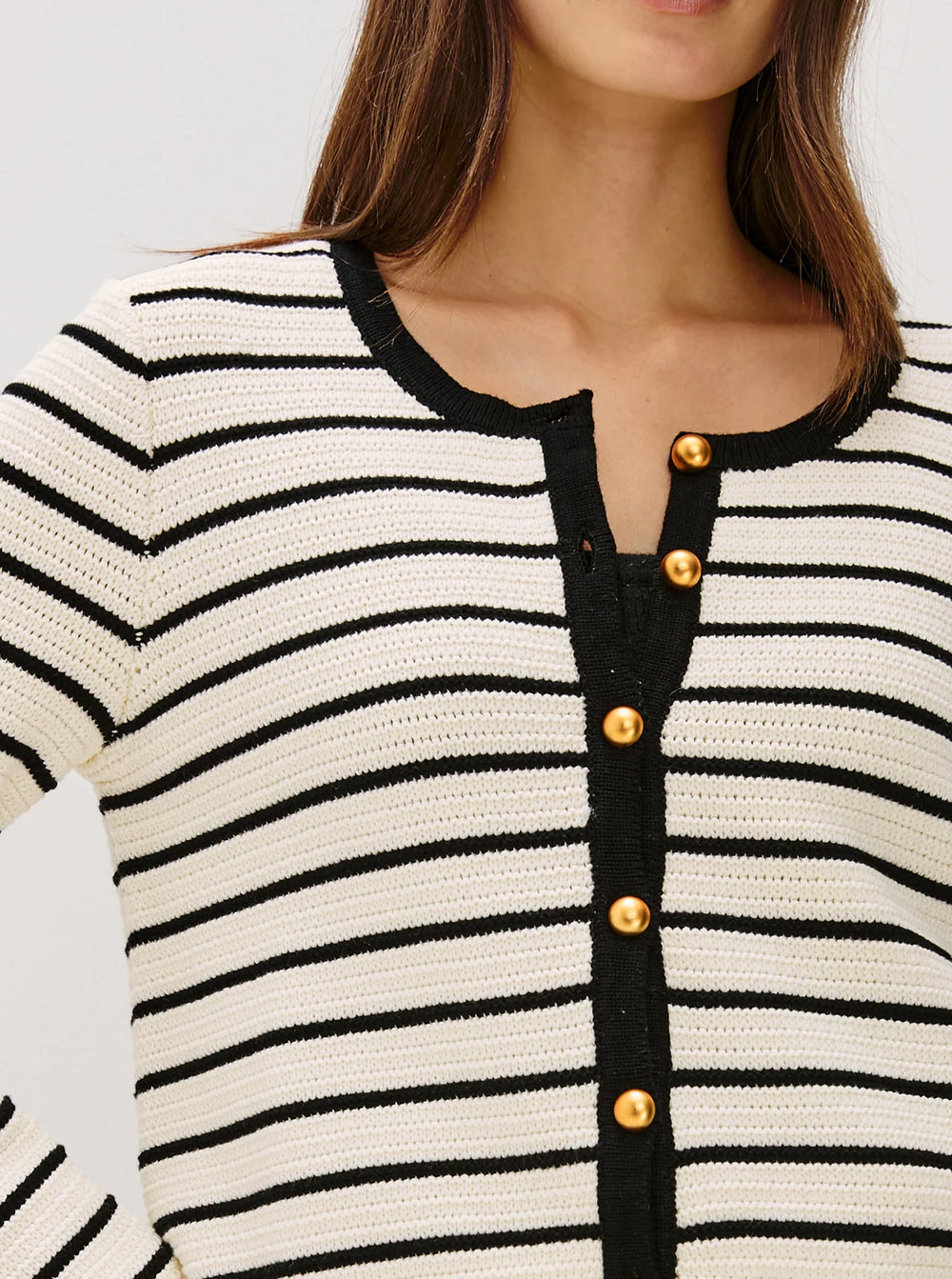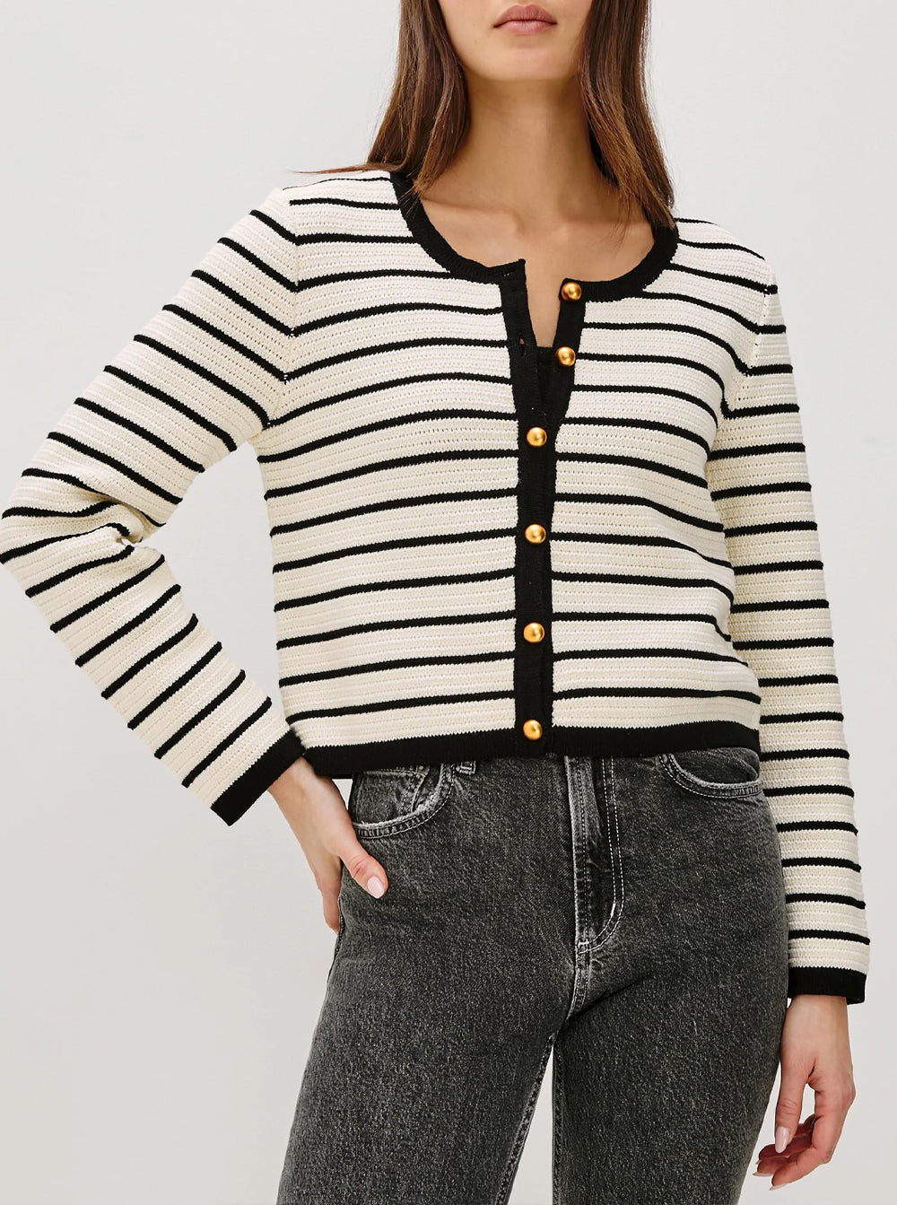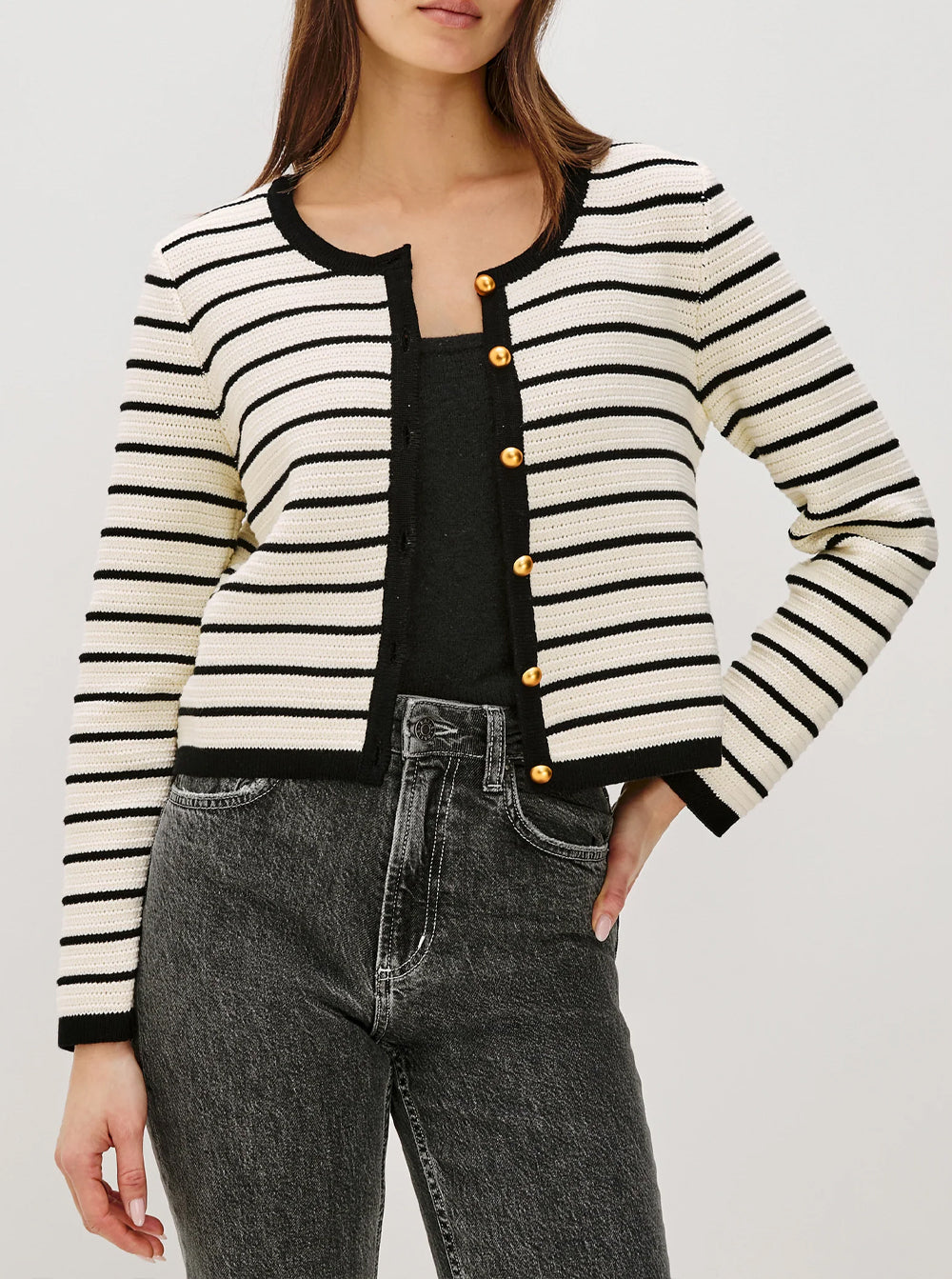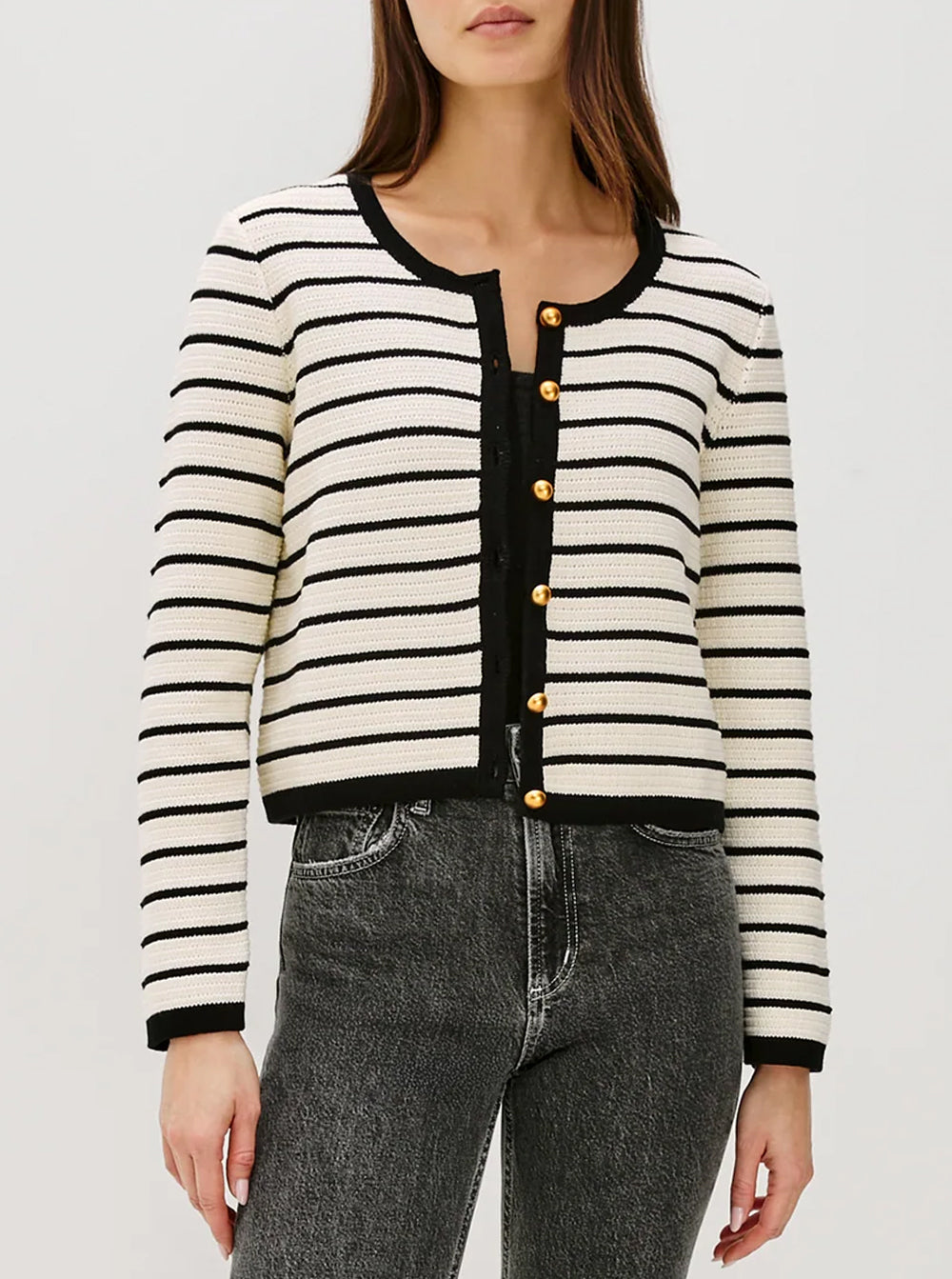 The Catania is a cotton cardigan with a boxy, cropped fit. It showcases contrast details at the sleeves and neckline, along with distinctive hardware buttons.