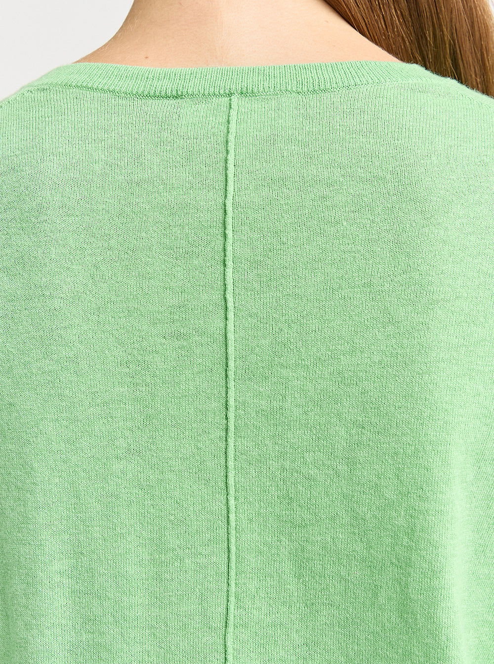 Finished with a wide, fine rib knit trim across the hem, wrists, and crew neck.
