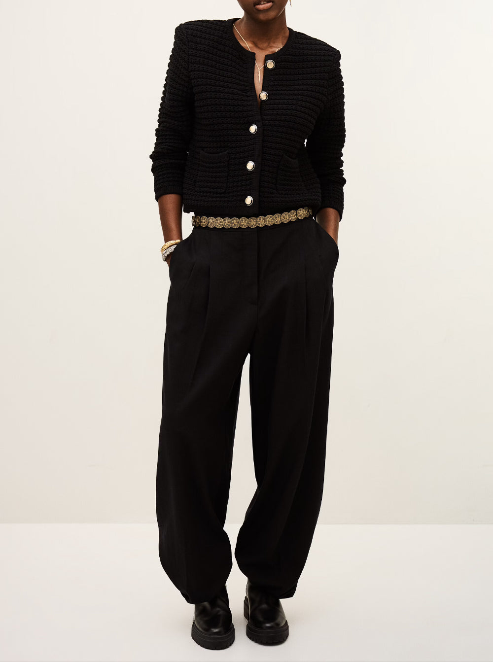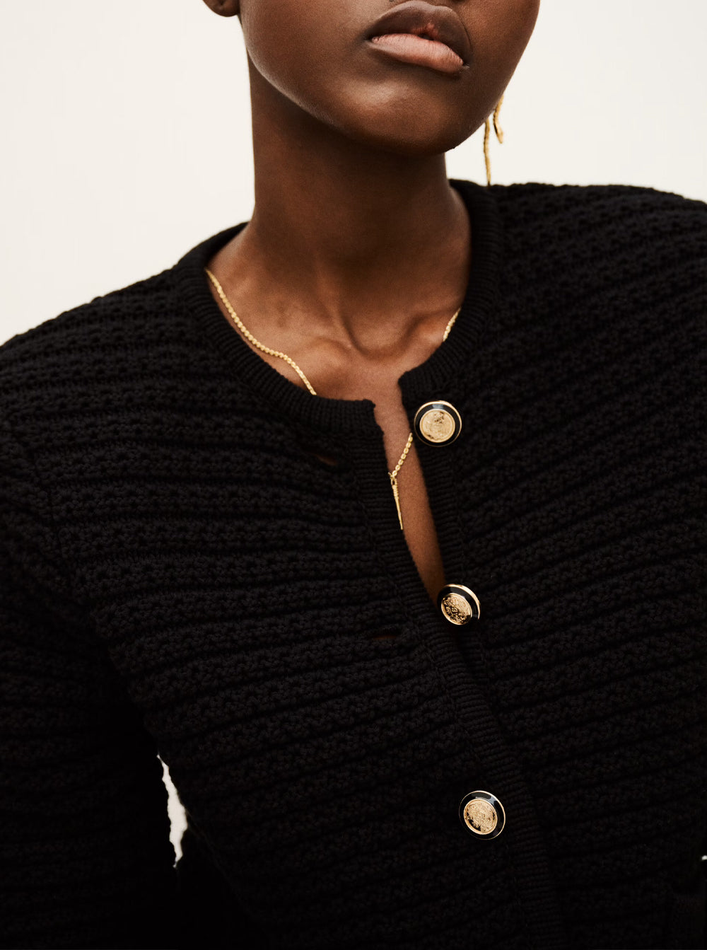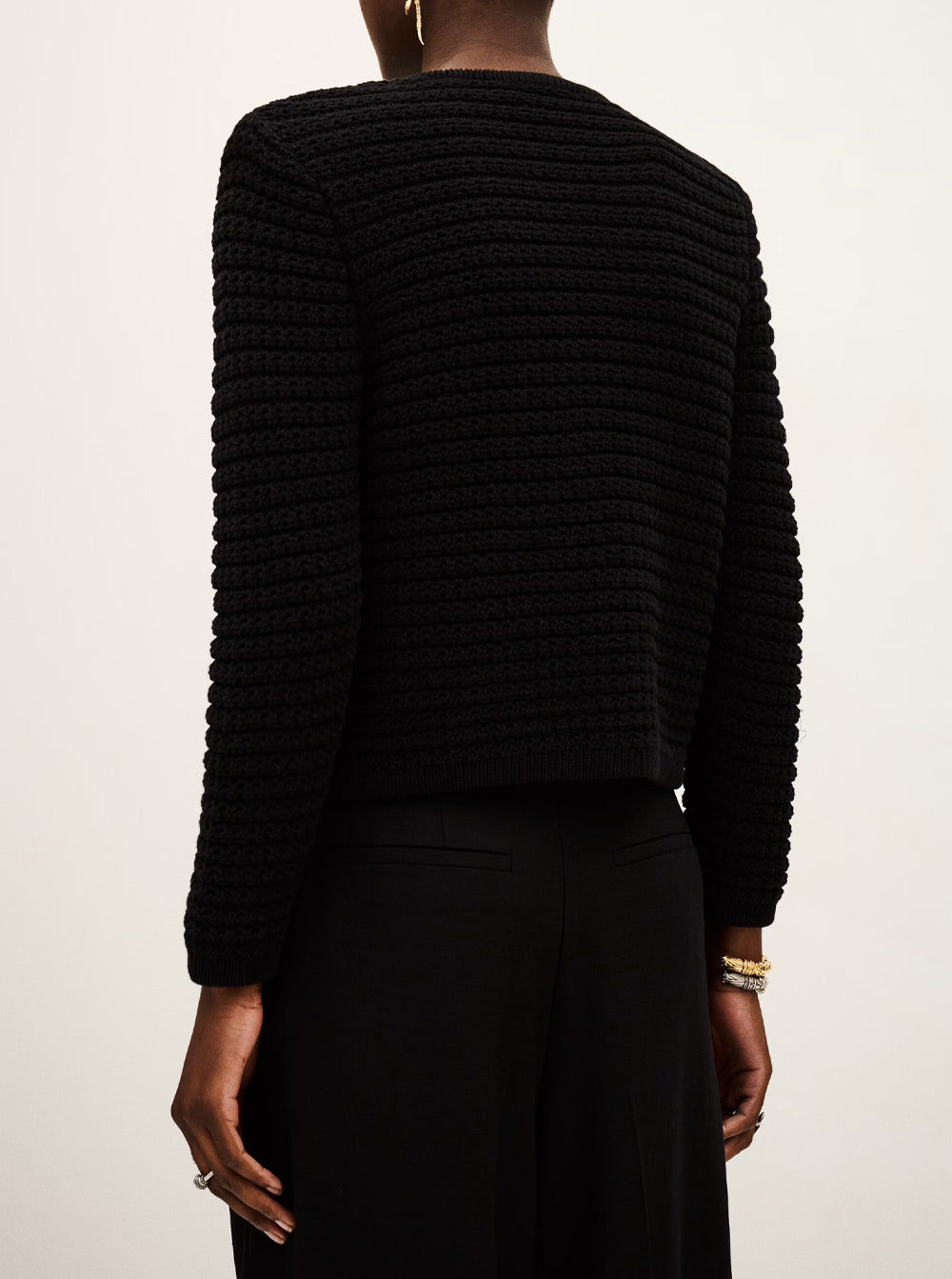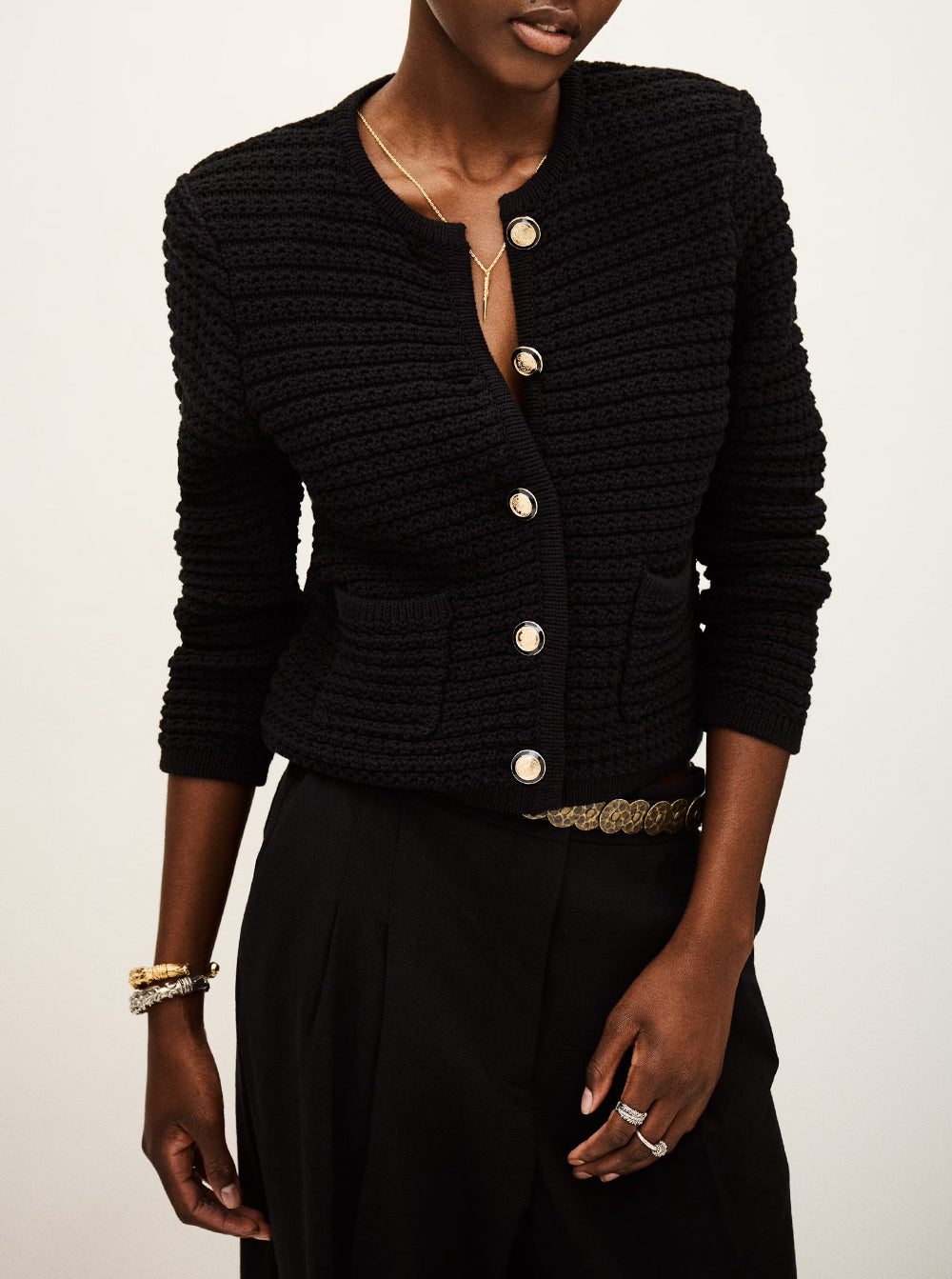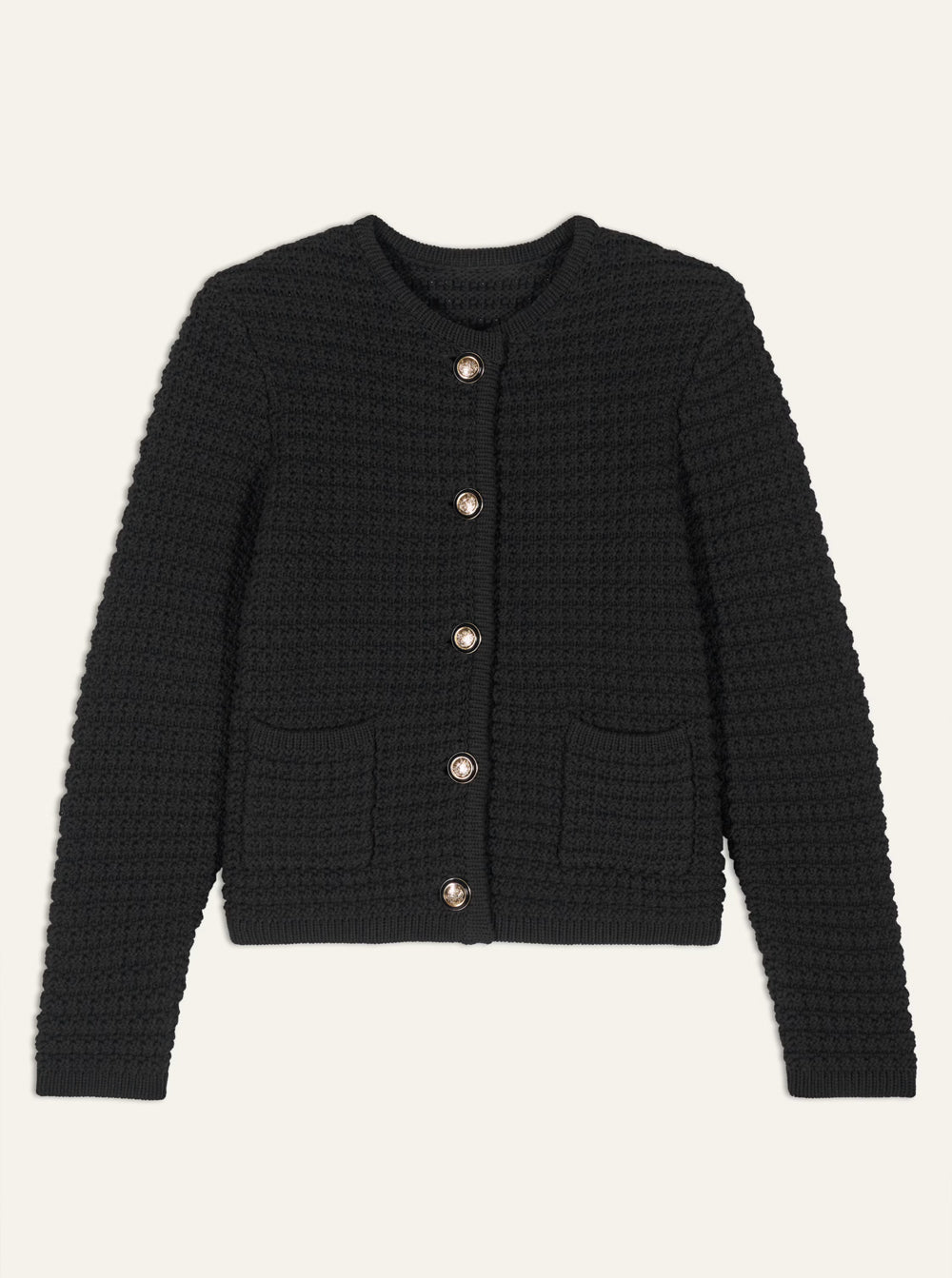 The GASPARD cardigan can be worn like a jacket. It has a round collar and long sleeves that reveal the wrists. As well as a cropped cut, it has an eye-catching textured ottoman stitch for a tweed effect. It fastens with black and gold-tone buttons, and the killer detail is that it has pockets!
