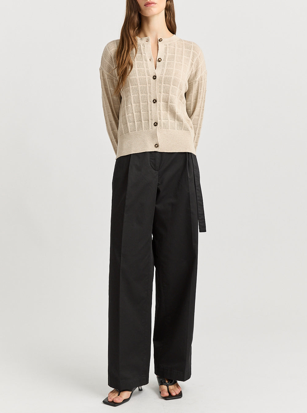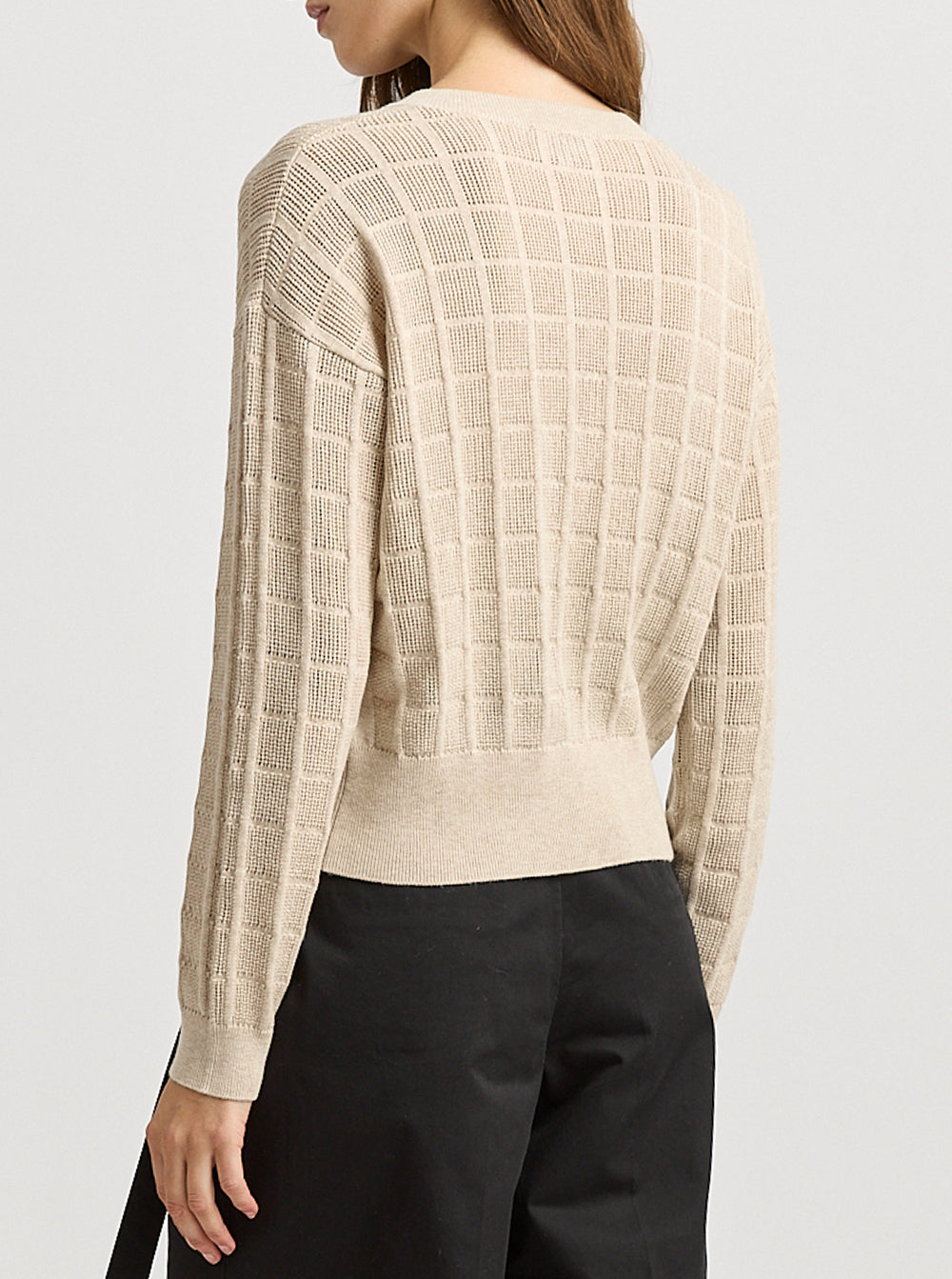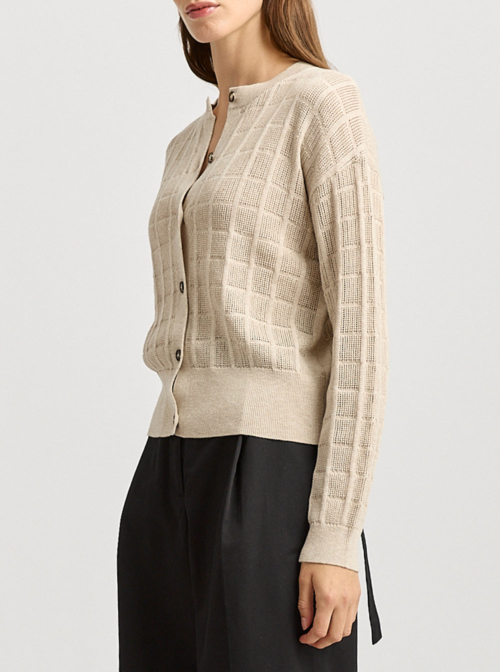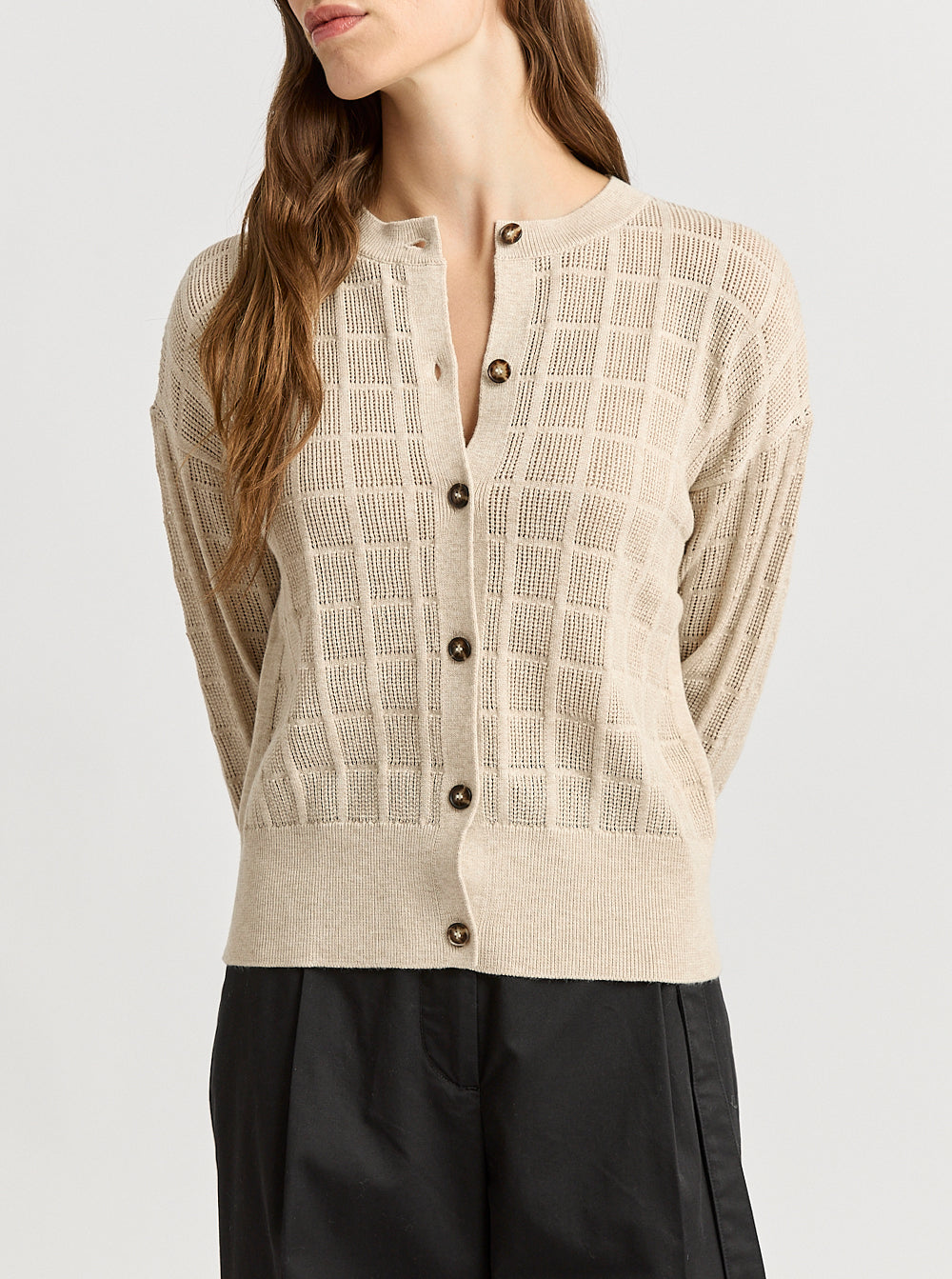 The Open Stitch Cardigan is a lightweight Merino-cotton knit with a perforated grid texture.