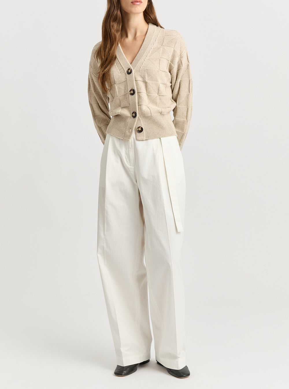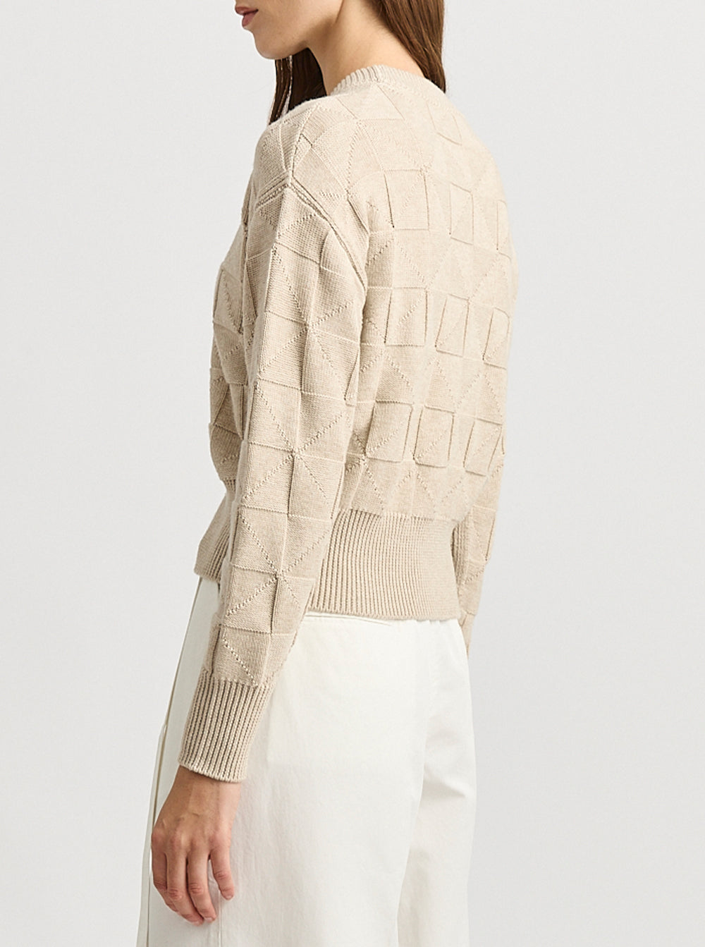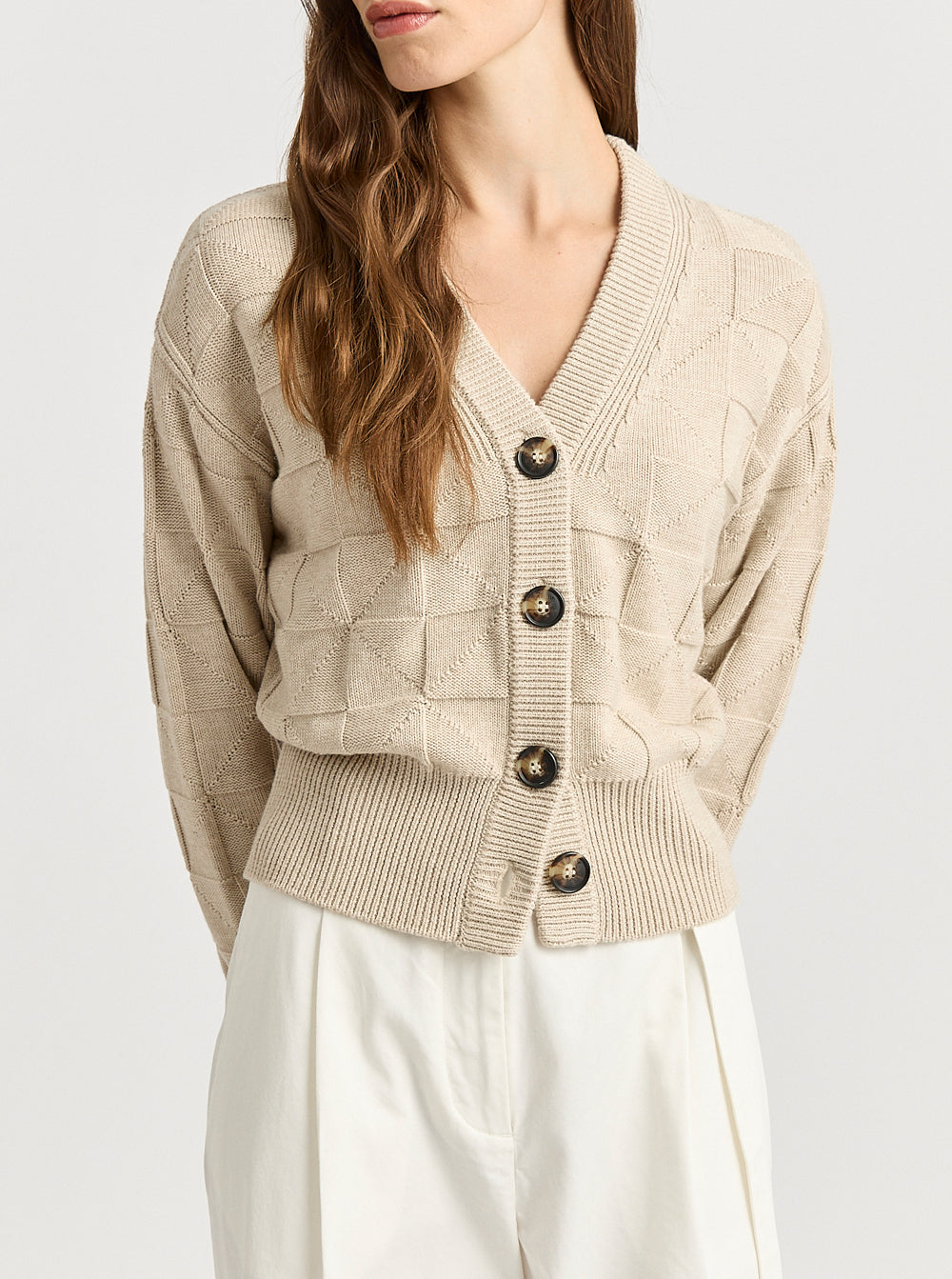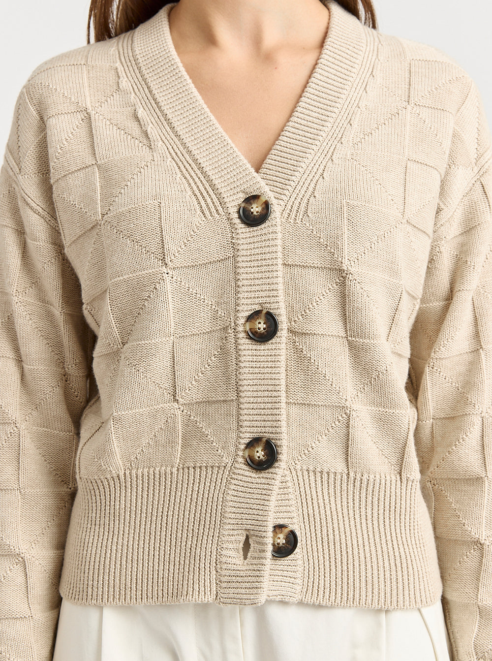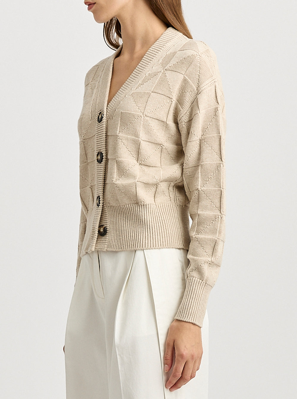 The Tile Stitch Cardigan is a lightweight Merino cotton knit textured with a raised and flat triangle pattern.