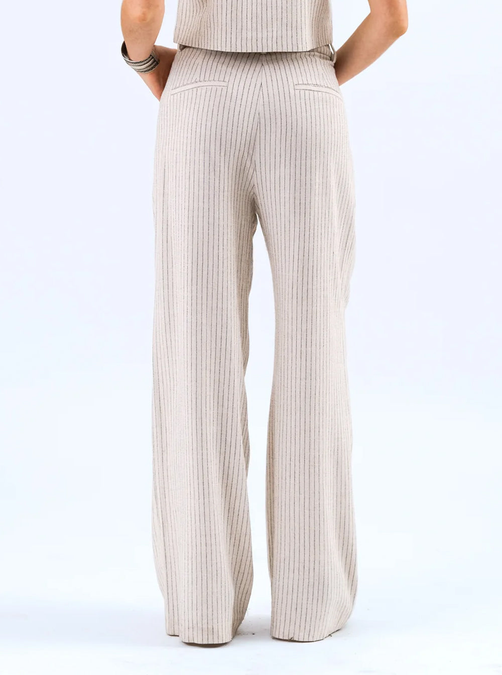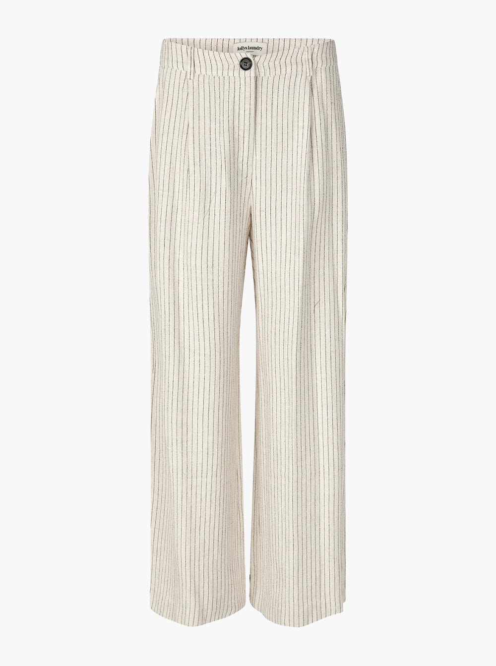The trousers feature fine pinstripes on a soft off-white background, giving them a sleek appearance that is perfect for both everyday wear and more formal occasions. The loose fit and high waist ensure a flattering silhouette, while the discreet pleats and black buttons add a classic touch. They come with belt loops, side pockets, and welt back pockets.