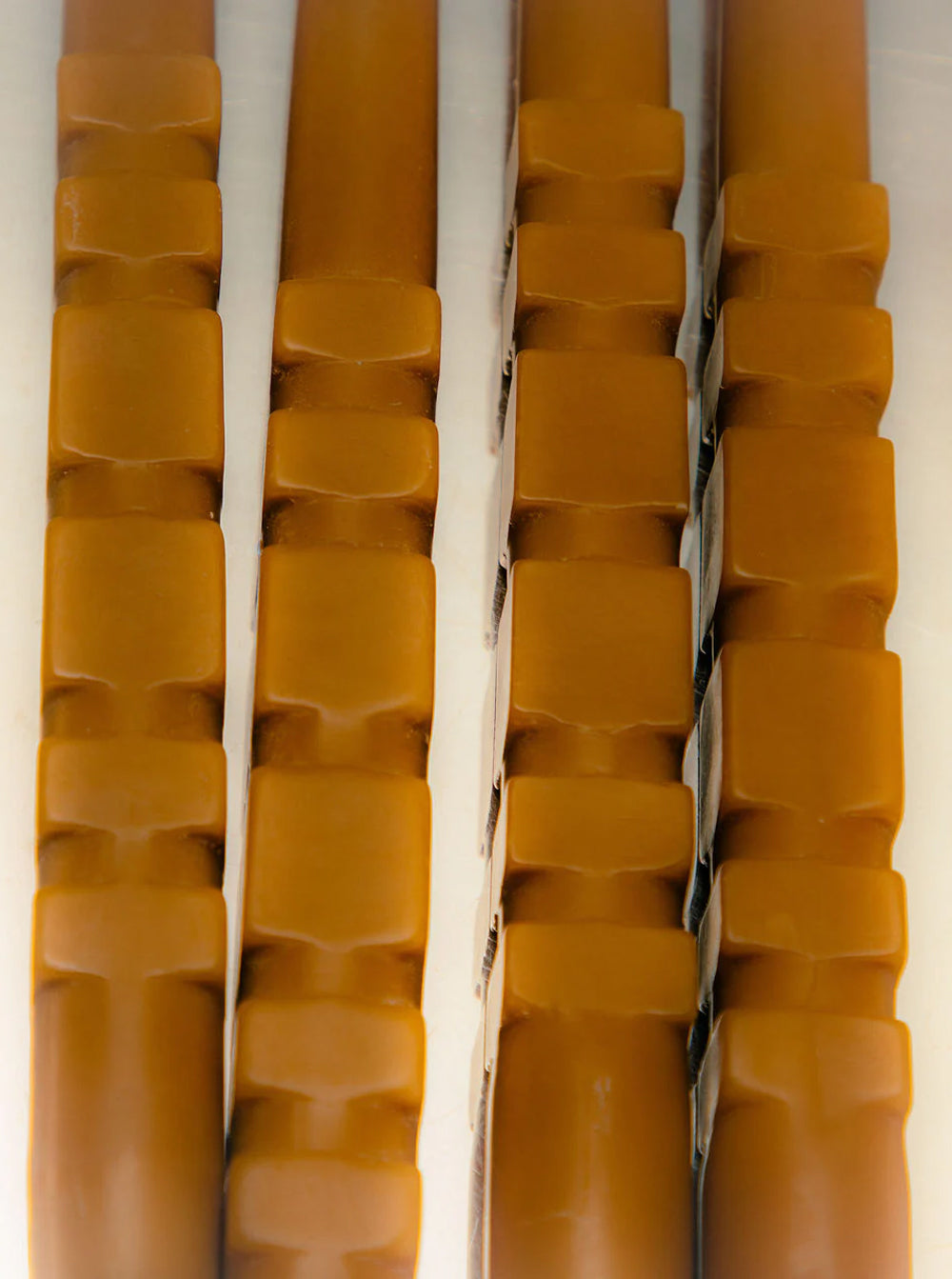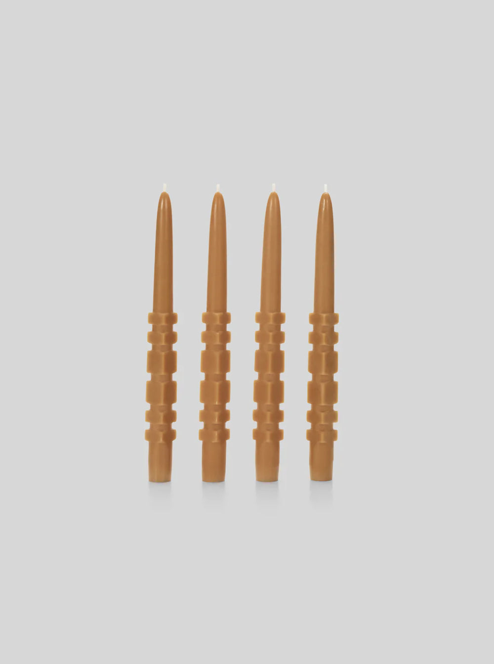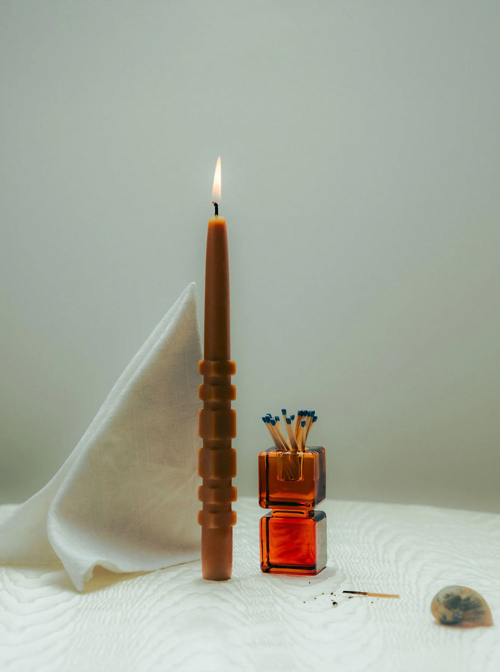 These textured candles take inspiration from the carved timber legs of a 1920s Spanish dining chair, adding a sculptural touch to any setting.