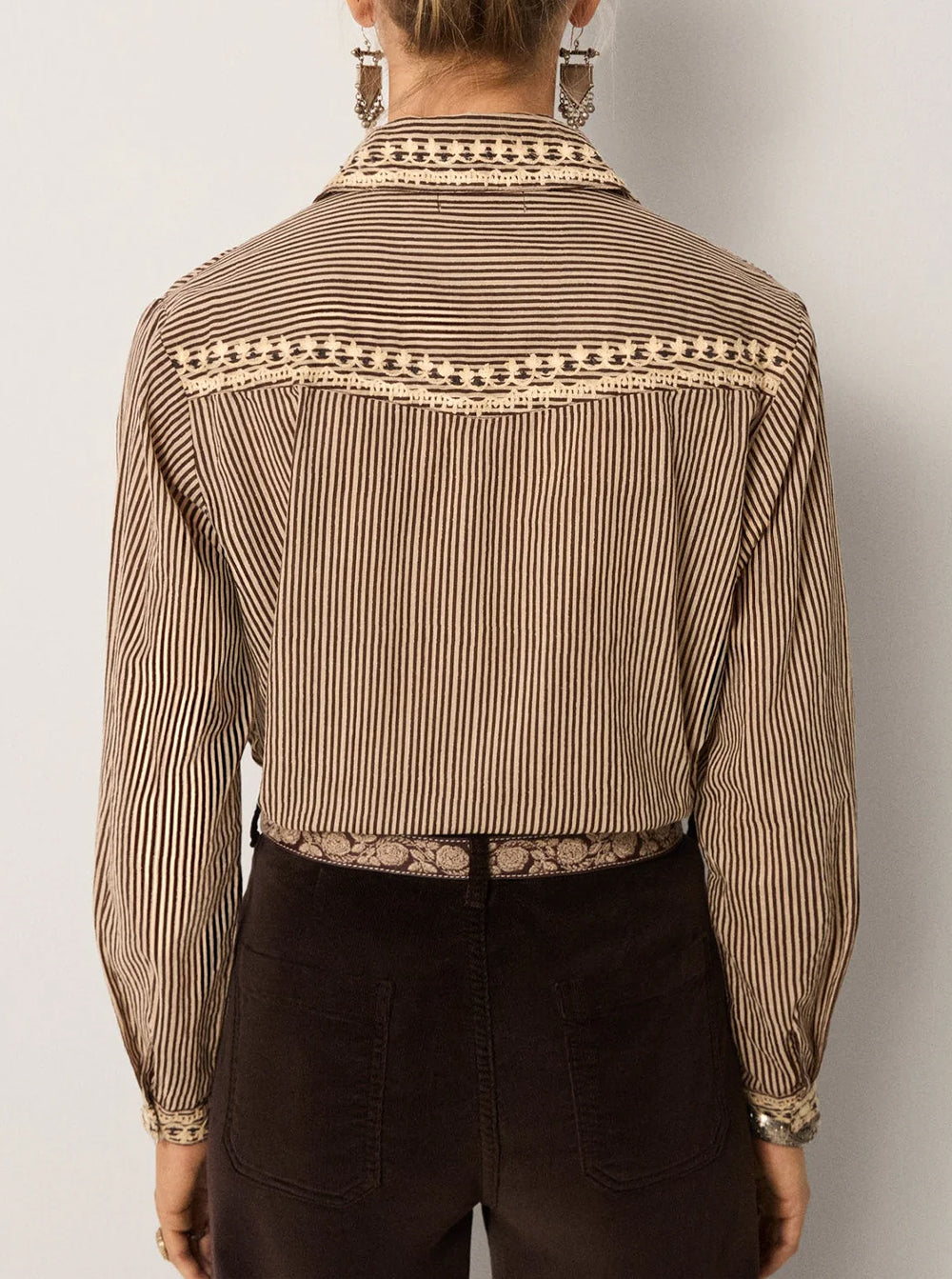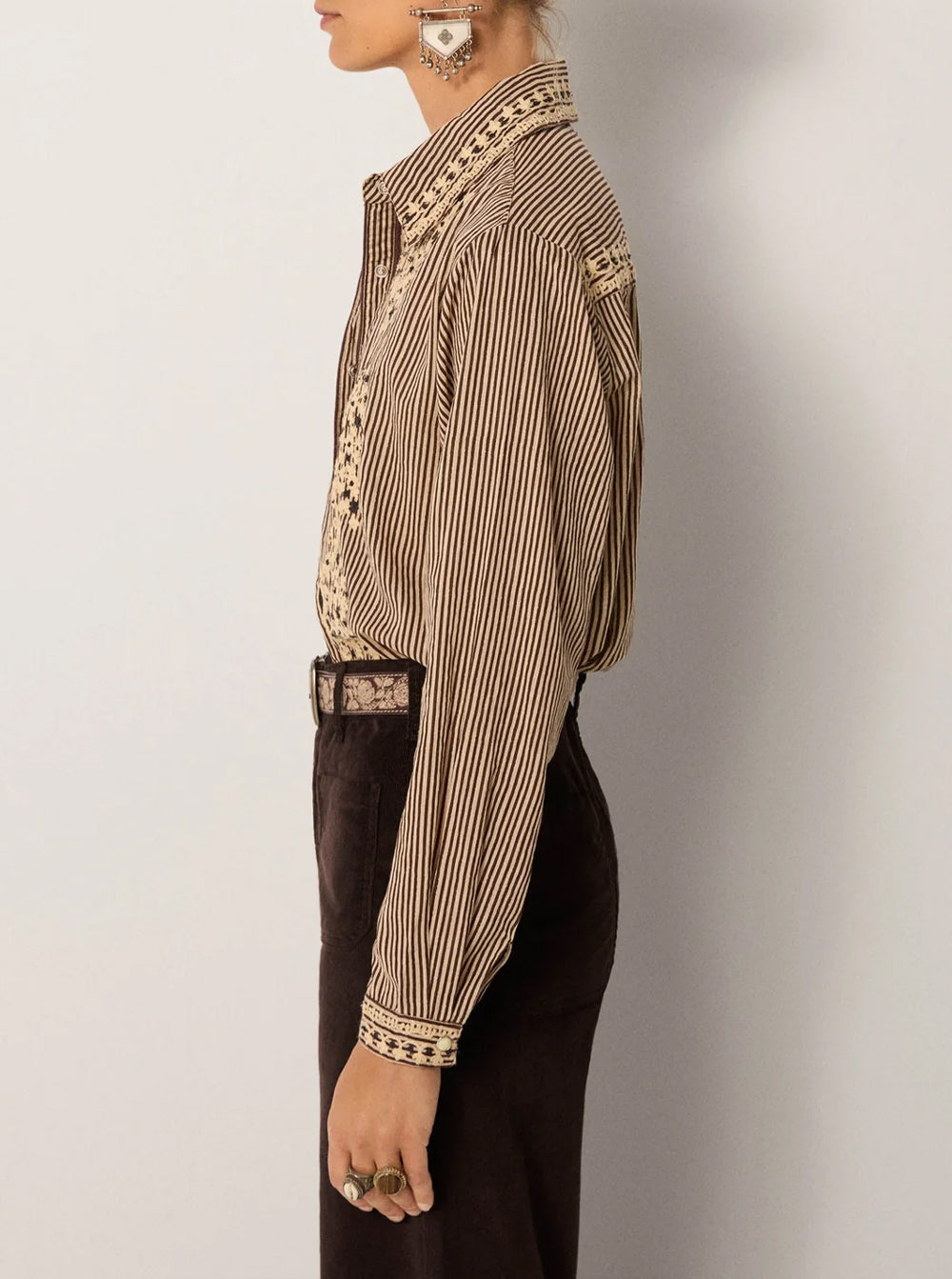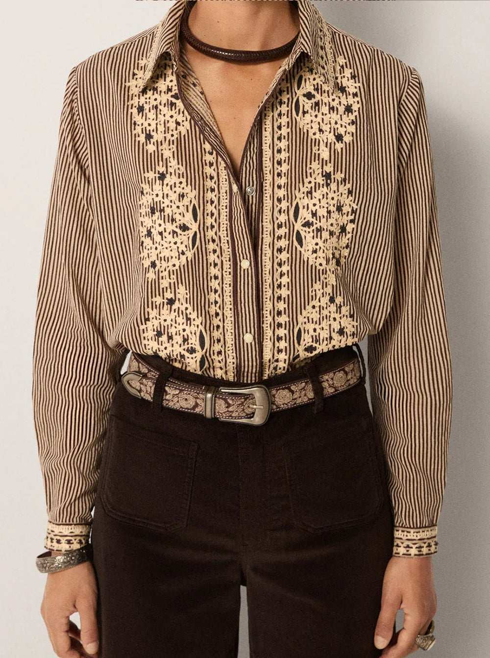 Light cotton slub, steady with fine stripes running through. The tone is warm tobacco, softened with natural texture. Embroidery blooms down the front with florals that recall pressed lace. The stitchwork sits bright against the muted base, quiet but defined.