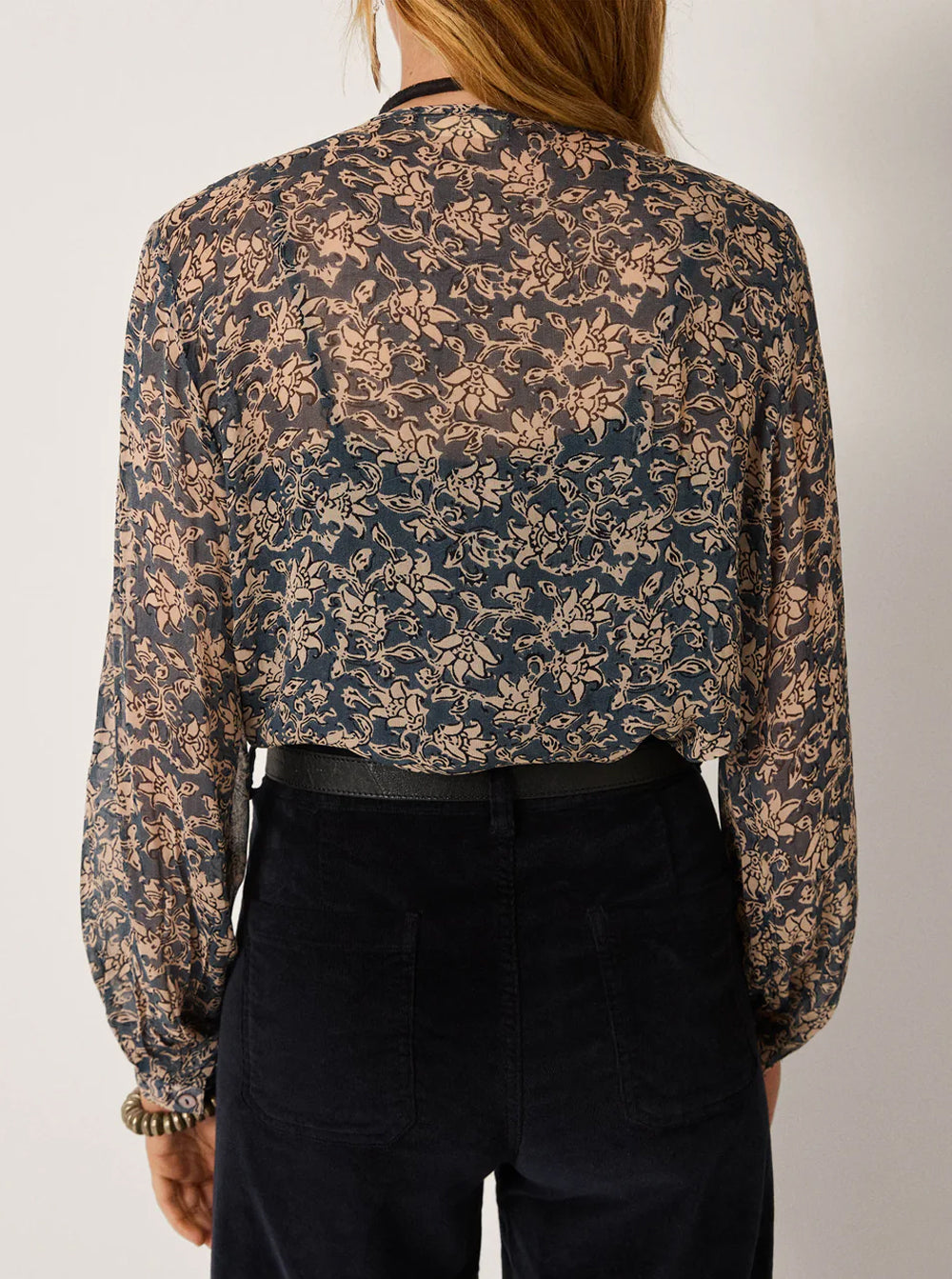 Styled here with navy corduroy and a leather belt — a play of softness against structure. Just as right worn loose over denim or tucked into tailoring, letting the print’s muted tones and textured ruffles speak for themselves.
