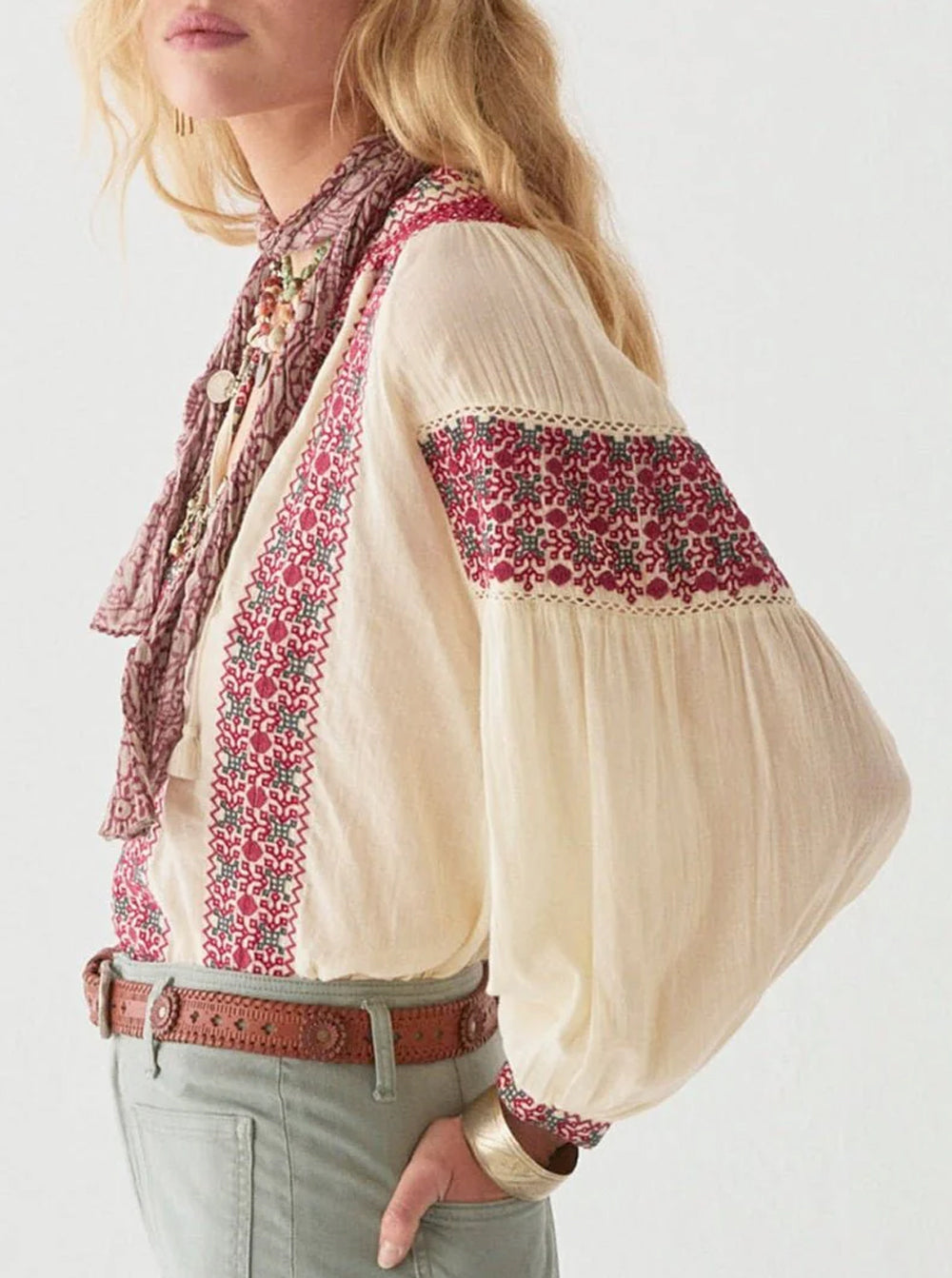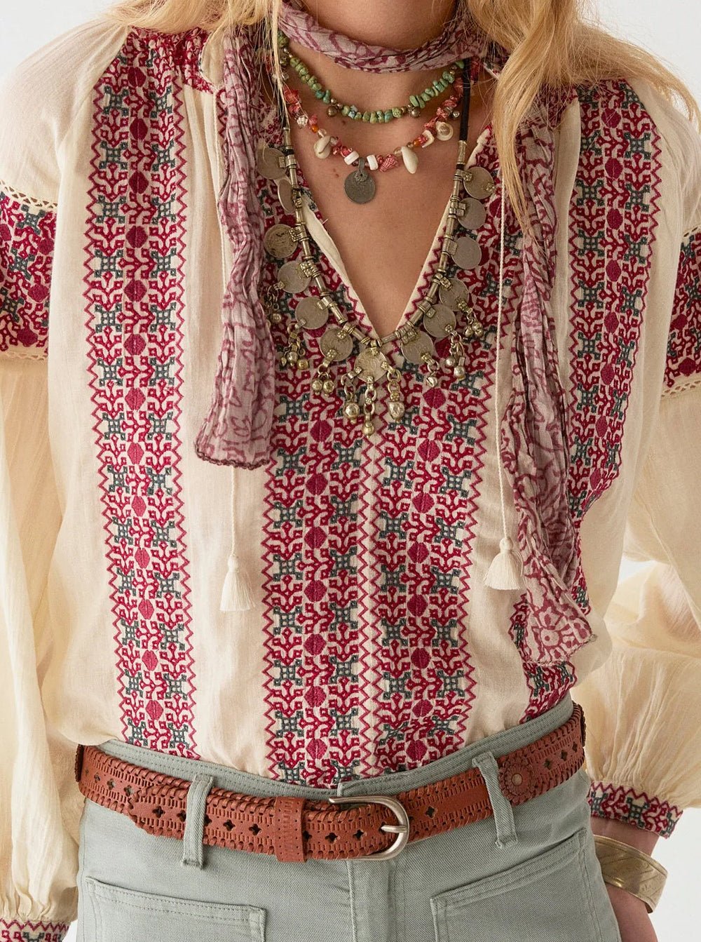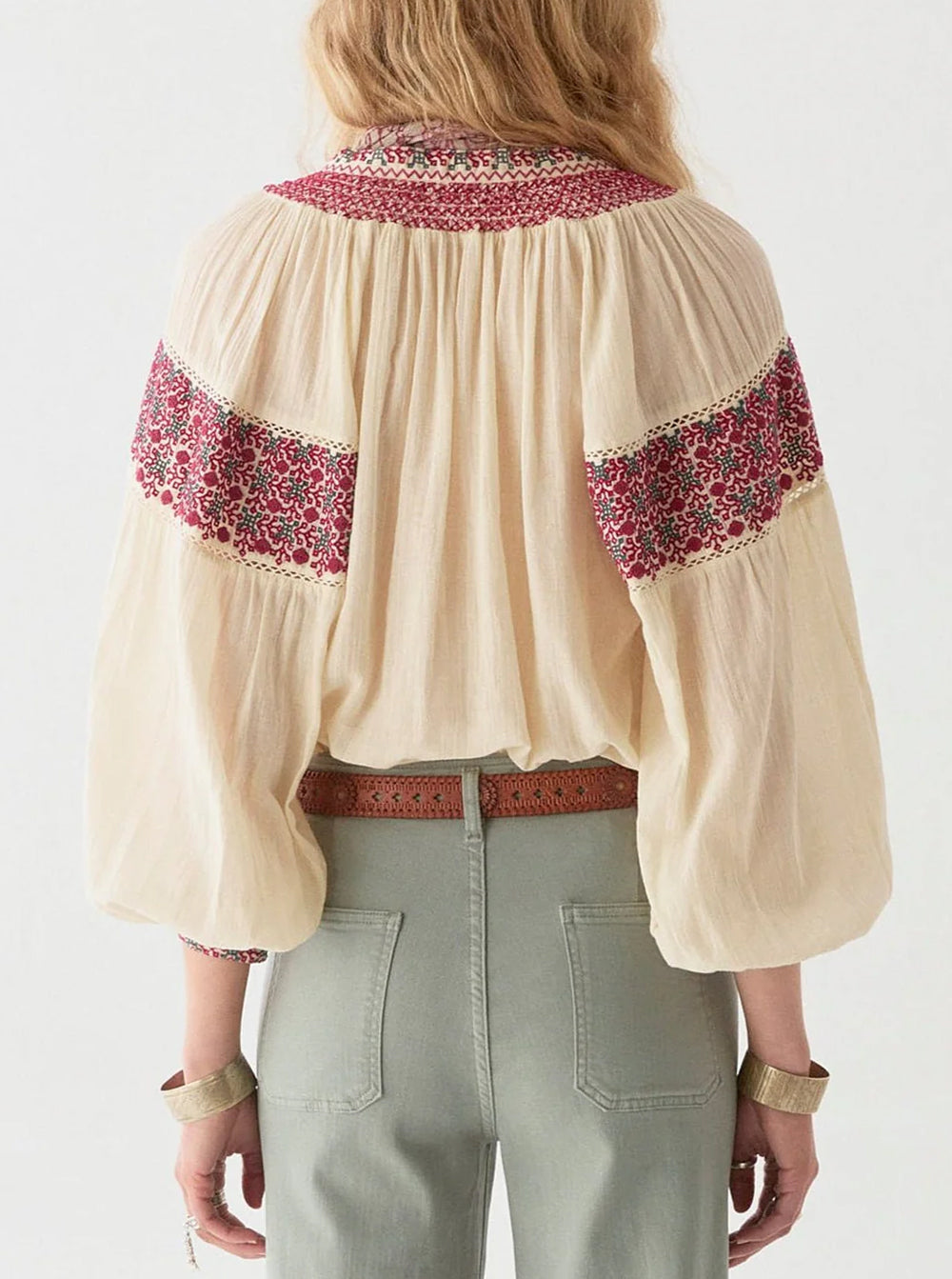A tapestry of nostalgia and rebellion, the Dion Blouse blends romanticism with a wild streak. The airy cotton gauze sets the stage for intricate floral embroidery that snakes down the front and sleeves—soft in detail, bold in presence. The red wine hue, deep and full-bodied, nods to late-night storytelling and sun-faded heirlooms.