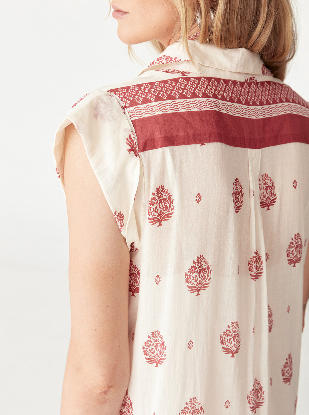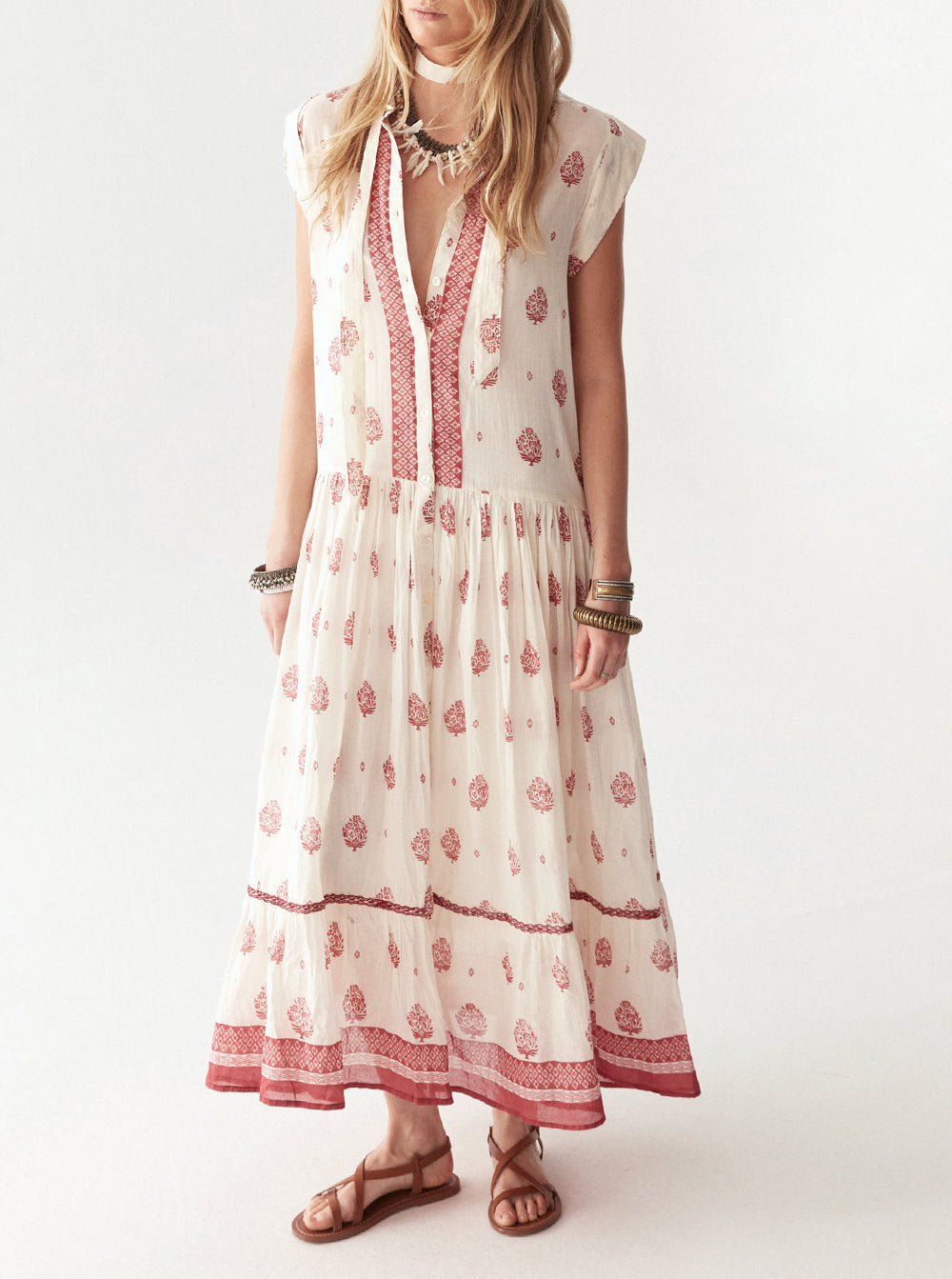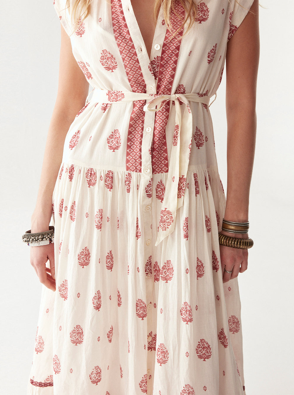 Drenched in the Indian Fragola print, this dress merges heritage artistry with a modern edge. The print—a rich blend of hand-drawn floral motifs and intricate borders—carries a sense of tradition, reimagined in a sun-washed strawberry red.