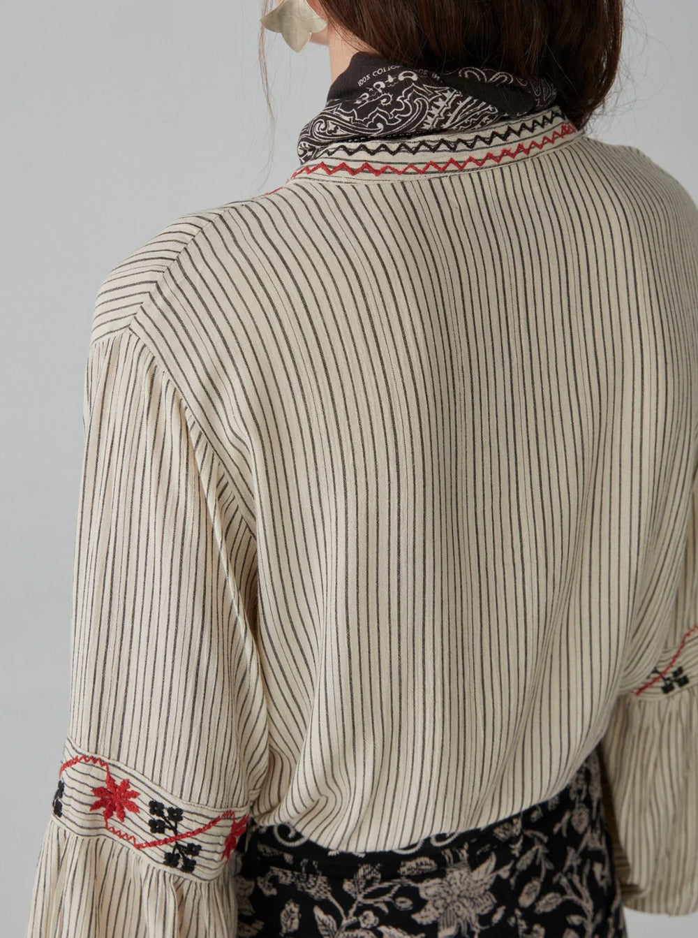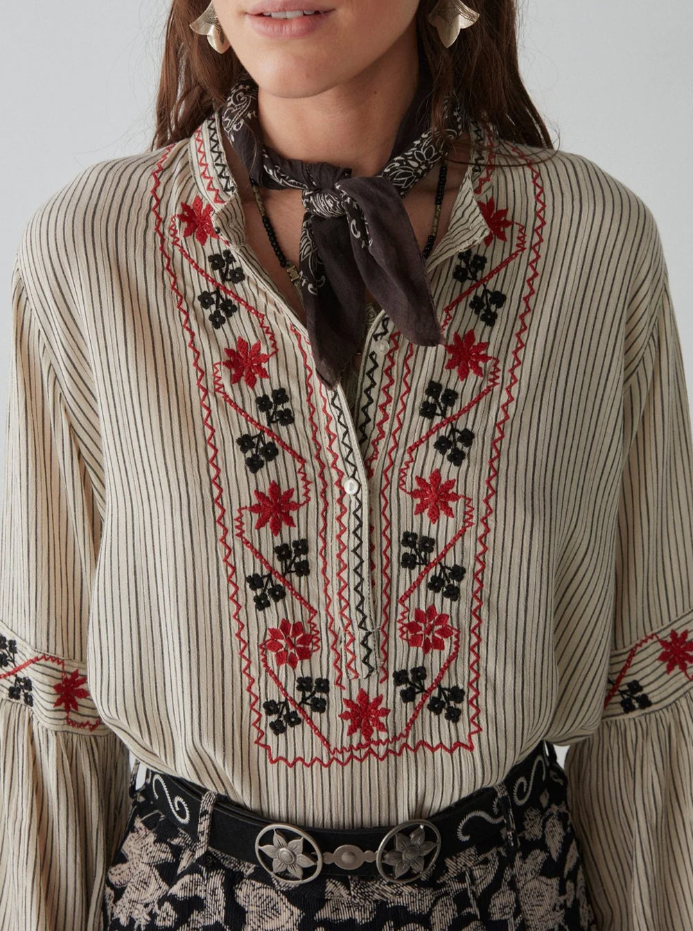 The intricate red and black embroidery adds a pop of rebellion against the cream backdrop, while the billowing sleeves echo a sense of freedom.