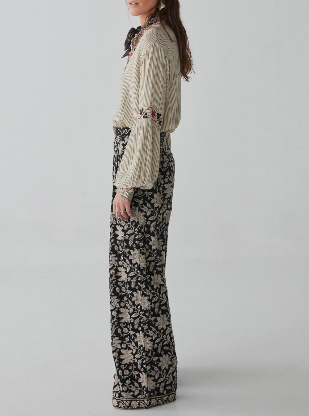 Crafted from special fabric, this blouse sports pinstripes with attitude and floral embroidery that’s more rock-and-roll than romantic.