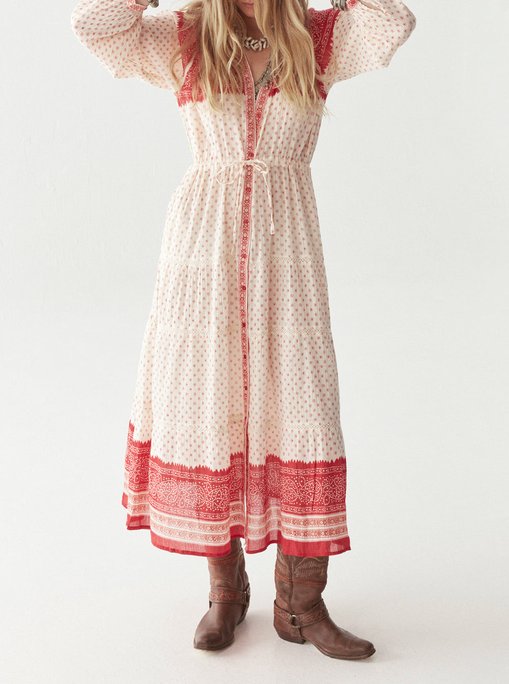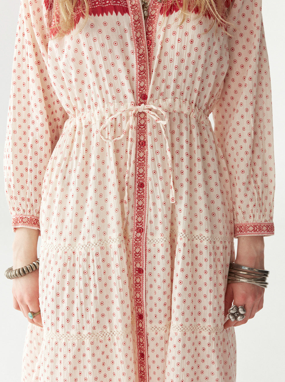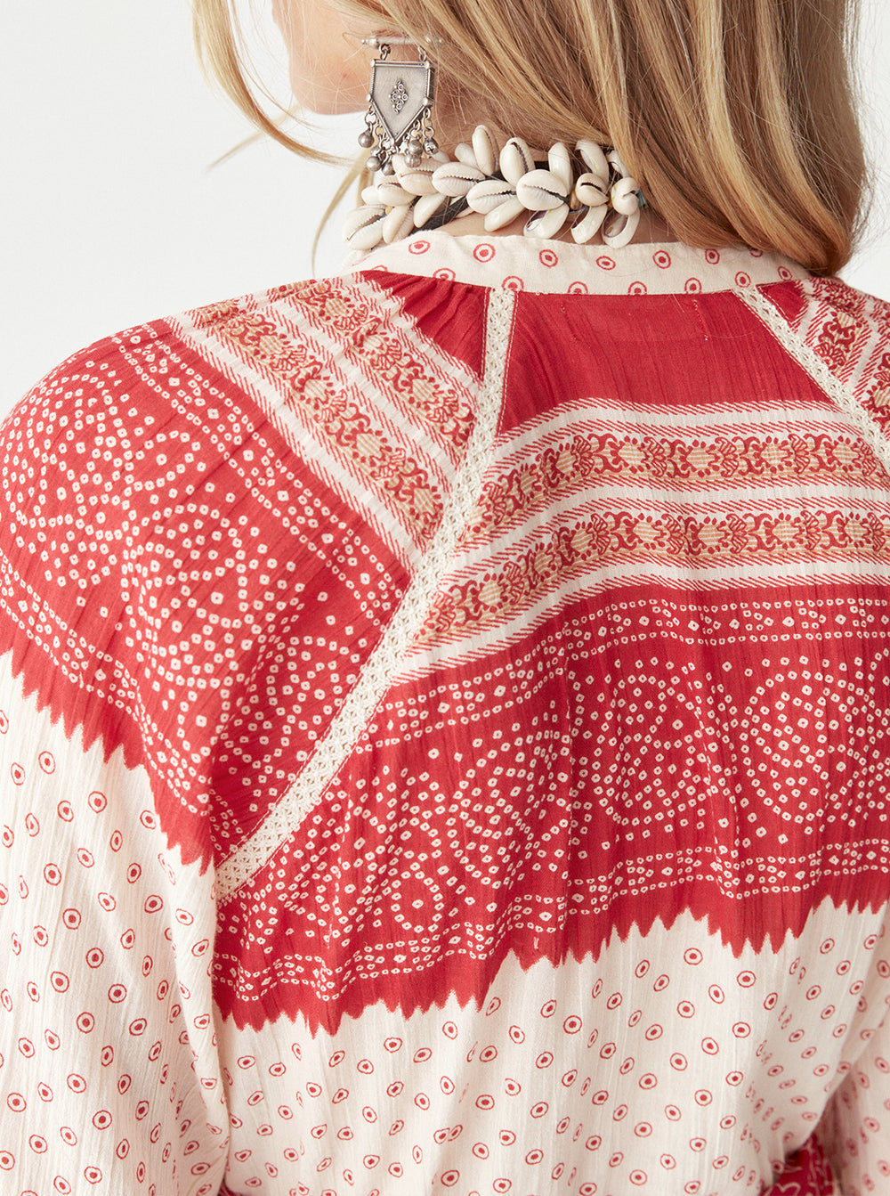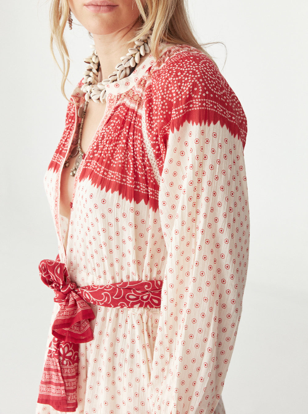 Made from lightweight, textured cotton, it moves with ease while keeping its structure. The geranium red micro-print on a washed cream base gives it a vintage, sun-worn feel—like something picked up in a forgotten boutique, not mass-produced. The bandana yoke and hemline detailing add just the right amount of edge, a nod to Western heritage but with a knowing smirk.