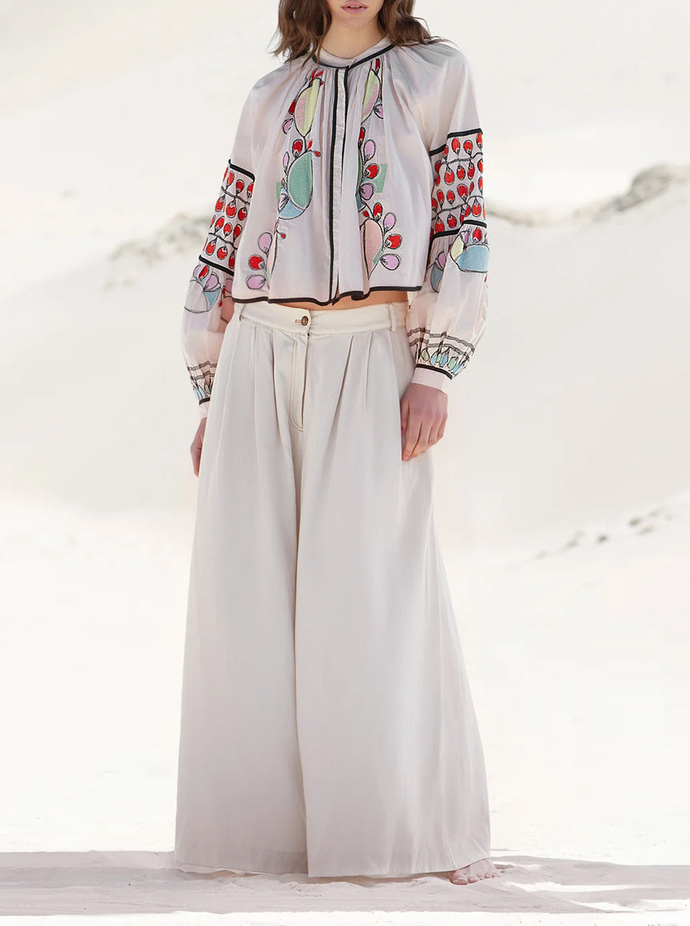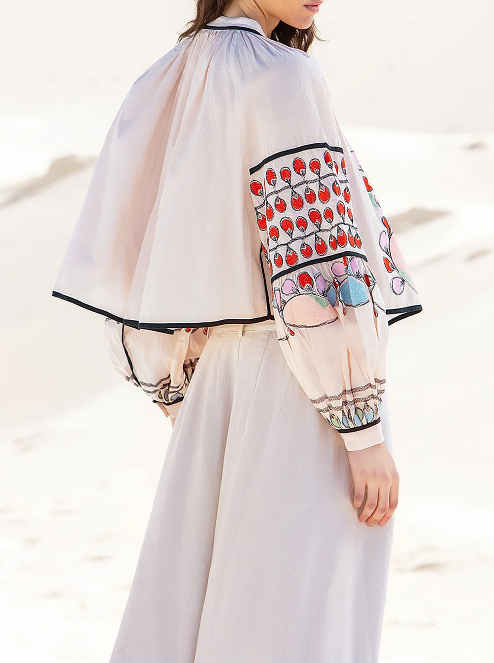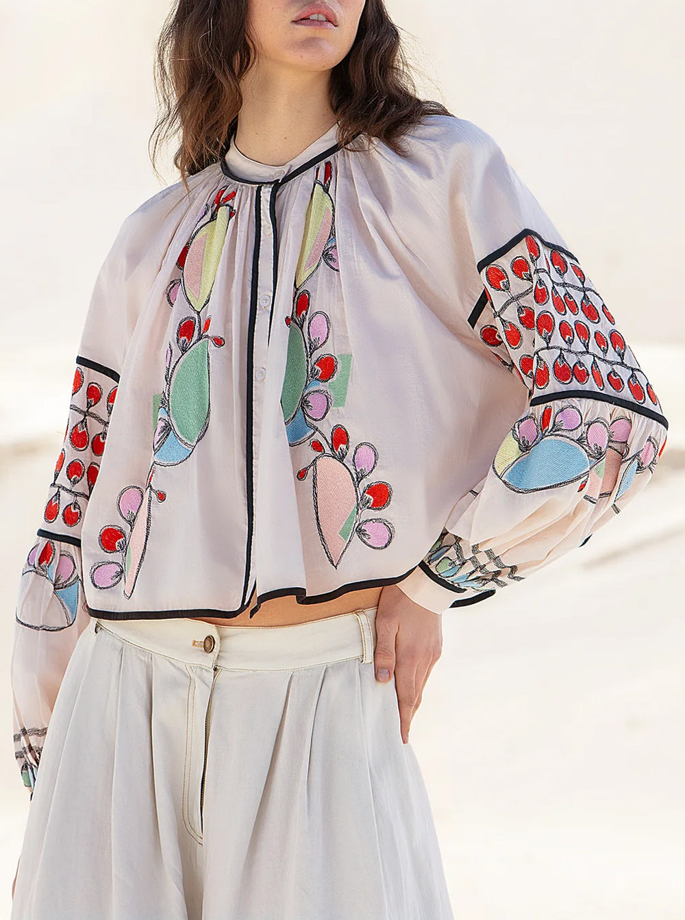 This beige cotton voile blouse, delicately embroidered with colorful and playful motifs, combines lightness and originality. The black piping detail adds a refined contrast, while the slightly puffed sleeves and front buttoning create a feminine and airy silhouette.