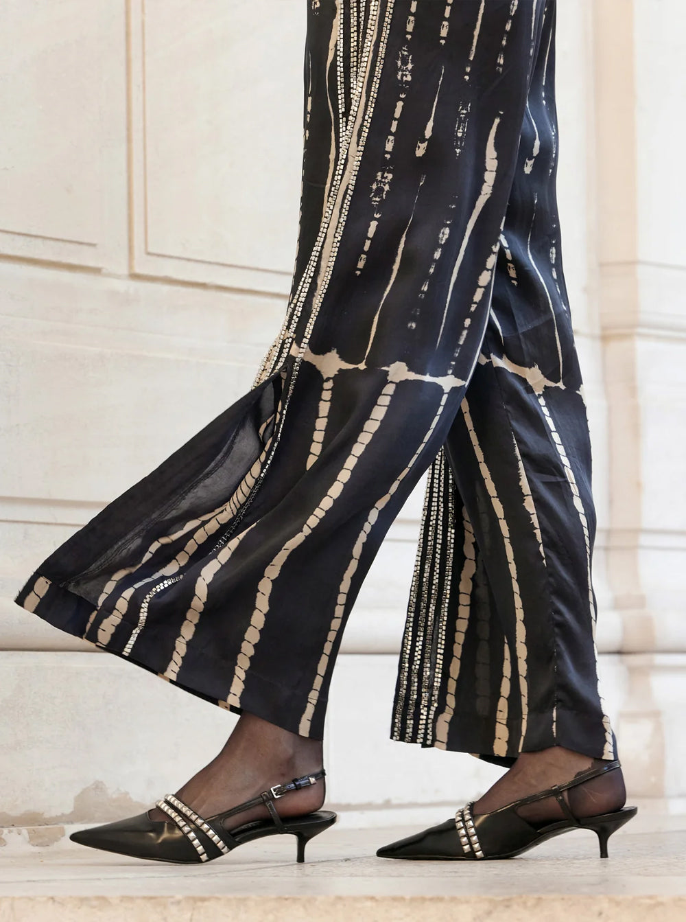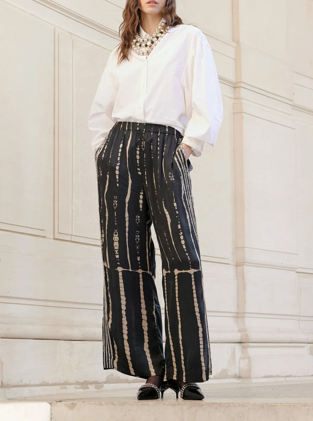 Add a bohemian and sophisticated touch to your wardrobe with these tie-dye viscose pants in elegant shades of black and beige.