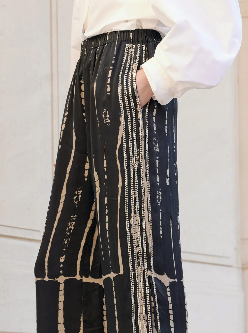 Side pockets add practicality, while decorative silver jewelry bands run along each side of the pants, bringing a touch of refinement and subtle sparkle.