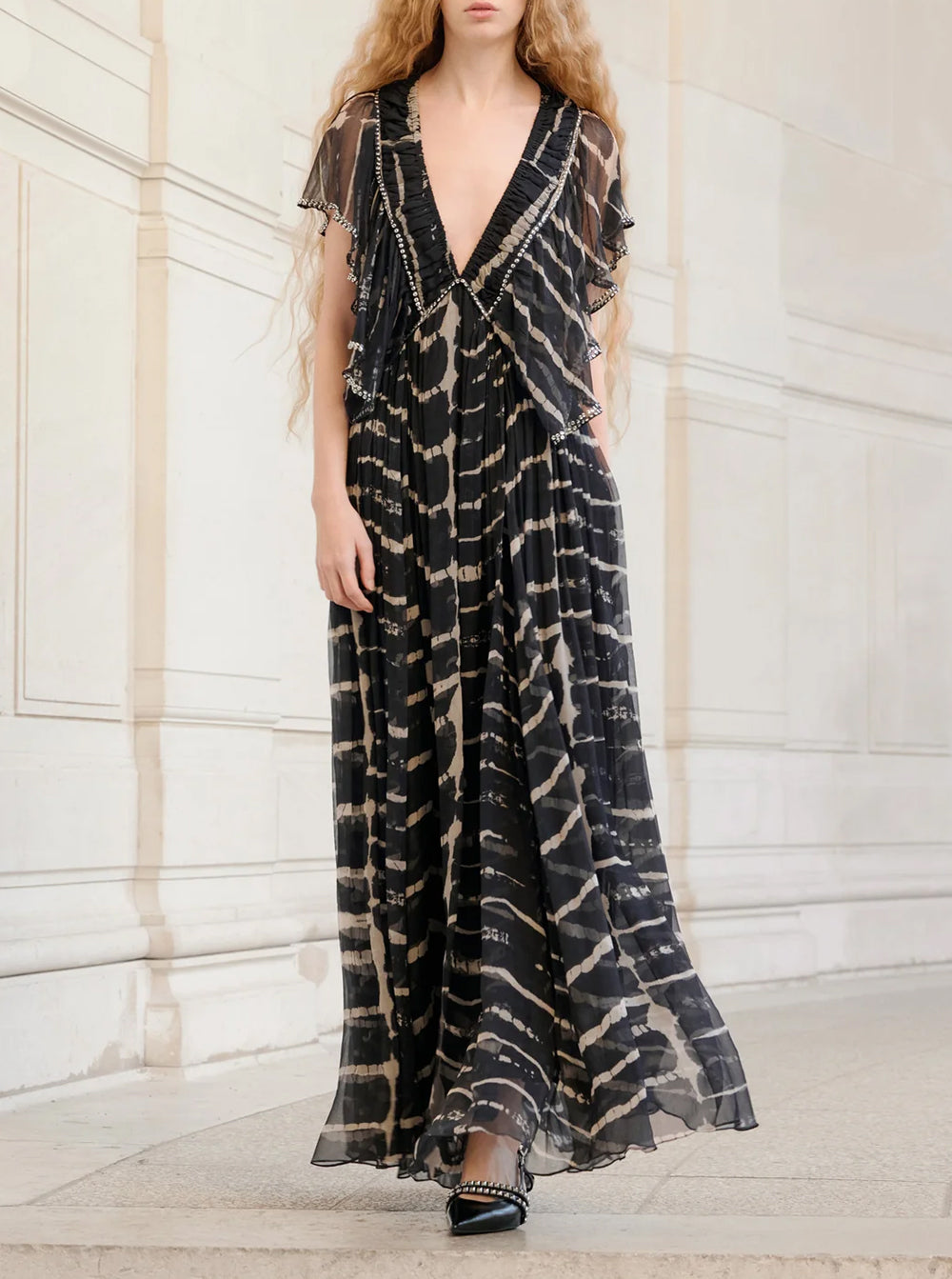 Let yourself be captivated by the enchanting elegance of this long dress in chiffon and satin viscose, adorned with a sophisticated tie-dye print in shades of black and beige.