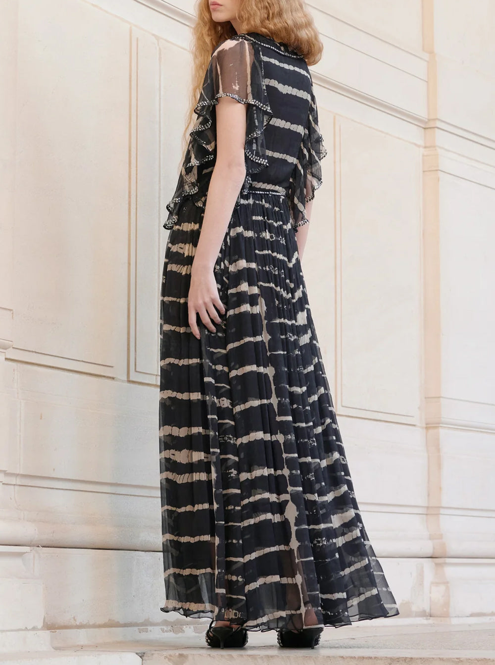 The micro chiffon sleeves, accented with transparent ruffles, add lightness and romance, while the V-neckline, embellished with delicate silver jewelry, brings a subtle touch of glamour.