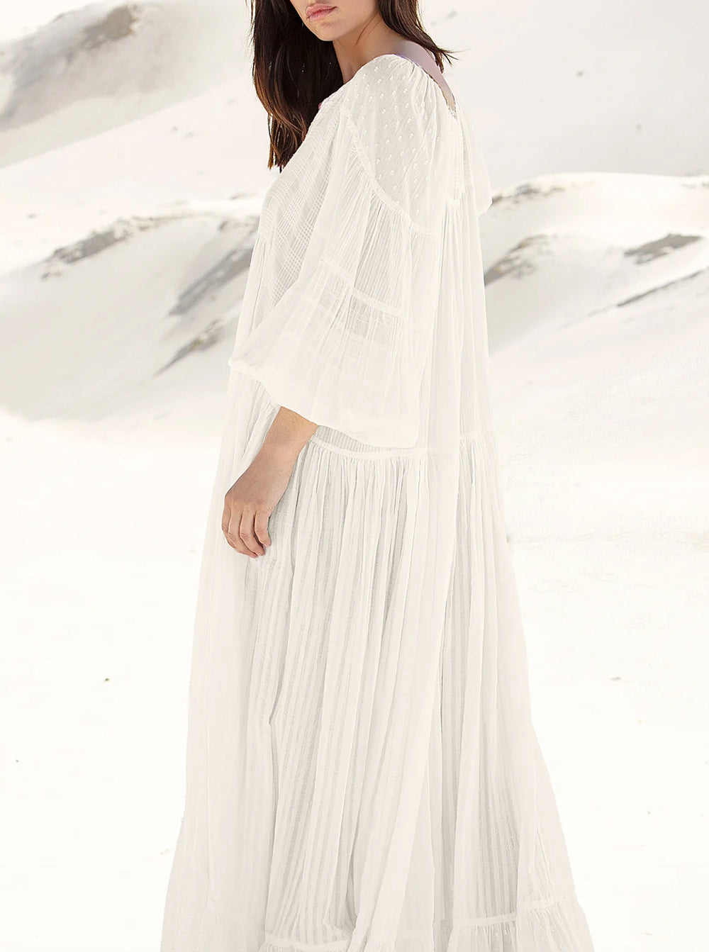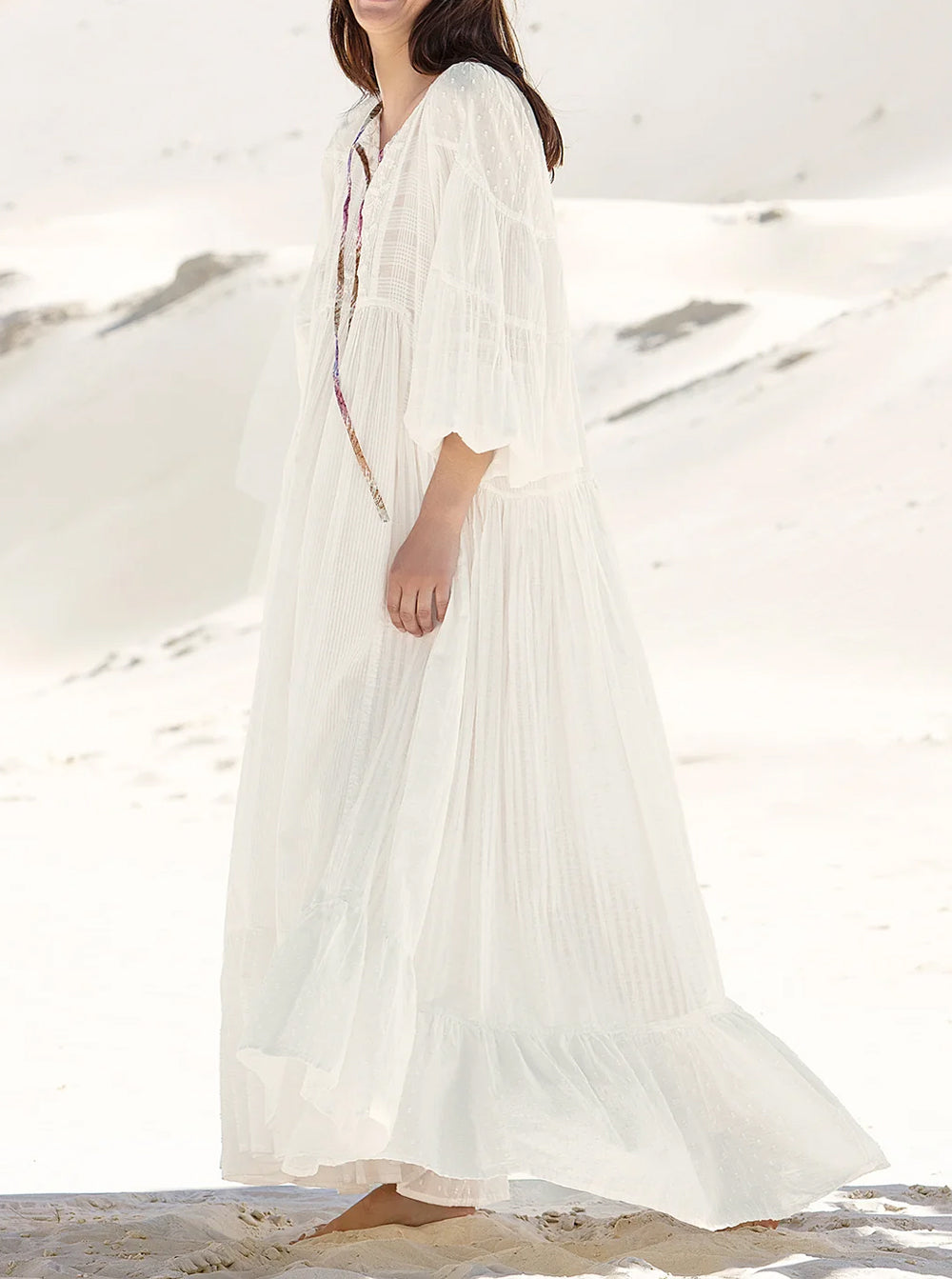 A long white woven cotton dress, delicately textured with checks and polka dots for a subtly sophisticated look.